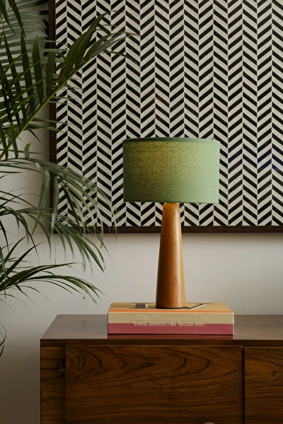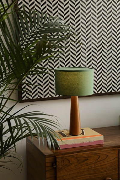 Observação: As fotos mostram a versão com cúpula em linho no tom sálvia, mas o abajur também pode ser feito em linho cru ou outras variações de tecido e cor, mediante consulta.