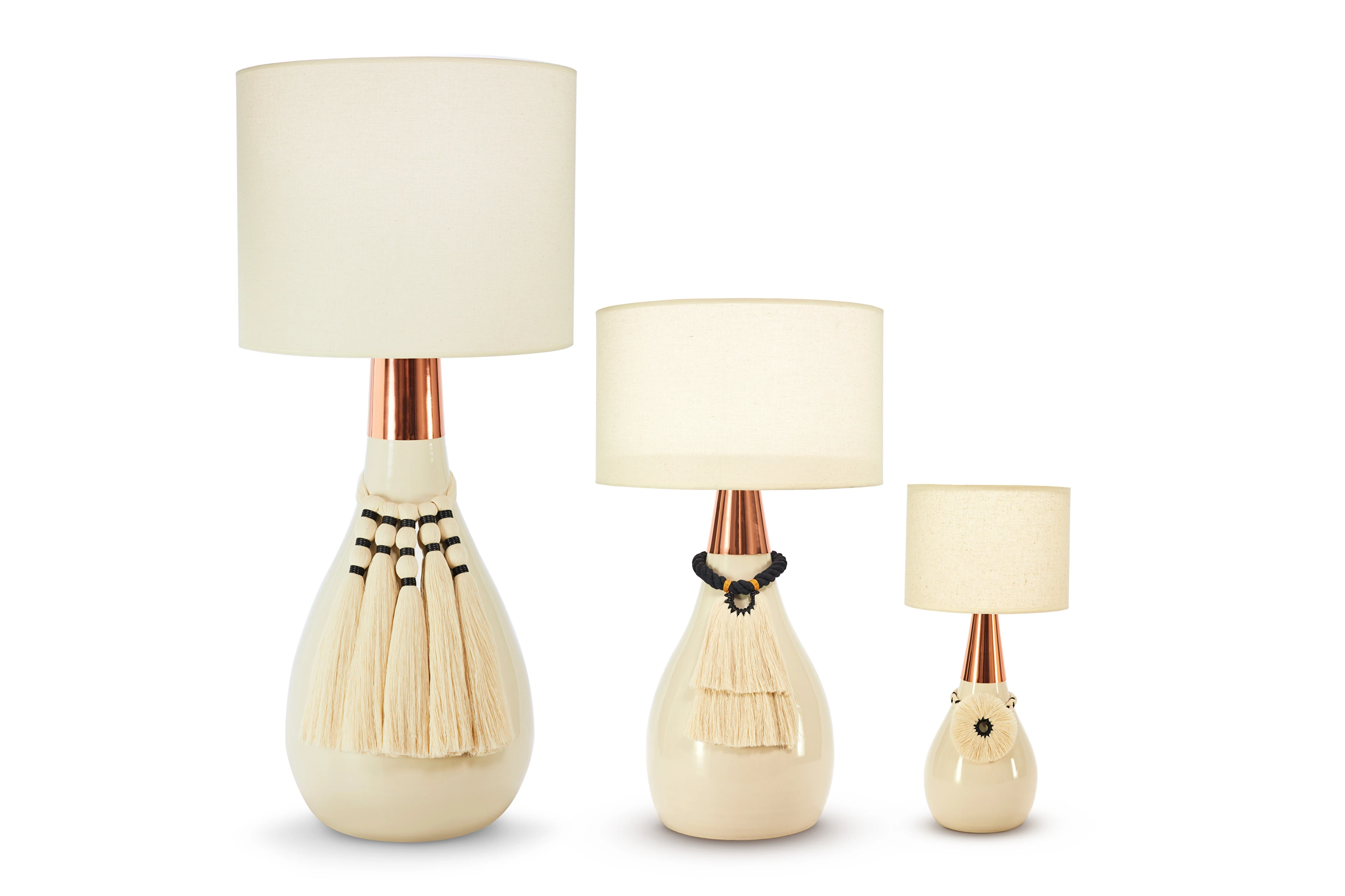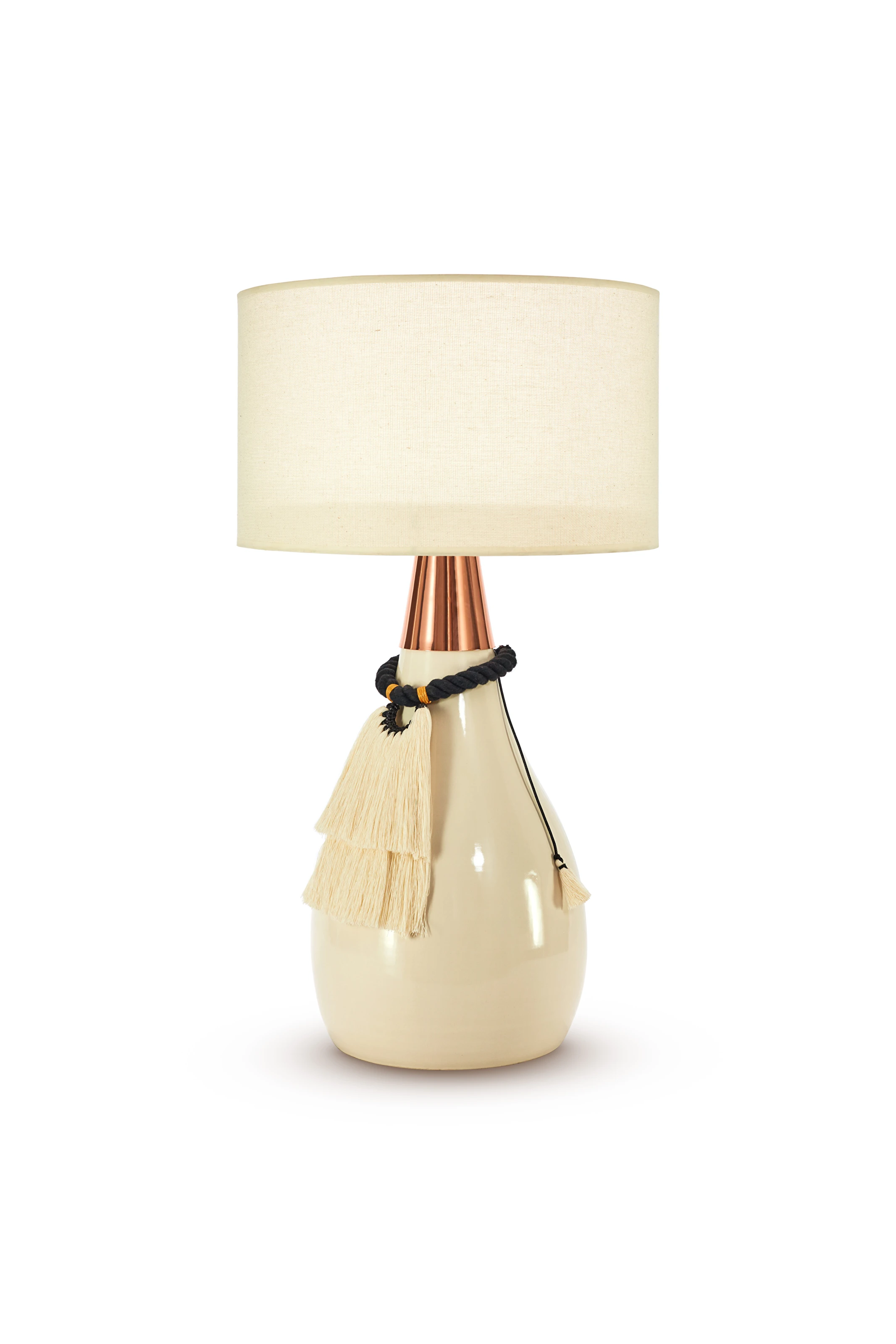 Abajur feito a mão em cerâmica com peça em cobre e colar feito artesanalmente no México em algodão cru.