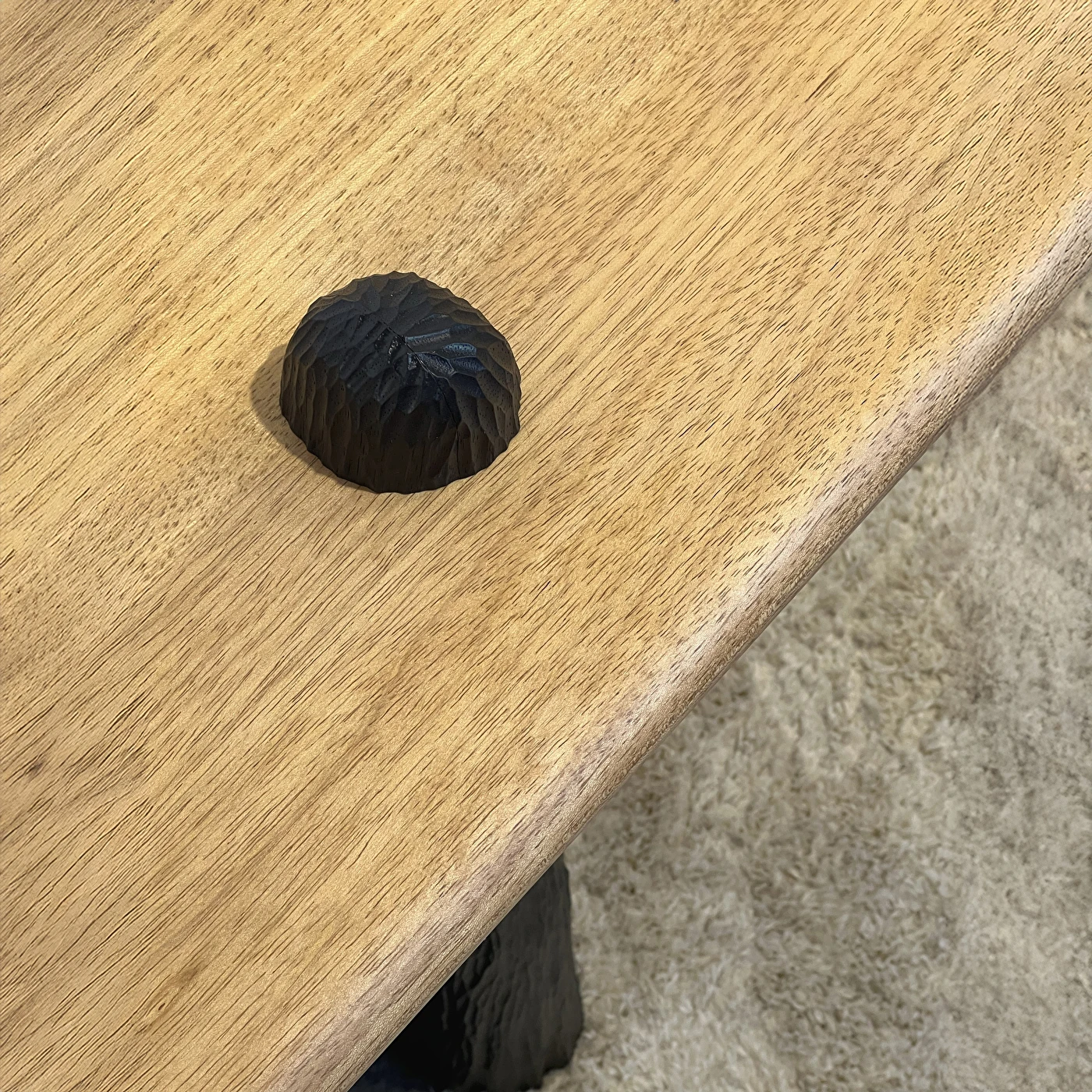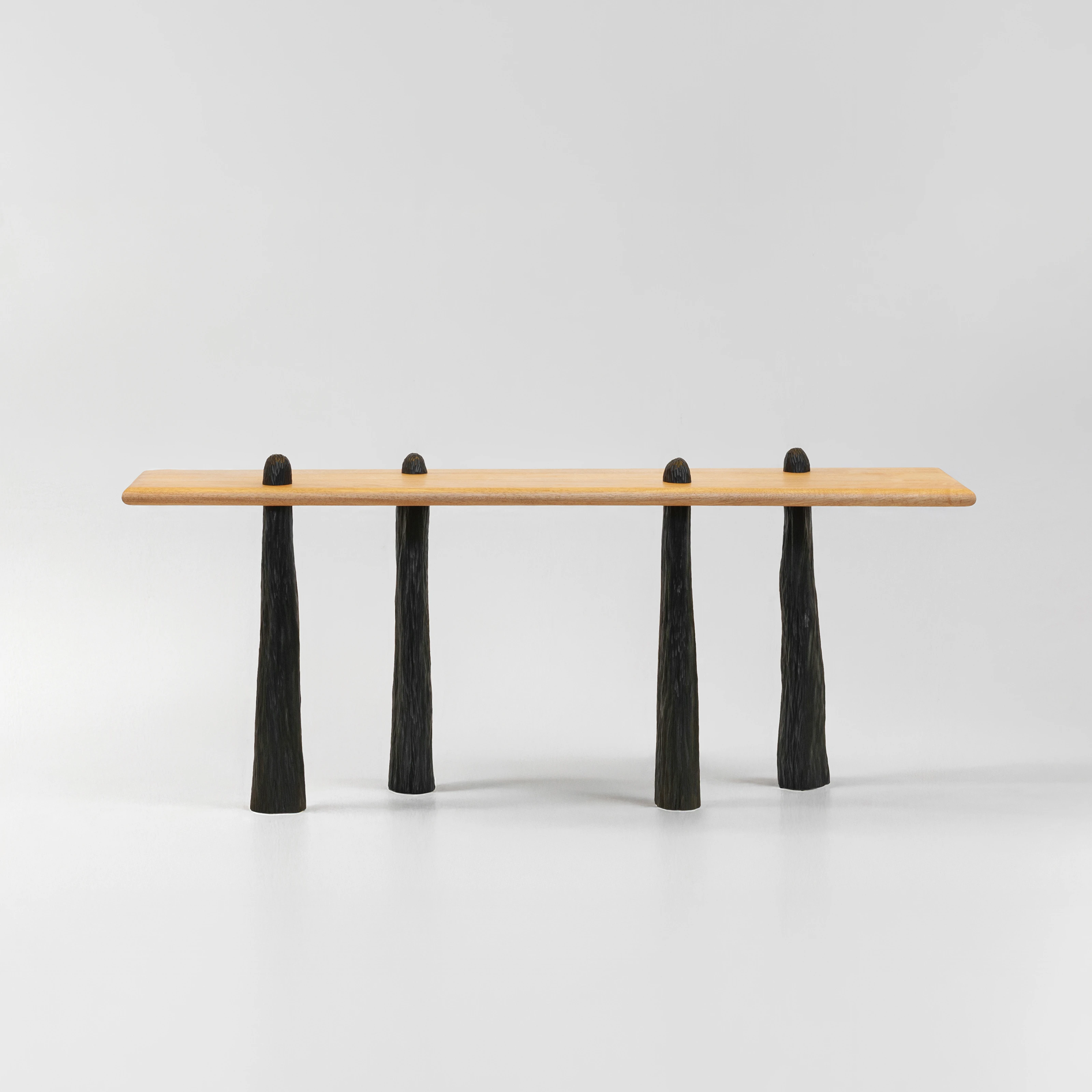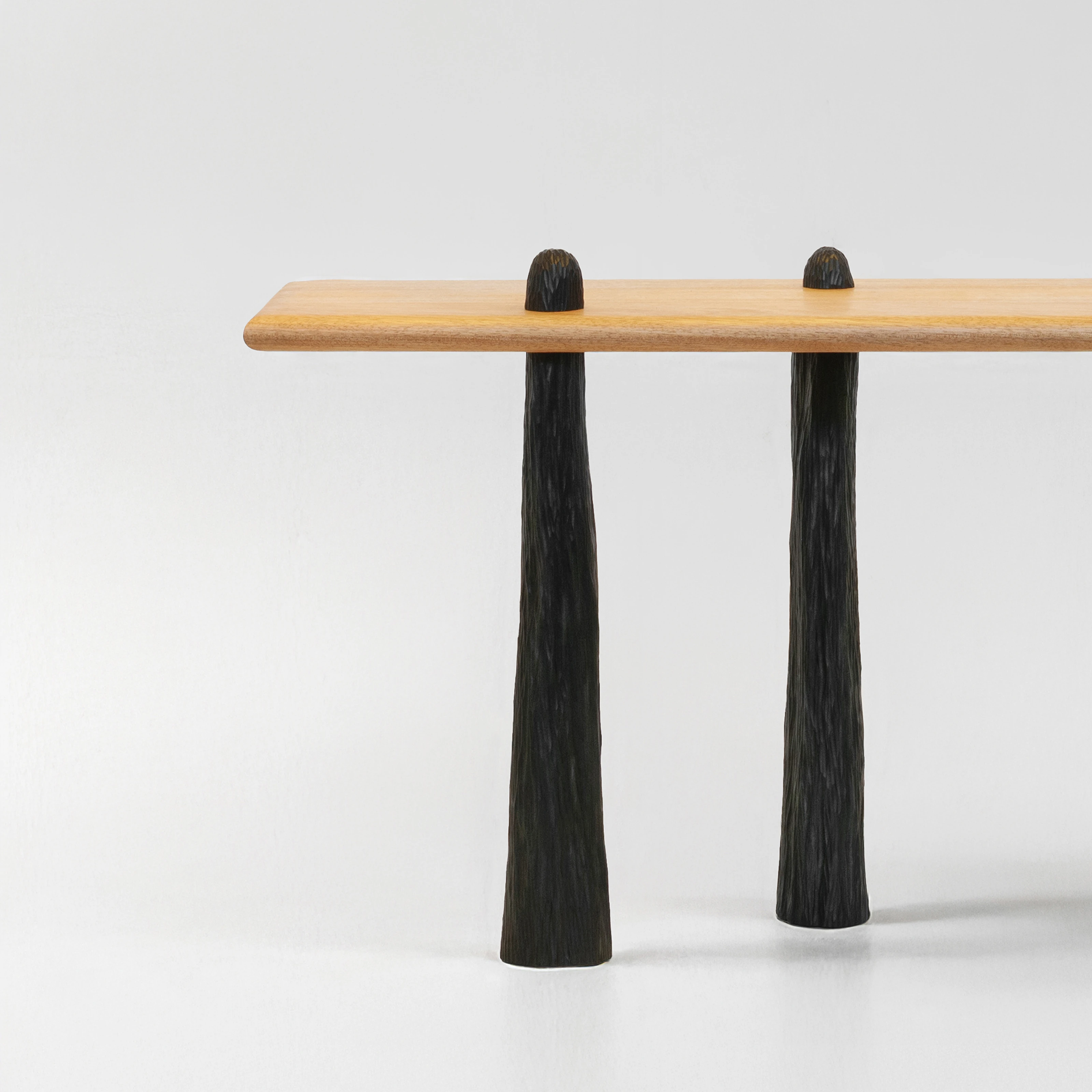 Móvel esculpido em Tauari e que apresenta texturas entalhadas à mão. O acabamento do tampo é feito em danish oil, e os pés são ebanizados. Toda a matéria prima utilizada pelo Estúdio Carmine é adquirida apenas com fornecedores que possuem o Documento de Origem Florestal (DOF). Assim, é possível garantir que a madeira provenha de áreas manejadas de forma sustentável, com foco na preservação da biodiversidade e na regeneração da vegetação, além de demonstrar respeito e valorização pela madeira nativa brasileira.