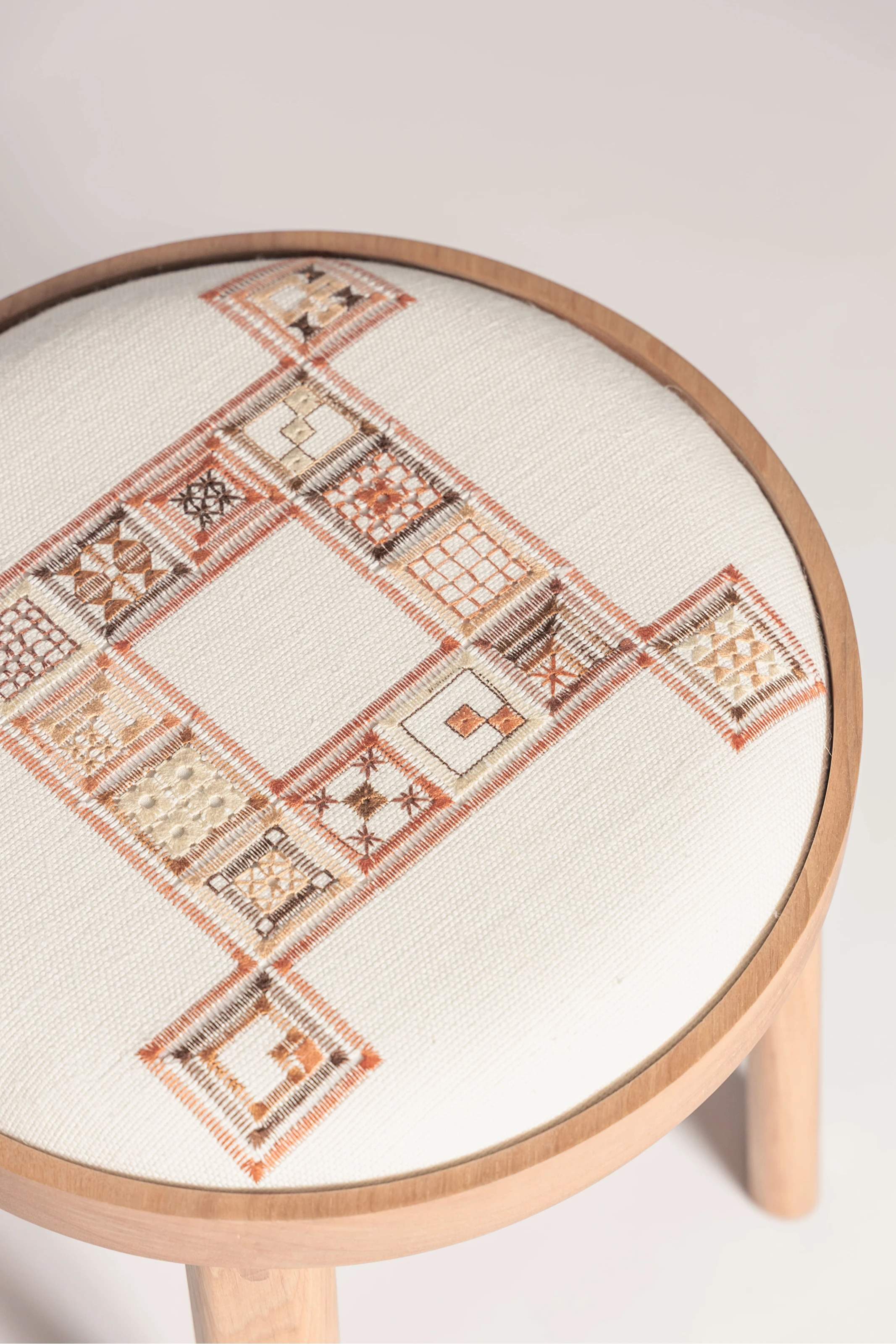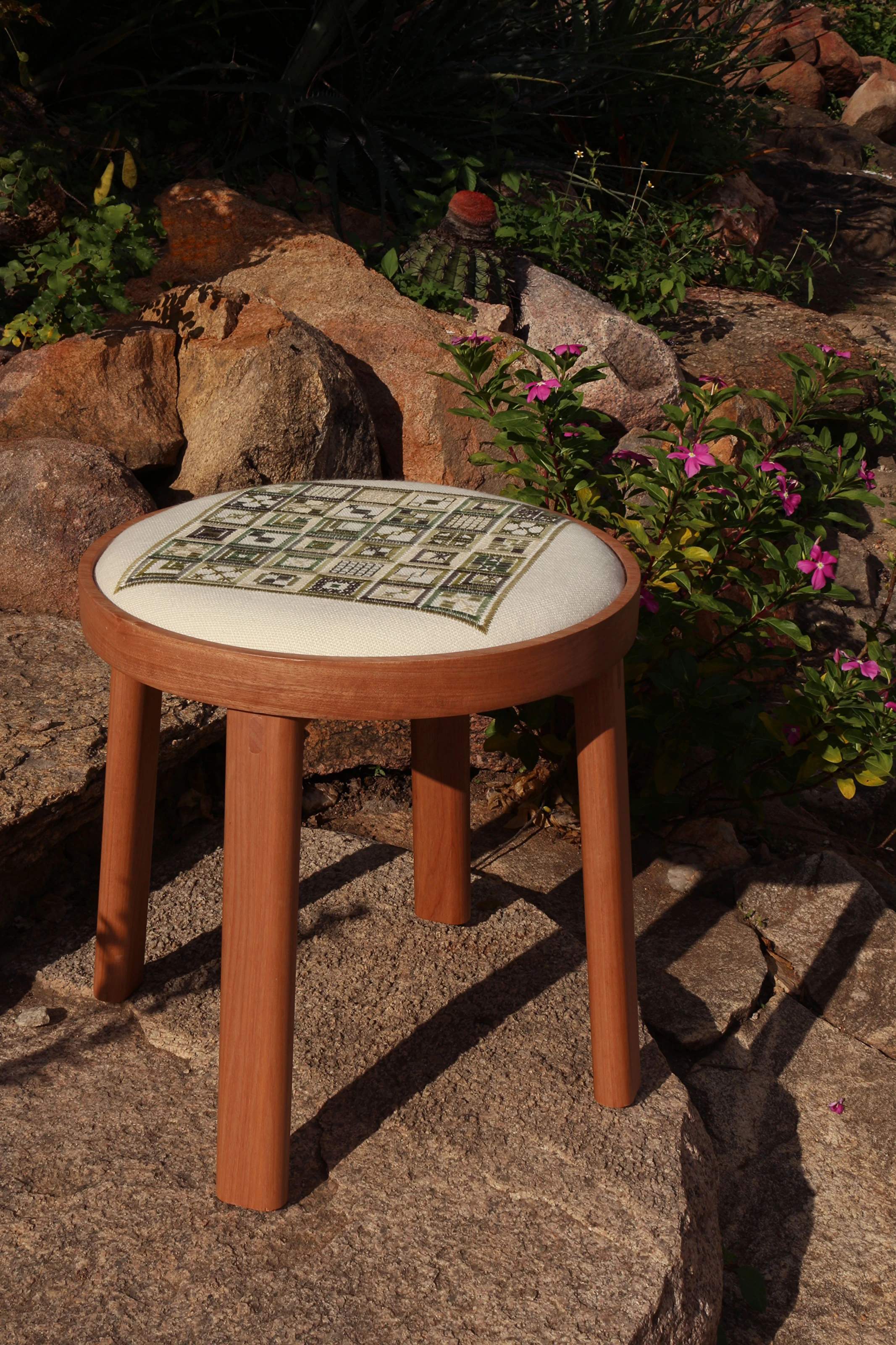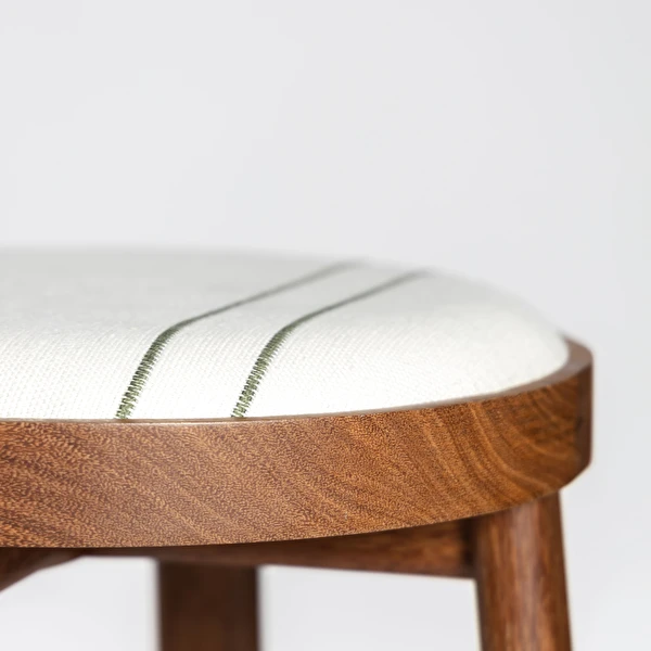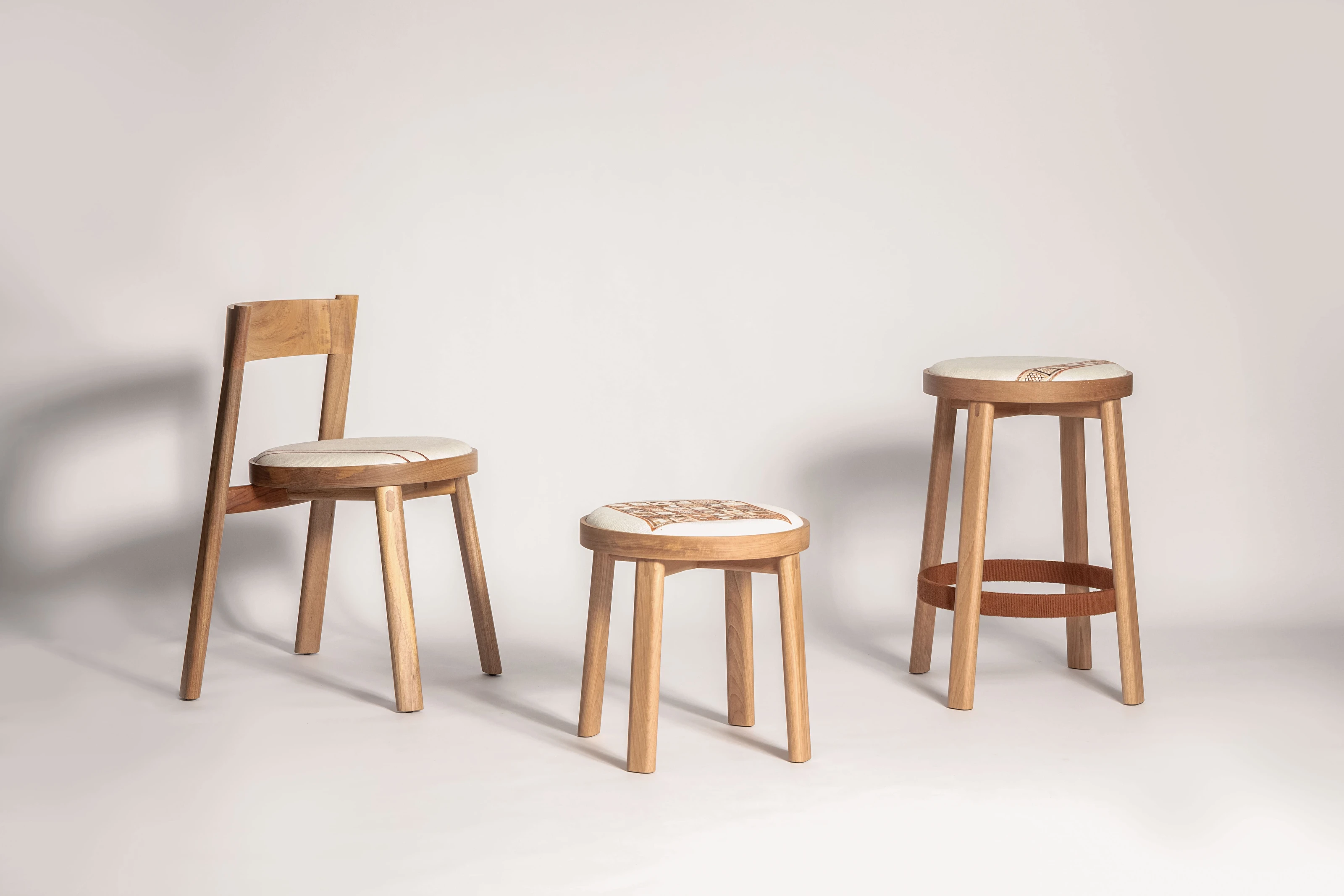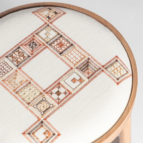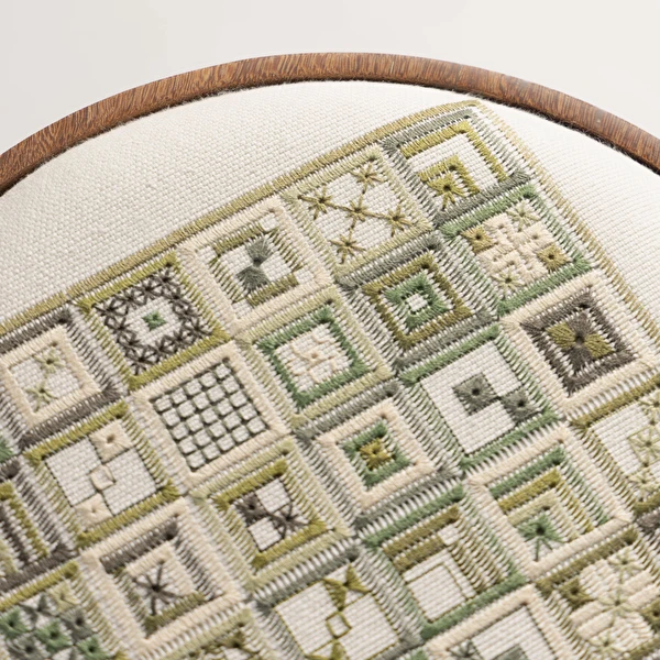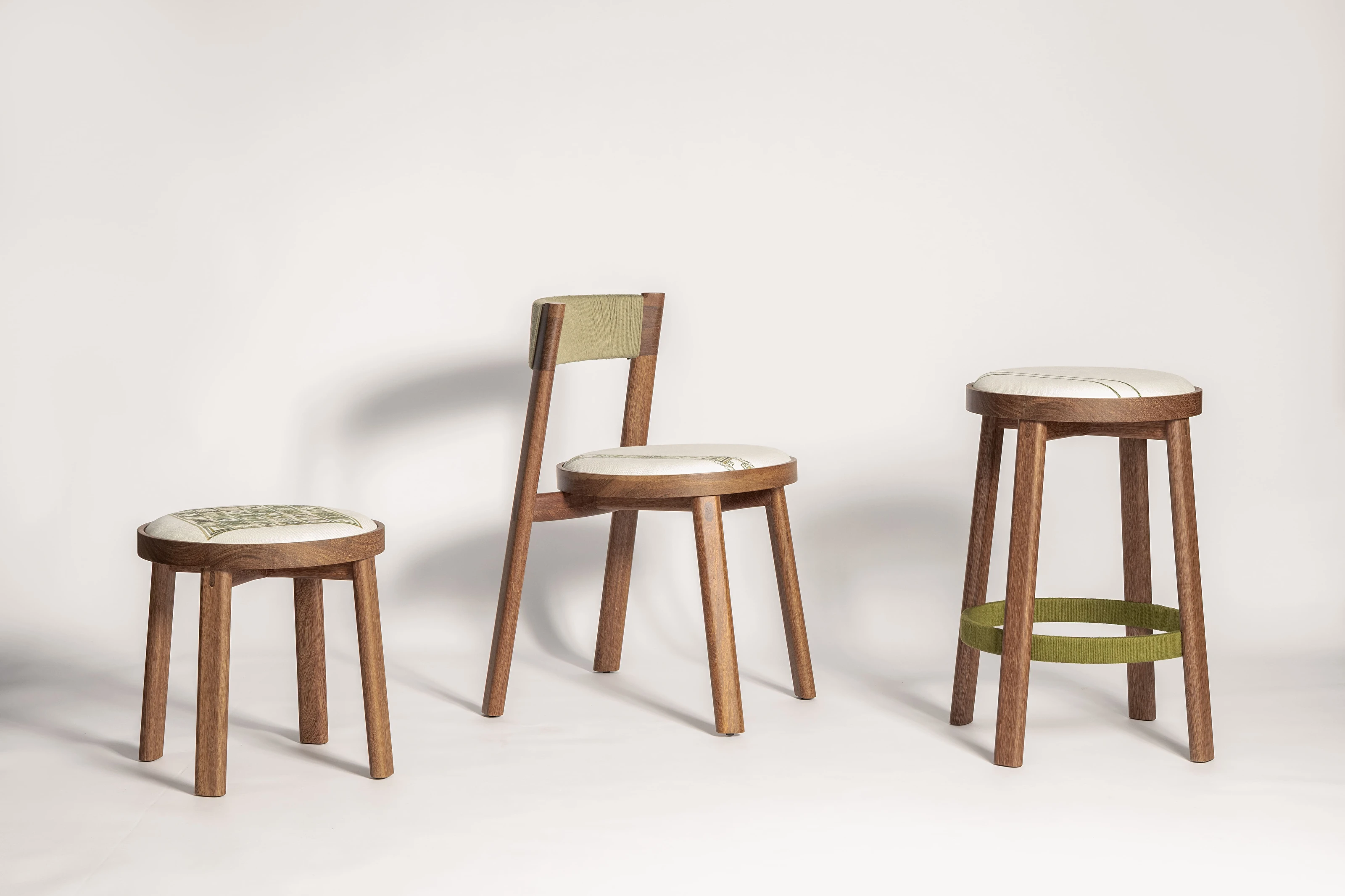 A Linha Bordado, composta por cadeira, banqueta e banco, evoca elementos do bordado, como o bastidor e o novelo.