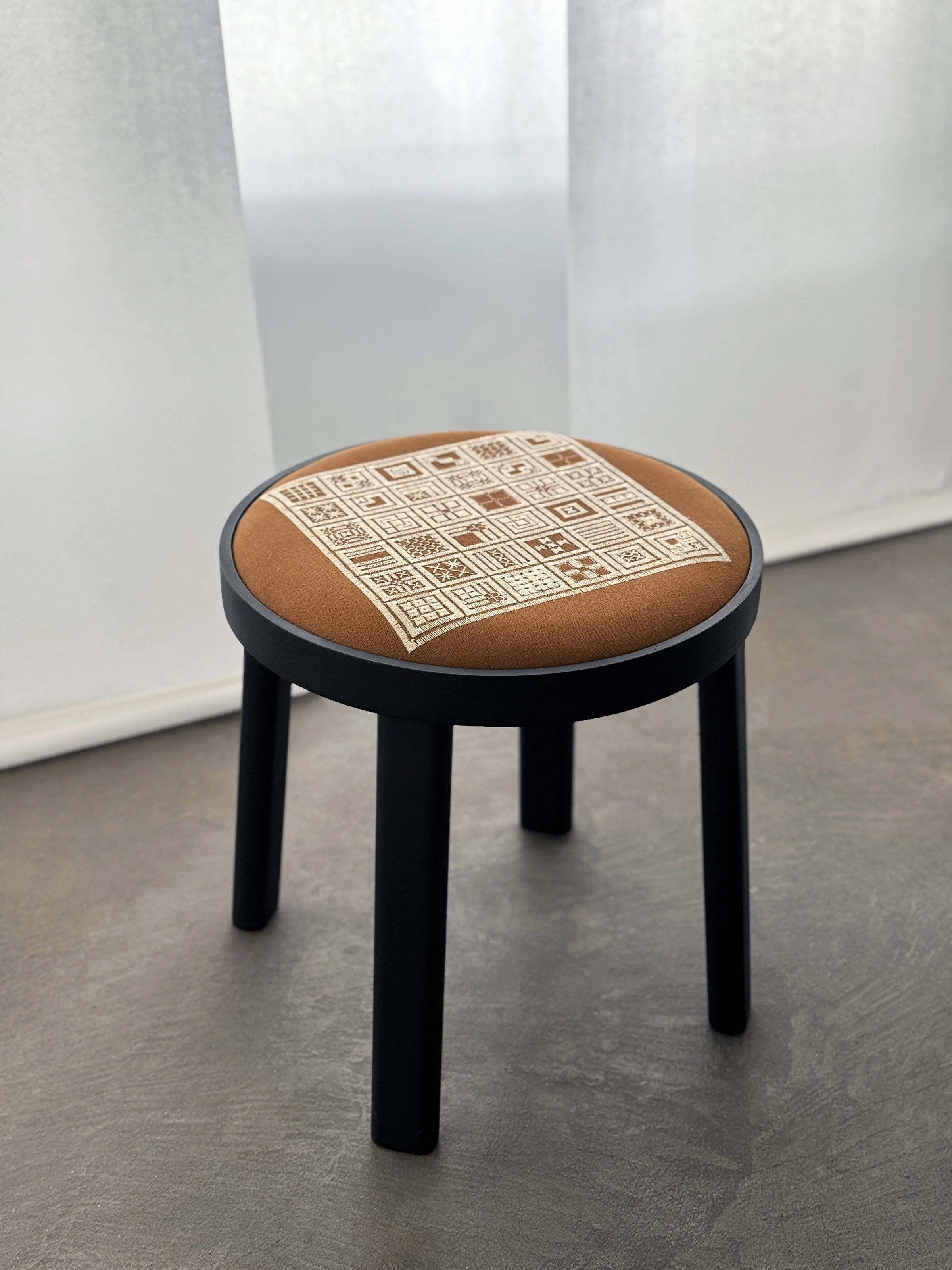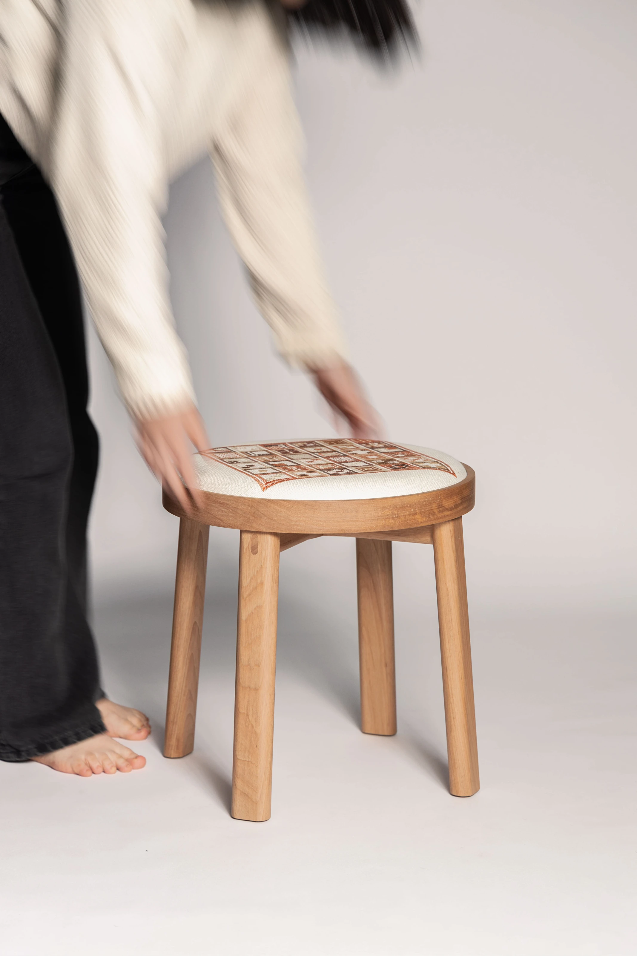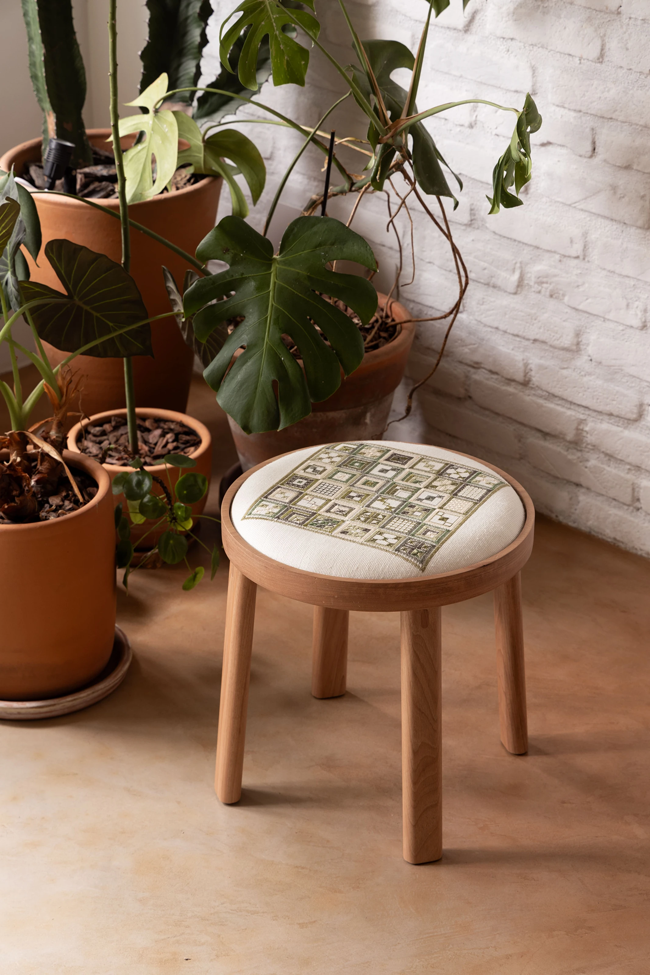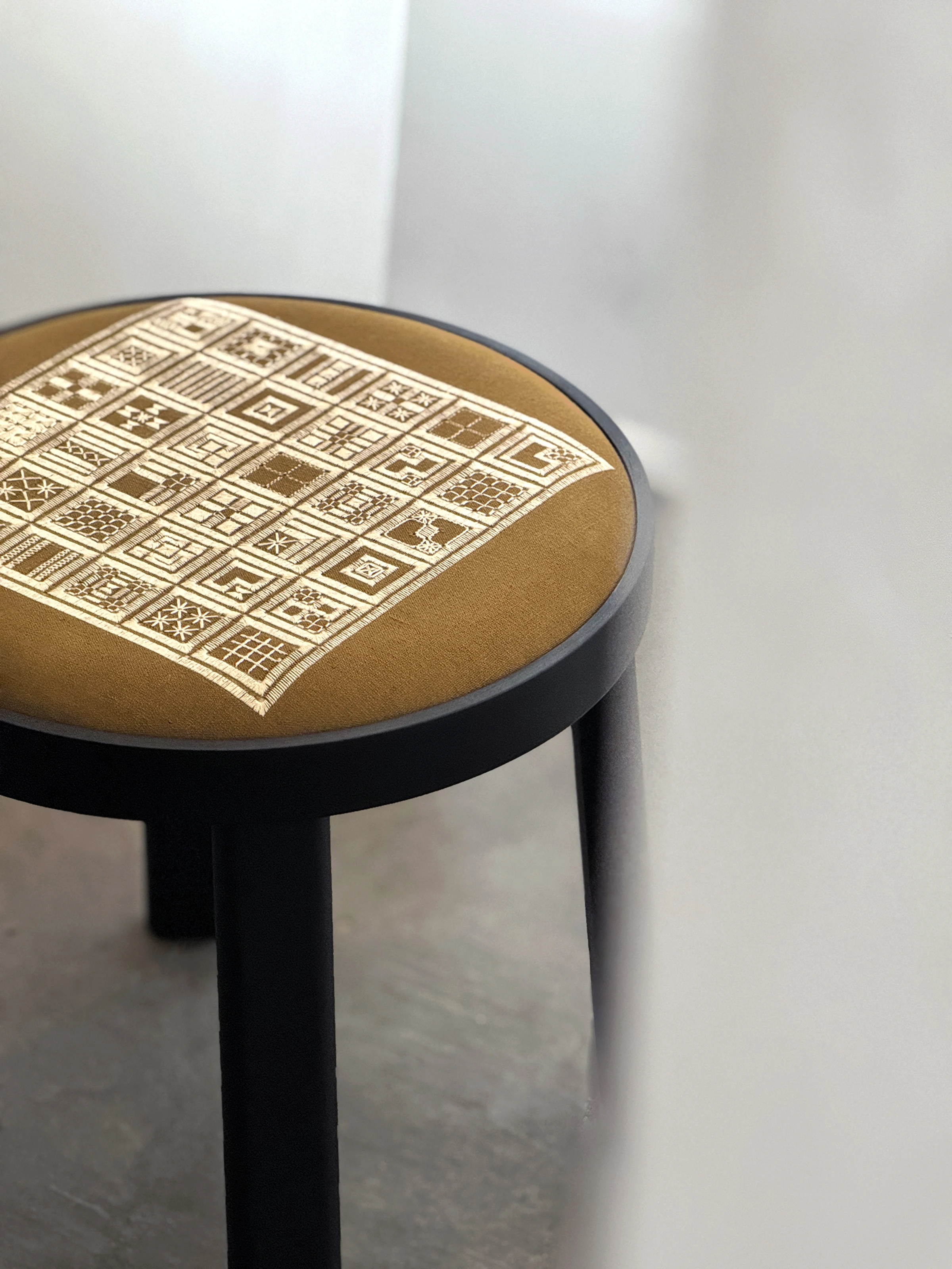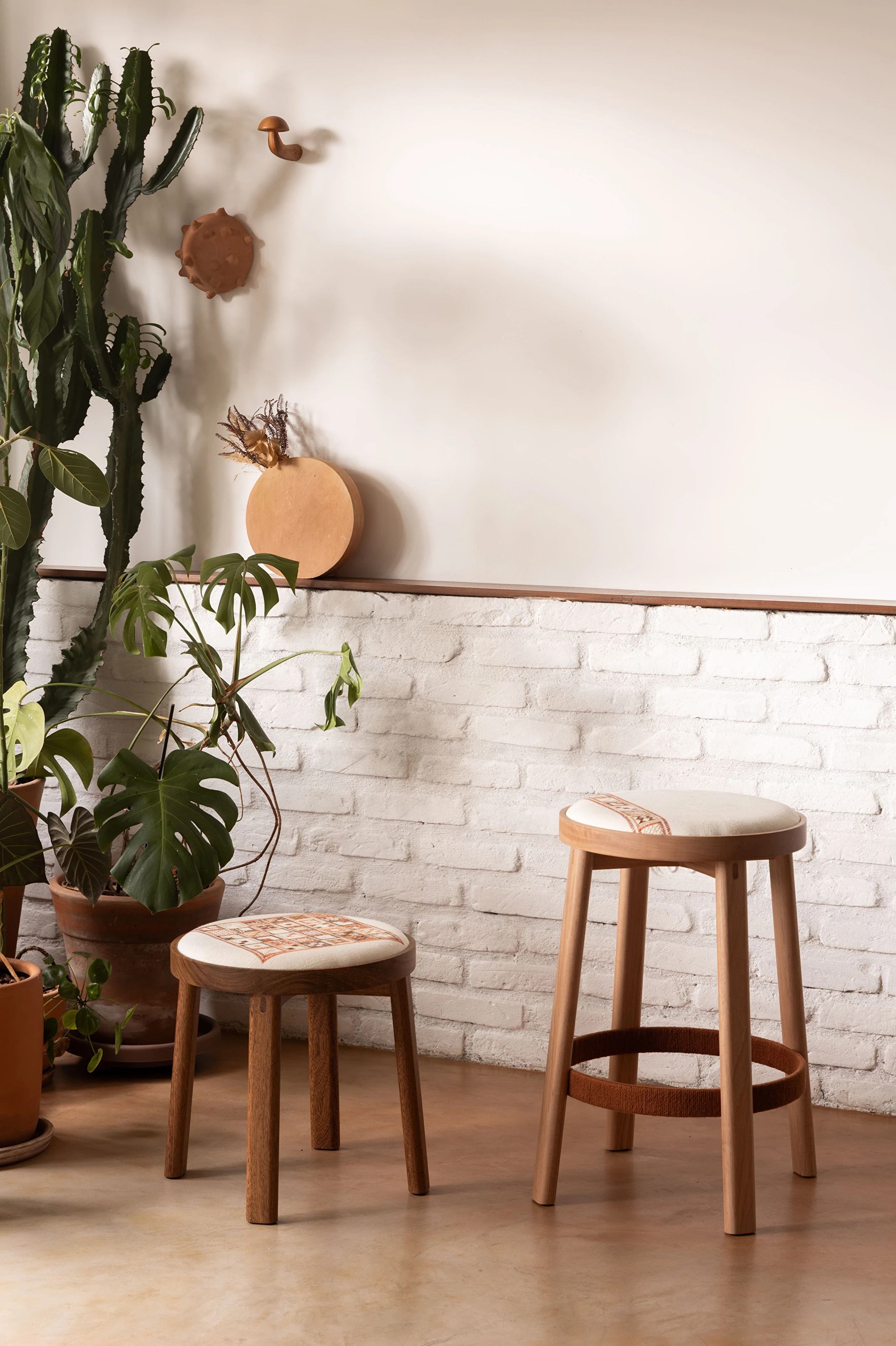 A Linha Bordado, composta por cadeira, banqueta e banco, evoca elementos do bordado, como o bastidor e o novelo.