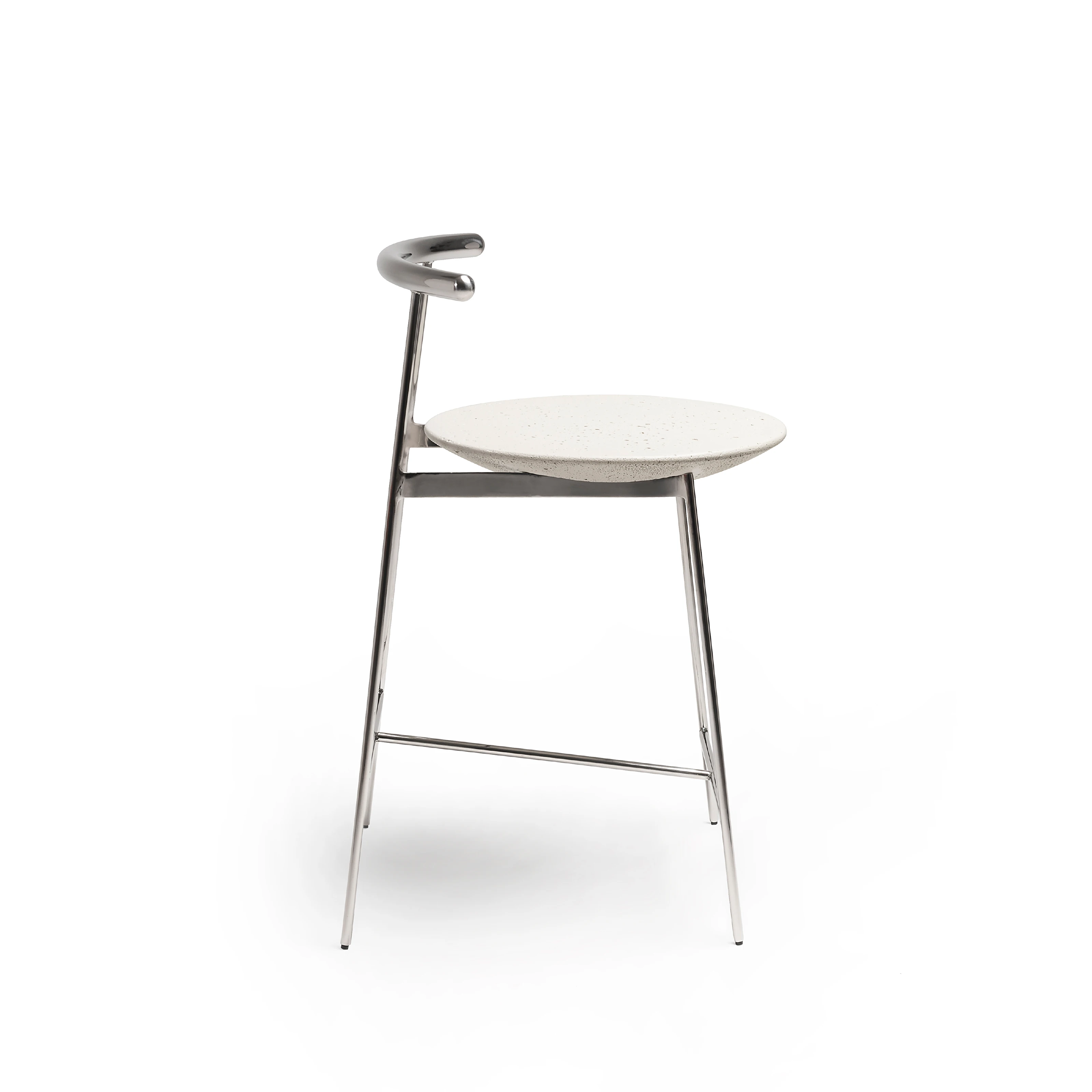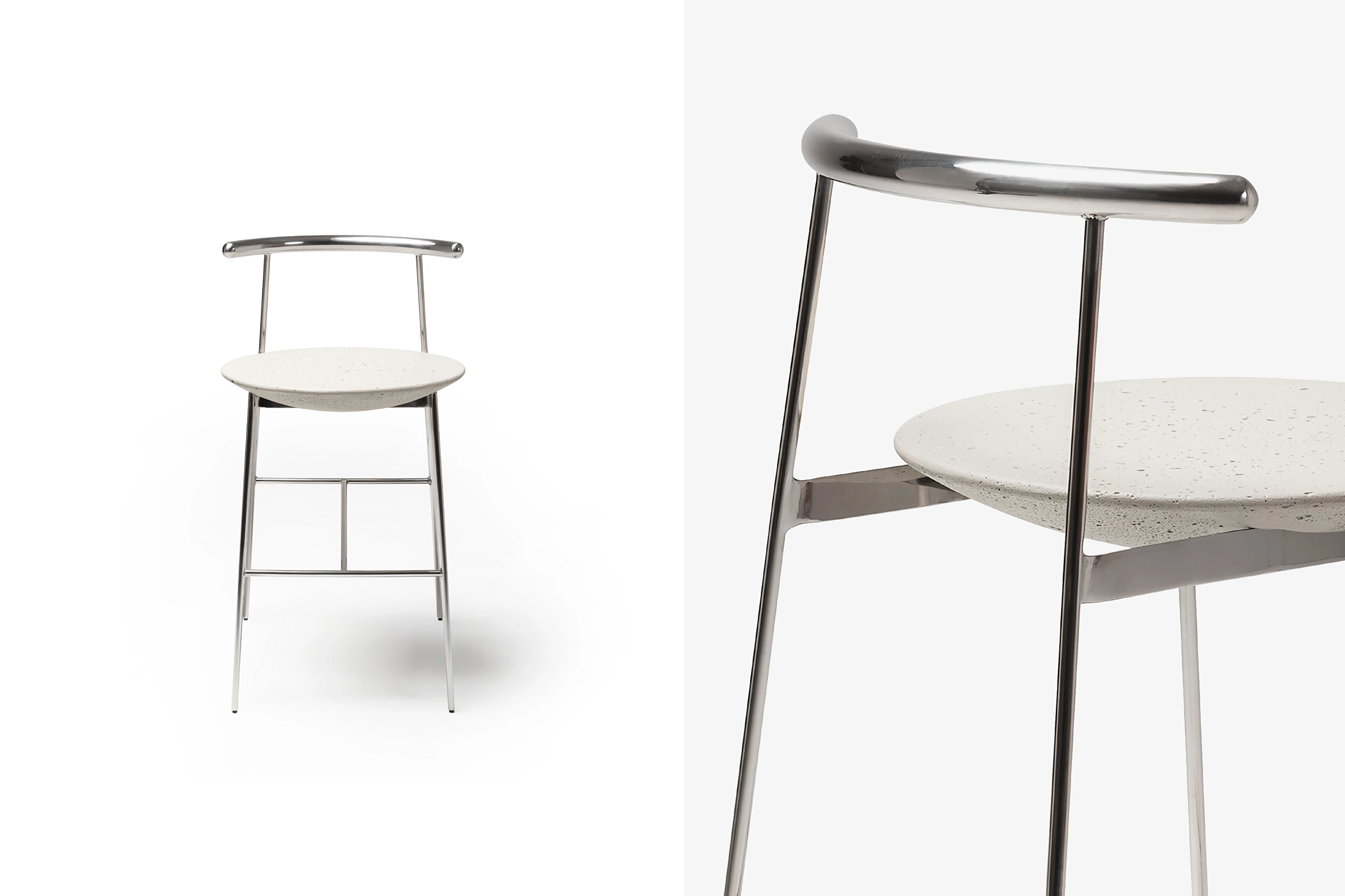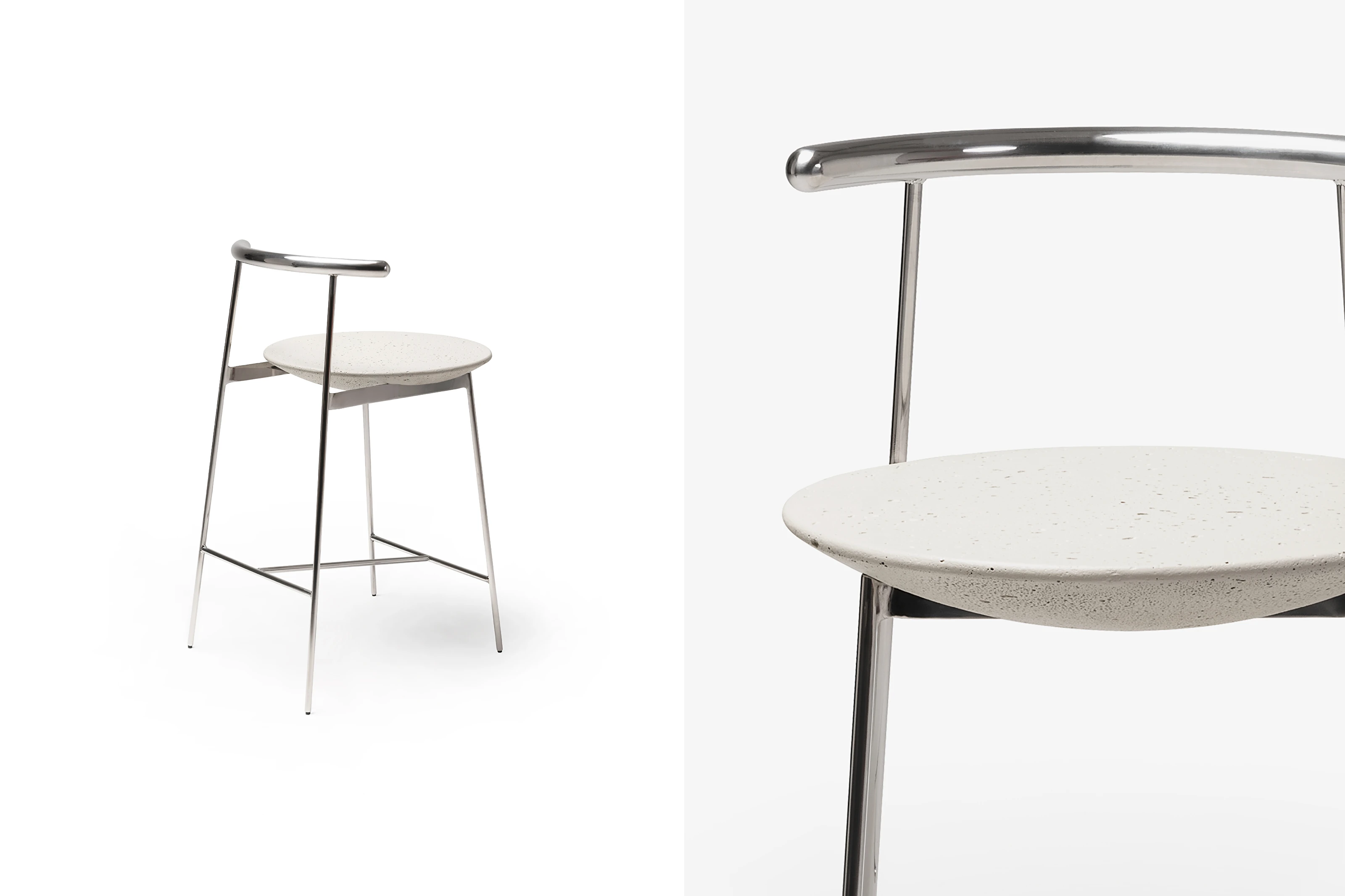 Banqueta baixa com estrutura e encosto em aço inoxidável polido e assento em concreto pintado. Por se tratar de um produto com materiais naturais há variações de cor e textura mesmo em peças do mesmo lote. Isso compõe o perfil do produto e garante sua exclusividade.