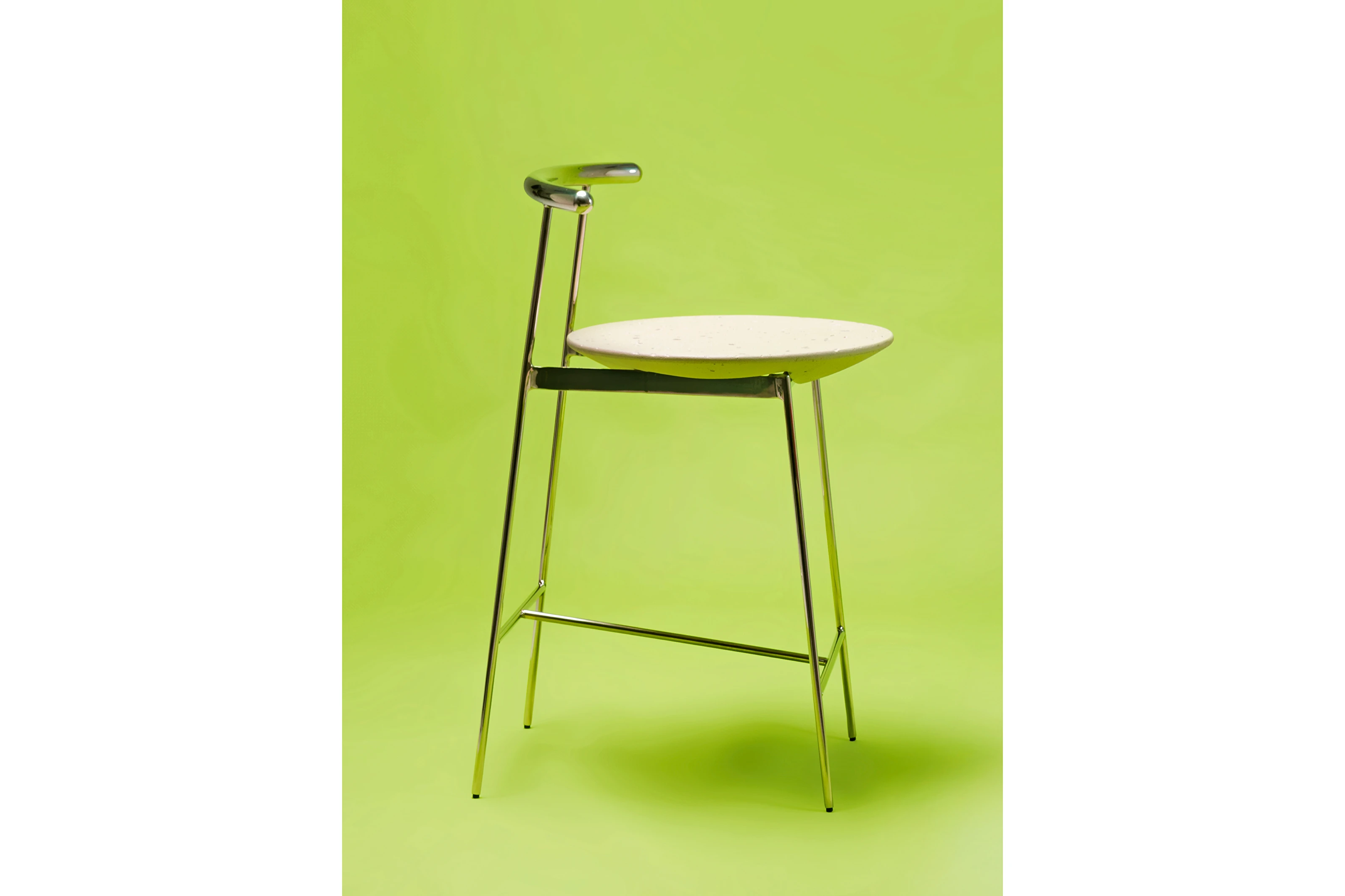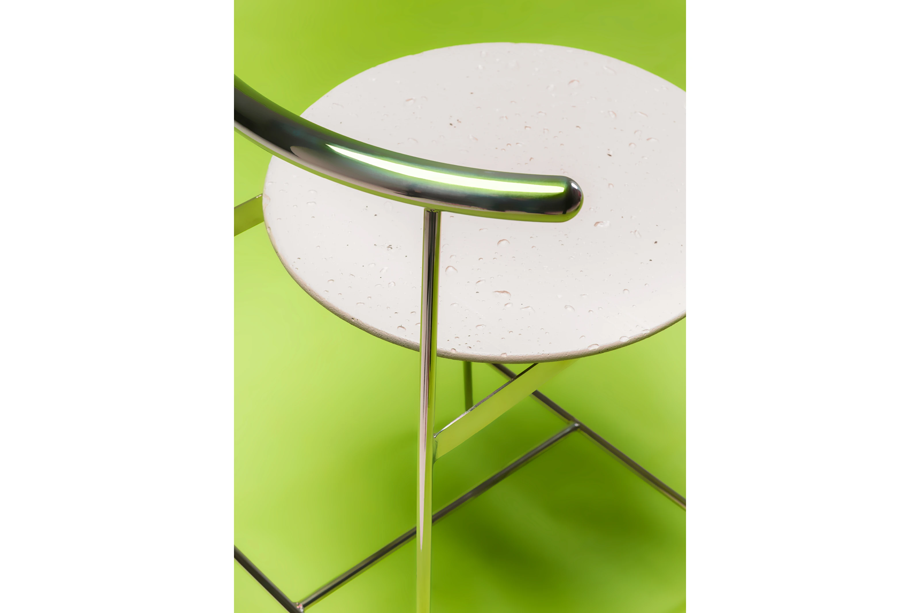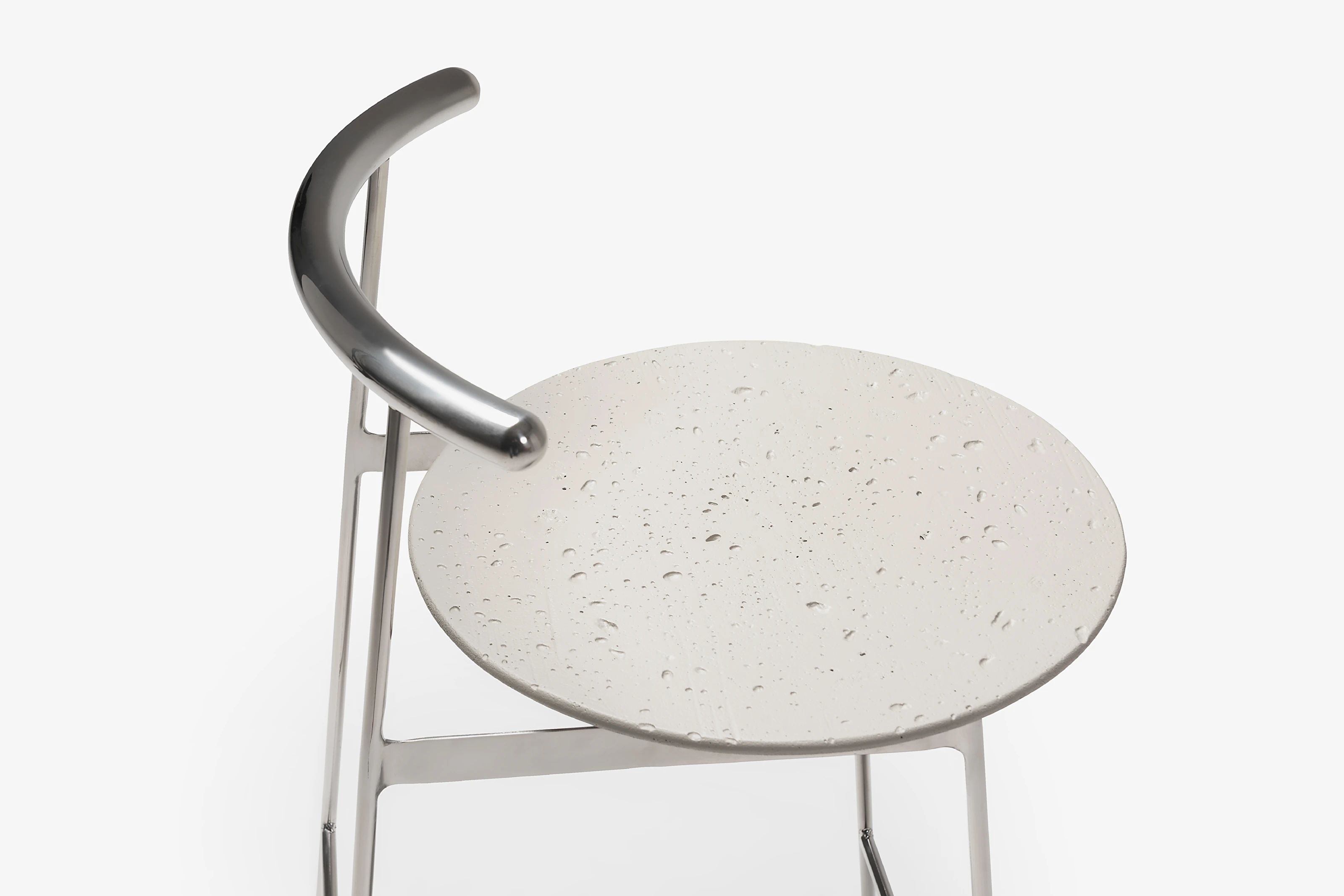 Banqueta baixa com estrutura e encosto em aço inoxidável polido e assento em concreto pintado. Por se tratar de um produto com materiais naturais há variações de cor e textura mesmo em peças do mesmo lote. Isso compõe o perfil do produto e garante sua exclusividade.