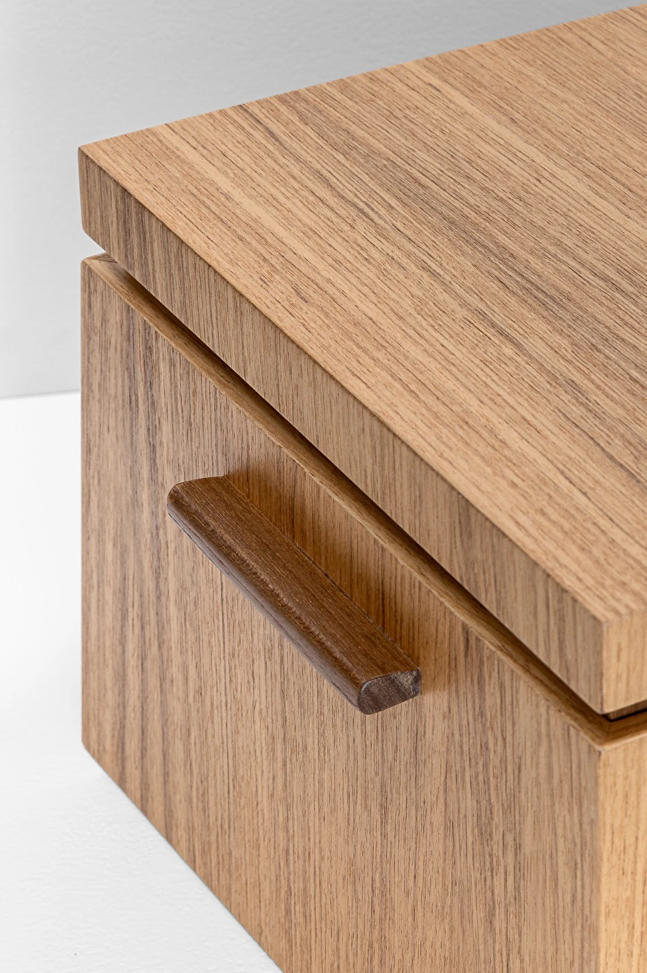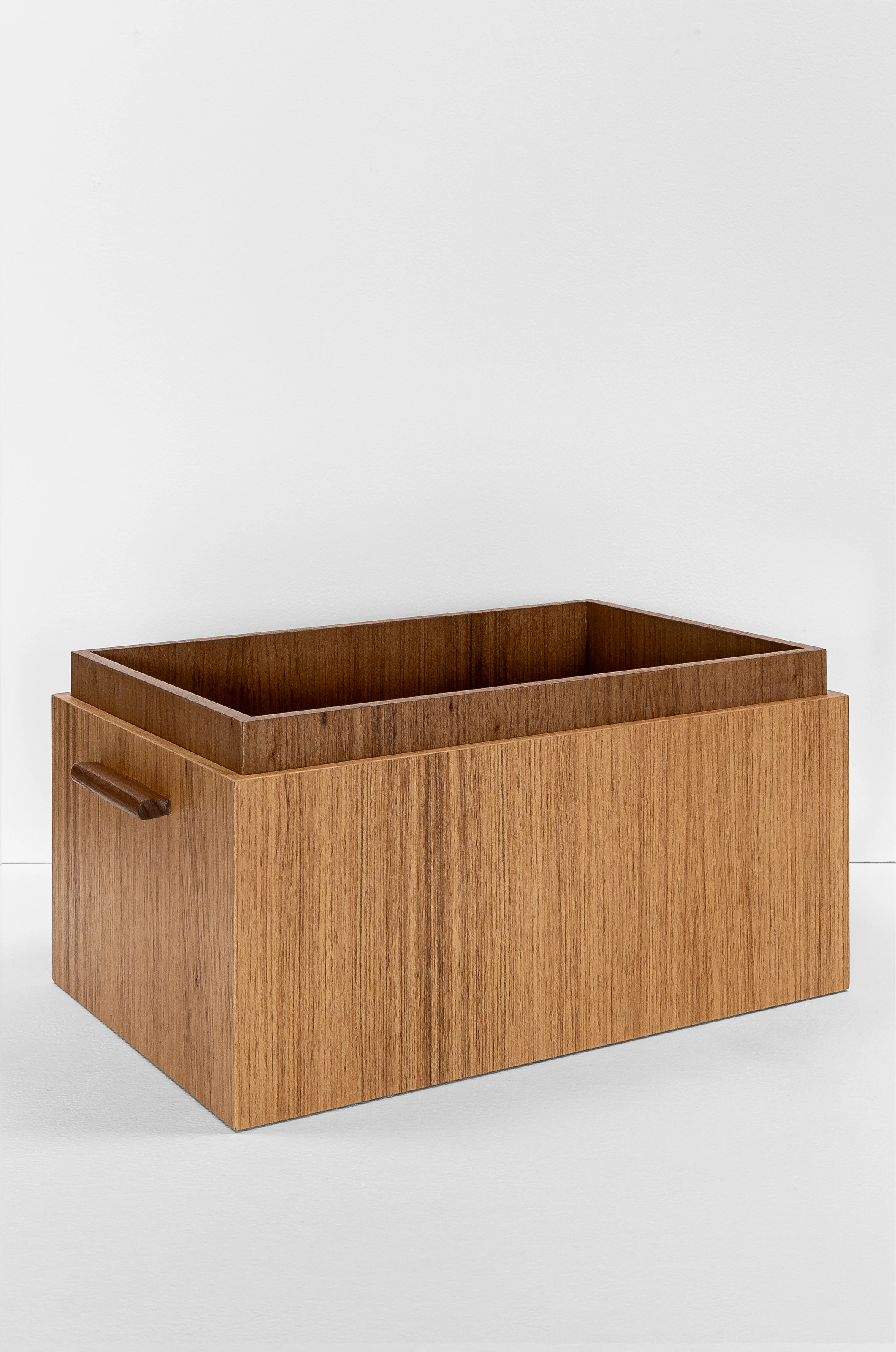 Toda em lâmina natural e com alças em madeira maciça, a peça pode ser usada com tampa ou sem.