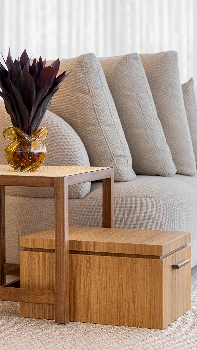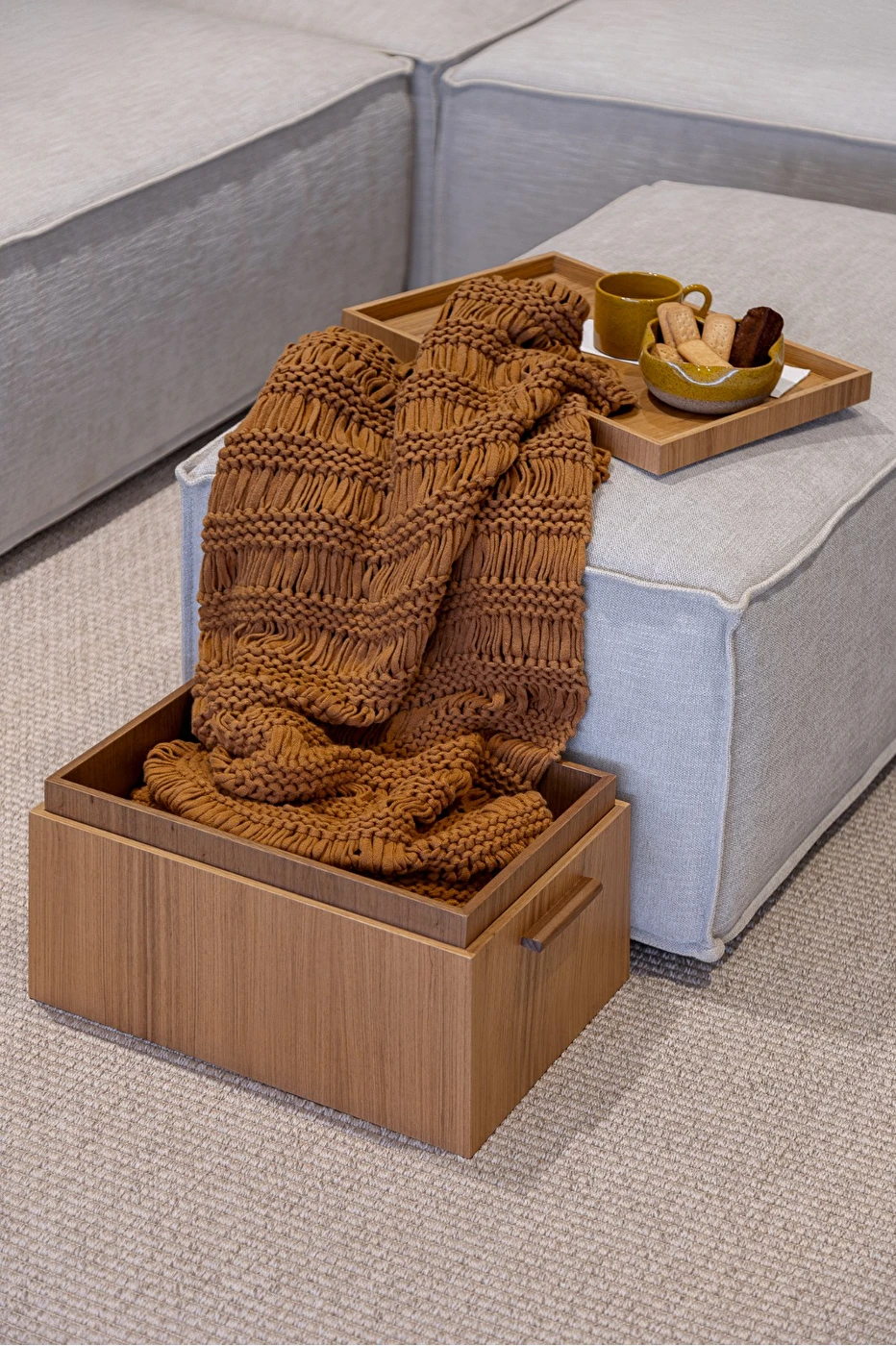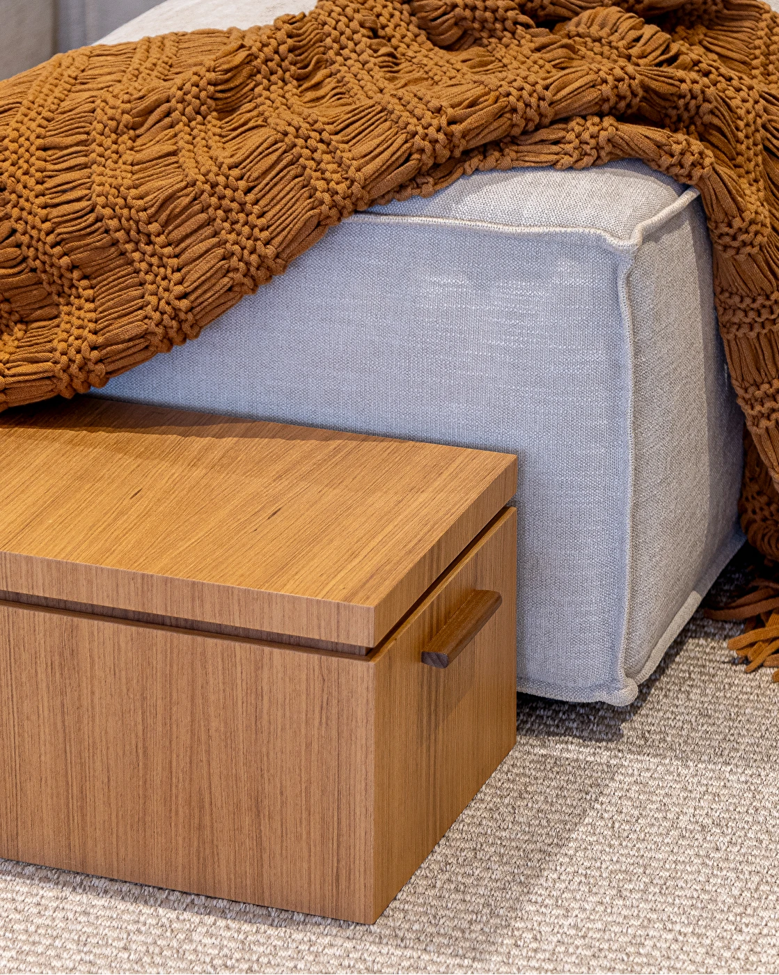 A Caixa Baú Quadra foi desenhada para compor ambientes de diversas formas. Em laterais de sofás com mantas e almofadas, abaixo de racks ou ao lado de mesas laterais, criando um jogo de alturas.