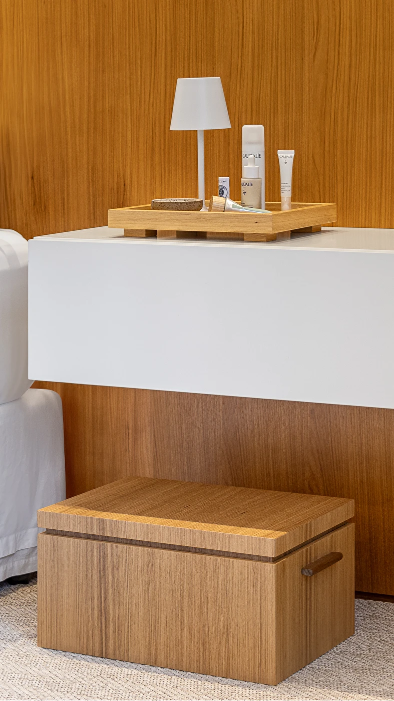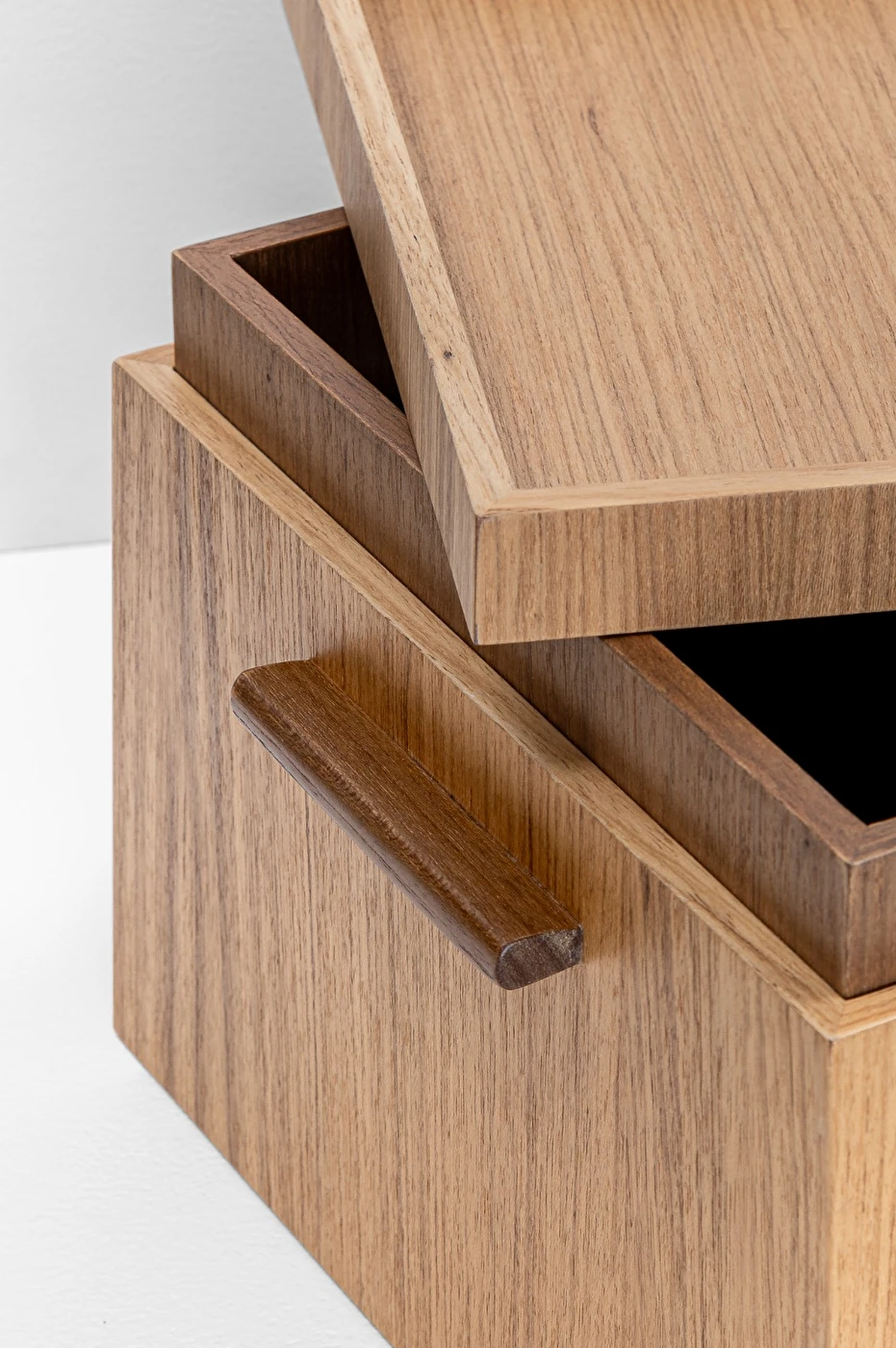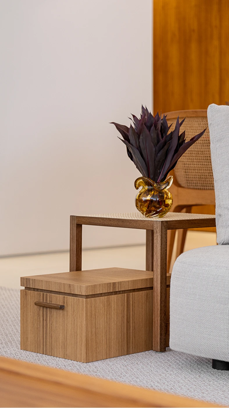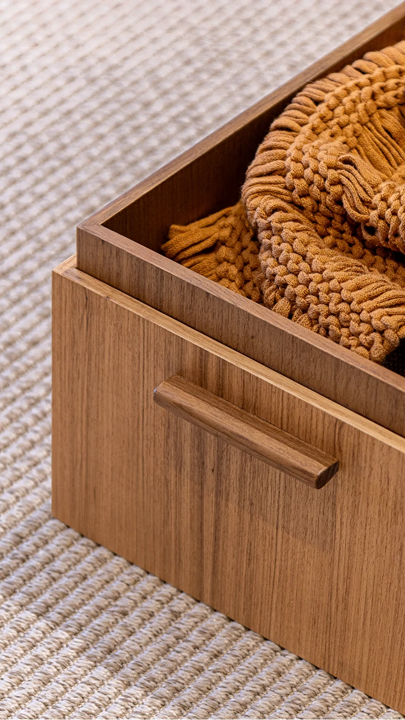 A Caixa Baú Quadra foi desenhada para compor ambientes de diversas formas. Em laterais de sofás com mantas e almofadas, abaixo de racks ou ao lado de mesas laterais, criando um jogo de alturas.