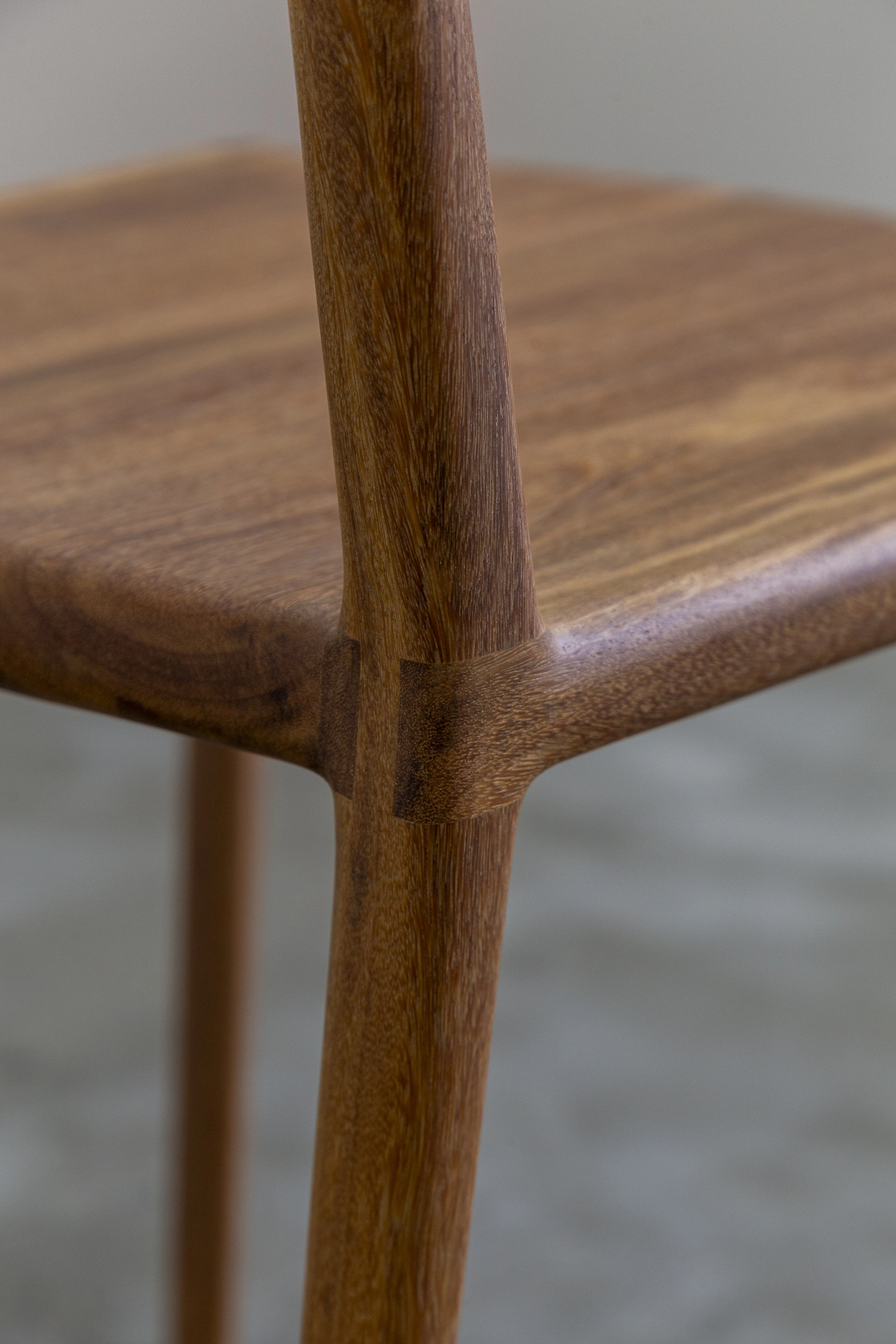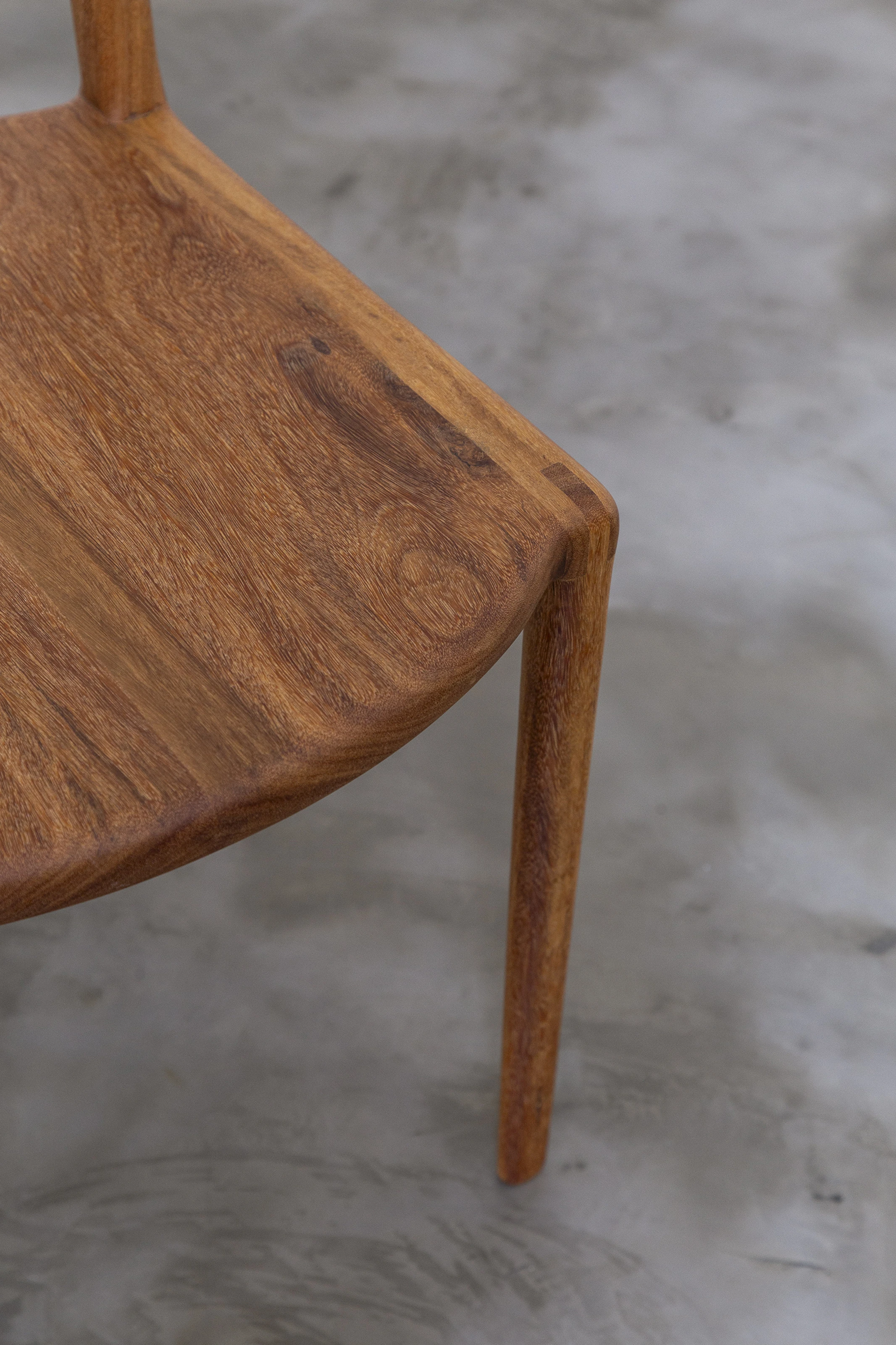 Sua execução tornou-se possível através da previsão do comportamento natural da madeira, posicionando os veios do assento de forma a curvarem para cima e liberando as pernas frontais para acompanharem o movimento. Como resultado tem-se uma cadeira aparentemente simples, quase elementar, que guarda em seus detalhes a complexa beleza do natural.