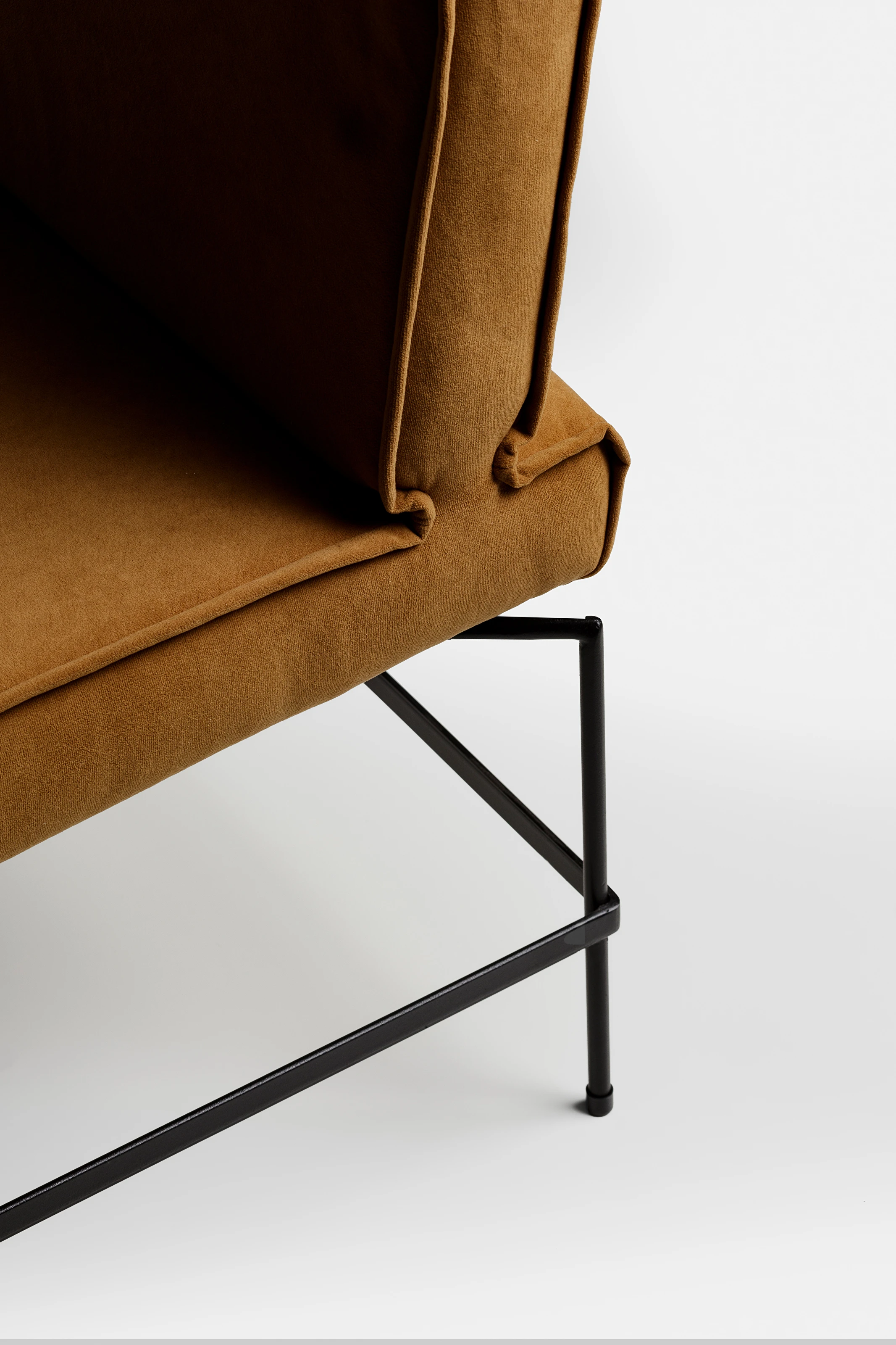 Estrutura em aço carbono com pintura epóxi, assento em madeira estofado com mix de espumas e mantas.
