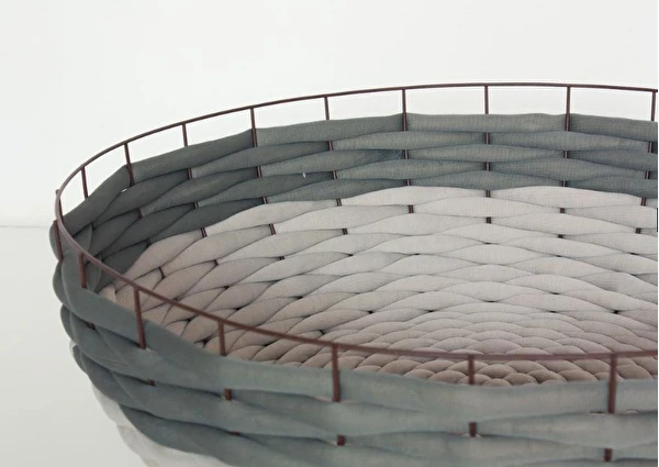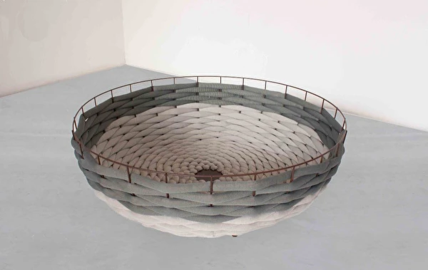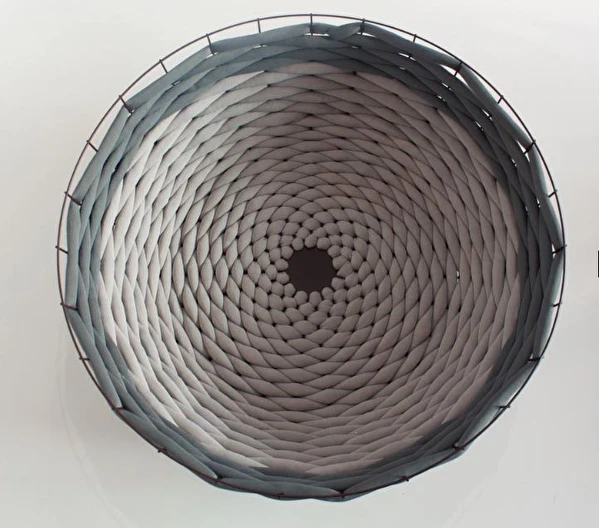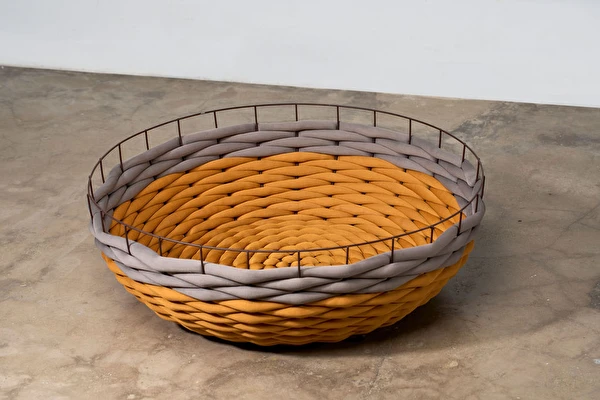 O Cesto Jacá possui estrutura aramada com pintura eletrostática e é trançado com fio gigante de algodão (ou poliéster para área externa)