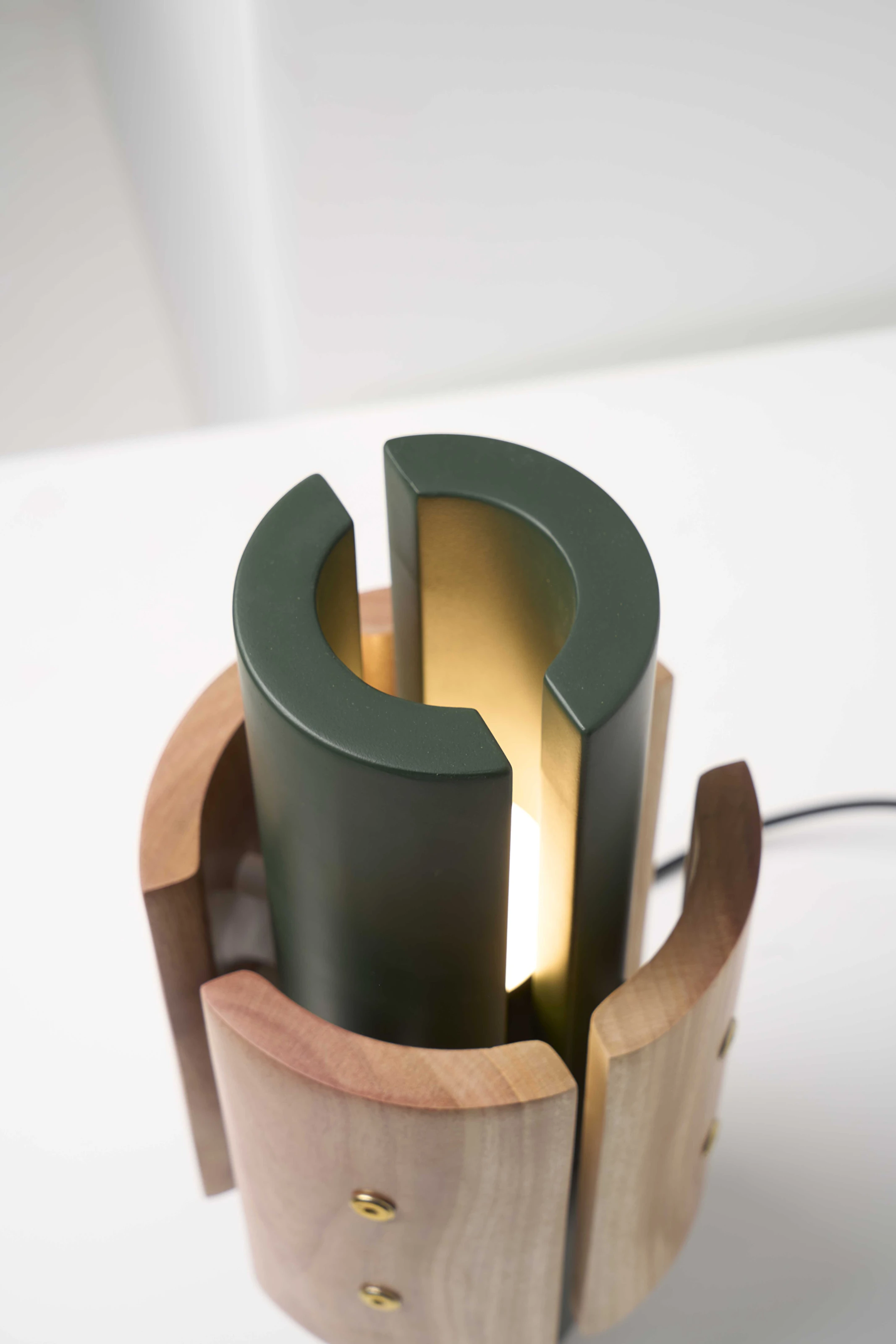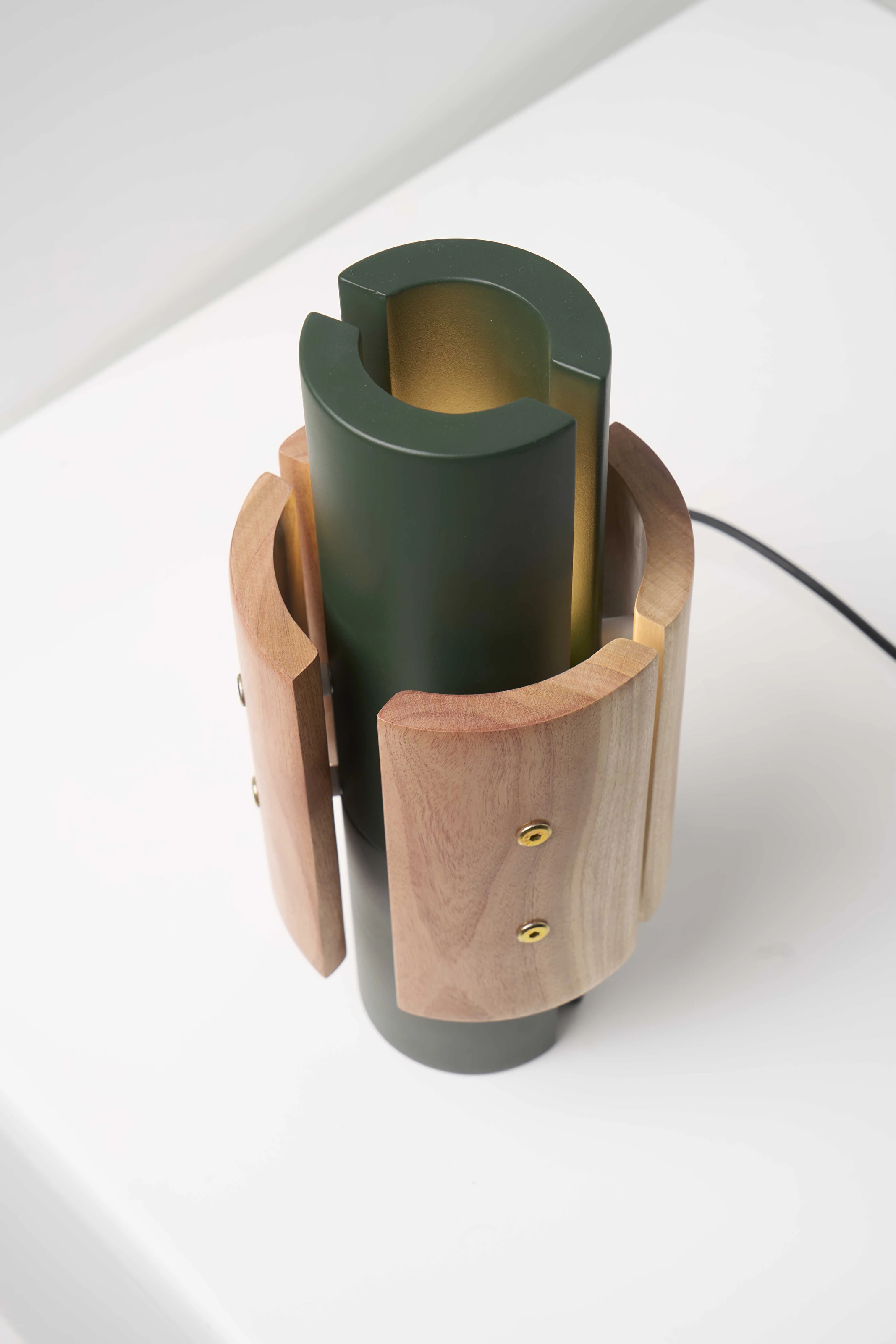 Seu design é composto por um núcleo envolto por curvas de madeira que,