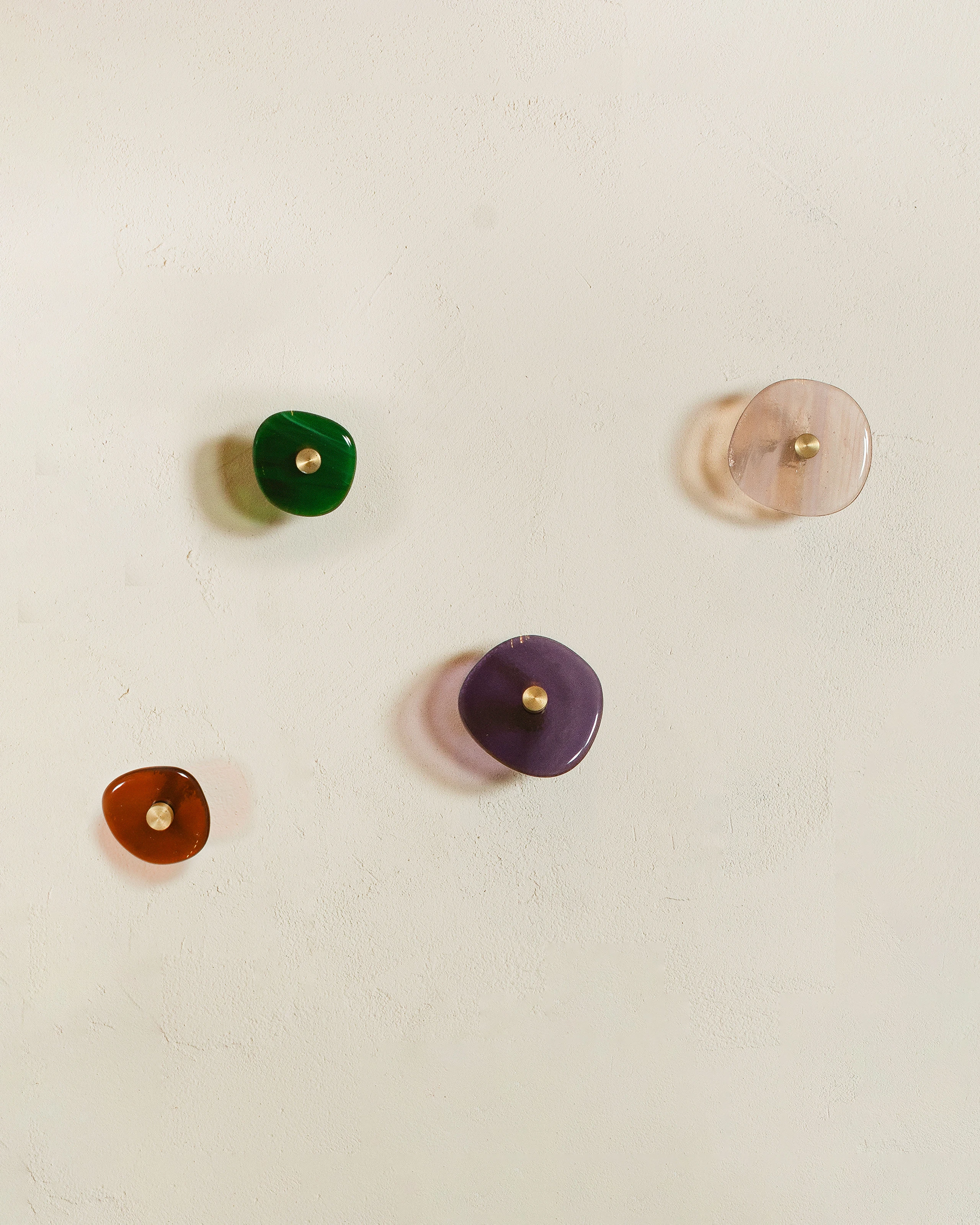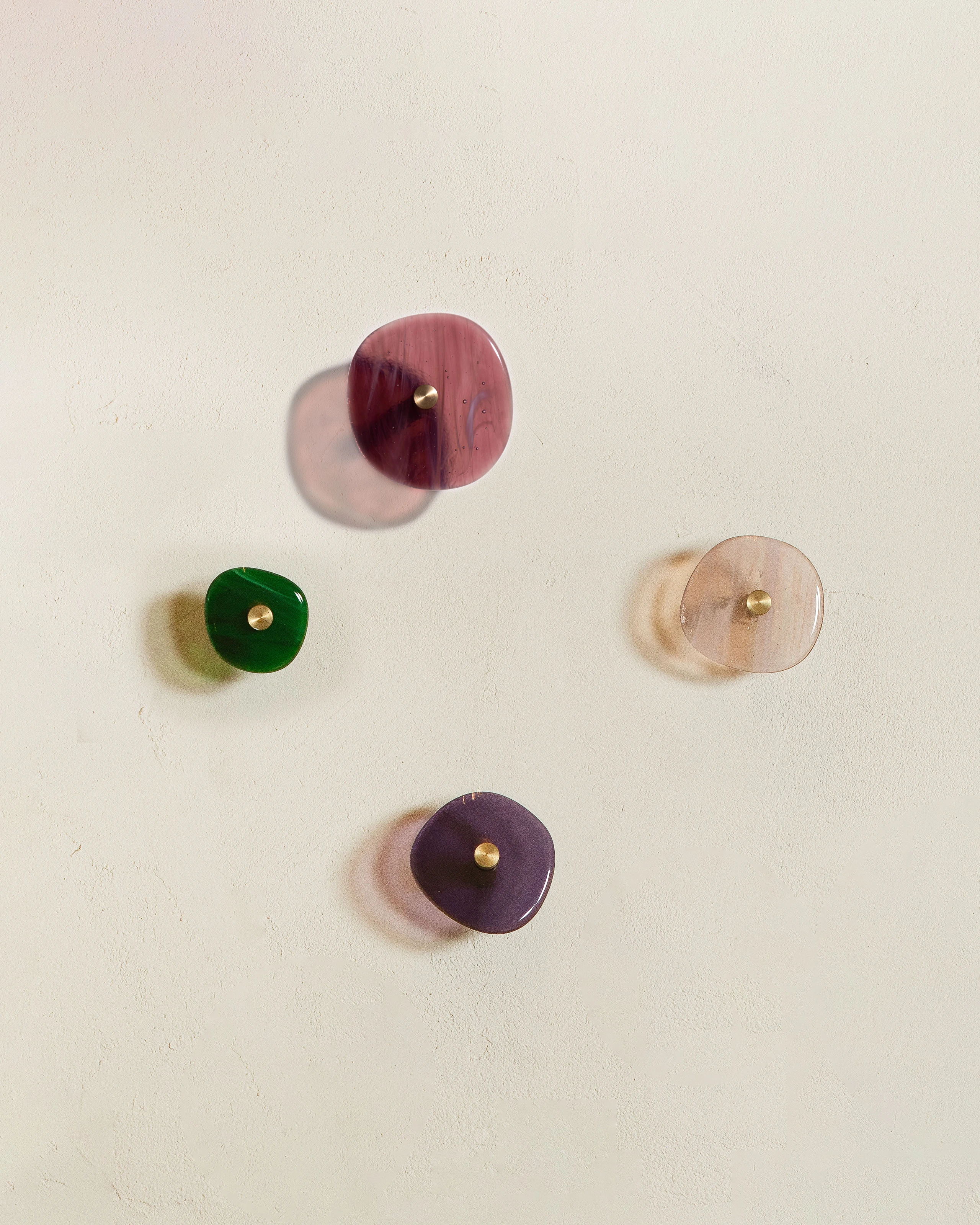 O conjunto de Ganchos ÓRBITA é um kit de ganchos de parede feitos em vidro artesanal e suporte metálico. (Não indicado para uso como puxador de porta ou armário).