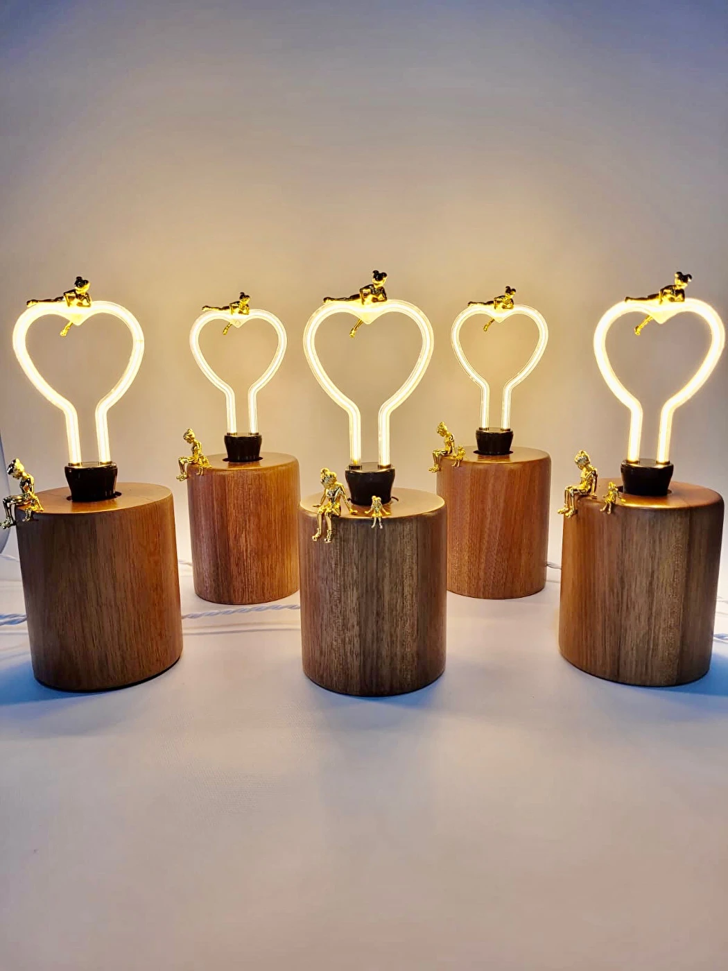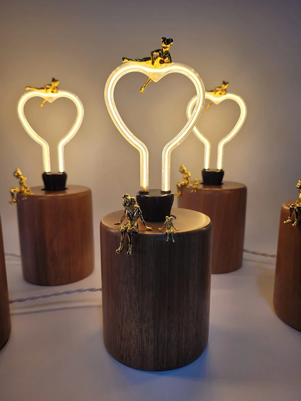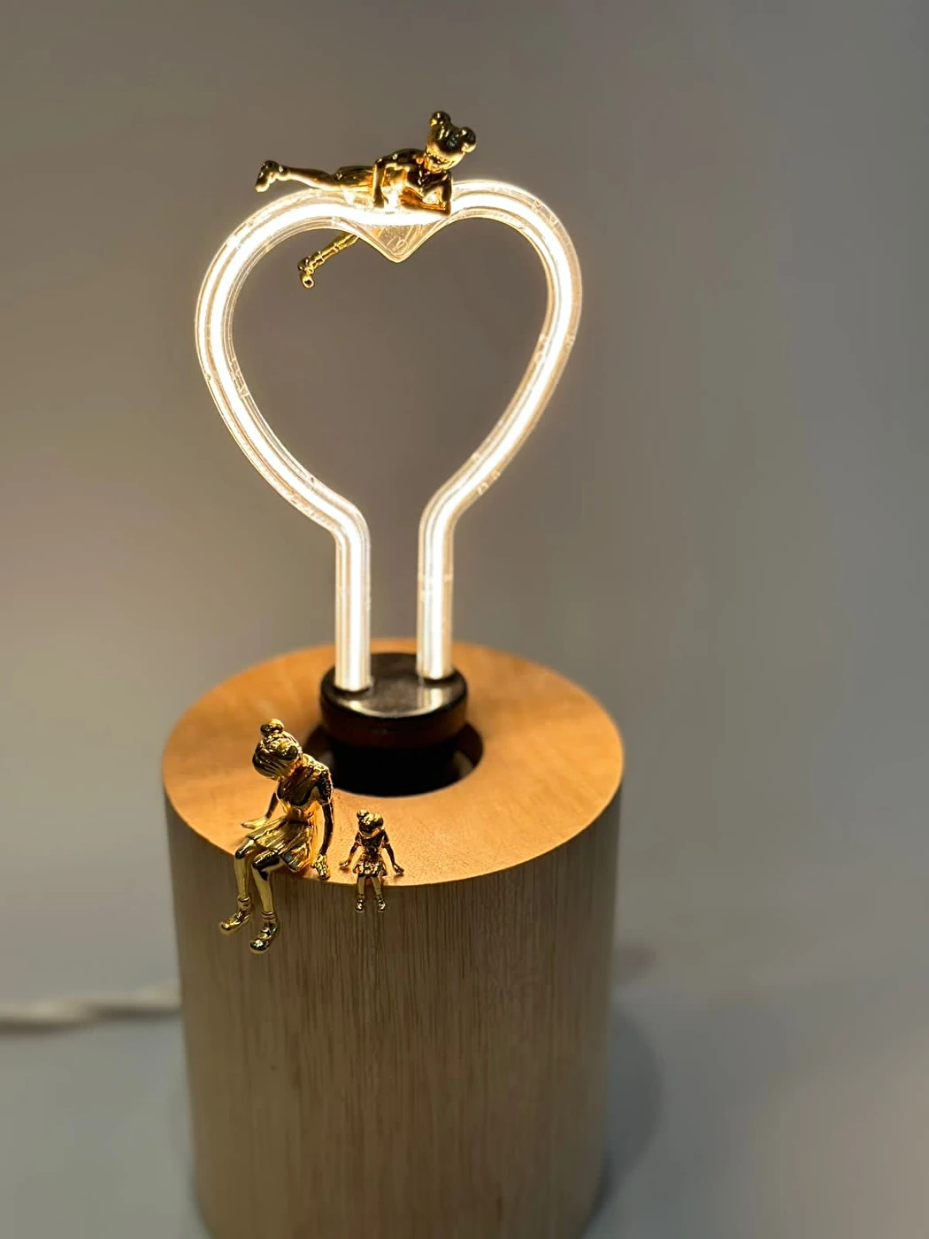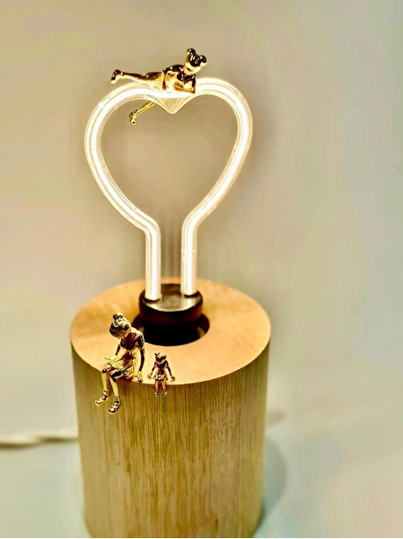 Luminária de mesa com lâmpada em formato de coração em filamento de led, bivolt. Base em mandeira com 1,80 de fio útil, bocal de porcelana, fio trançado em cor bege e com aplicação de peças em latão da Artista Nara Ota