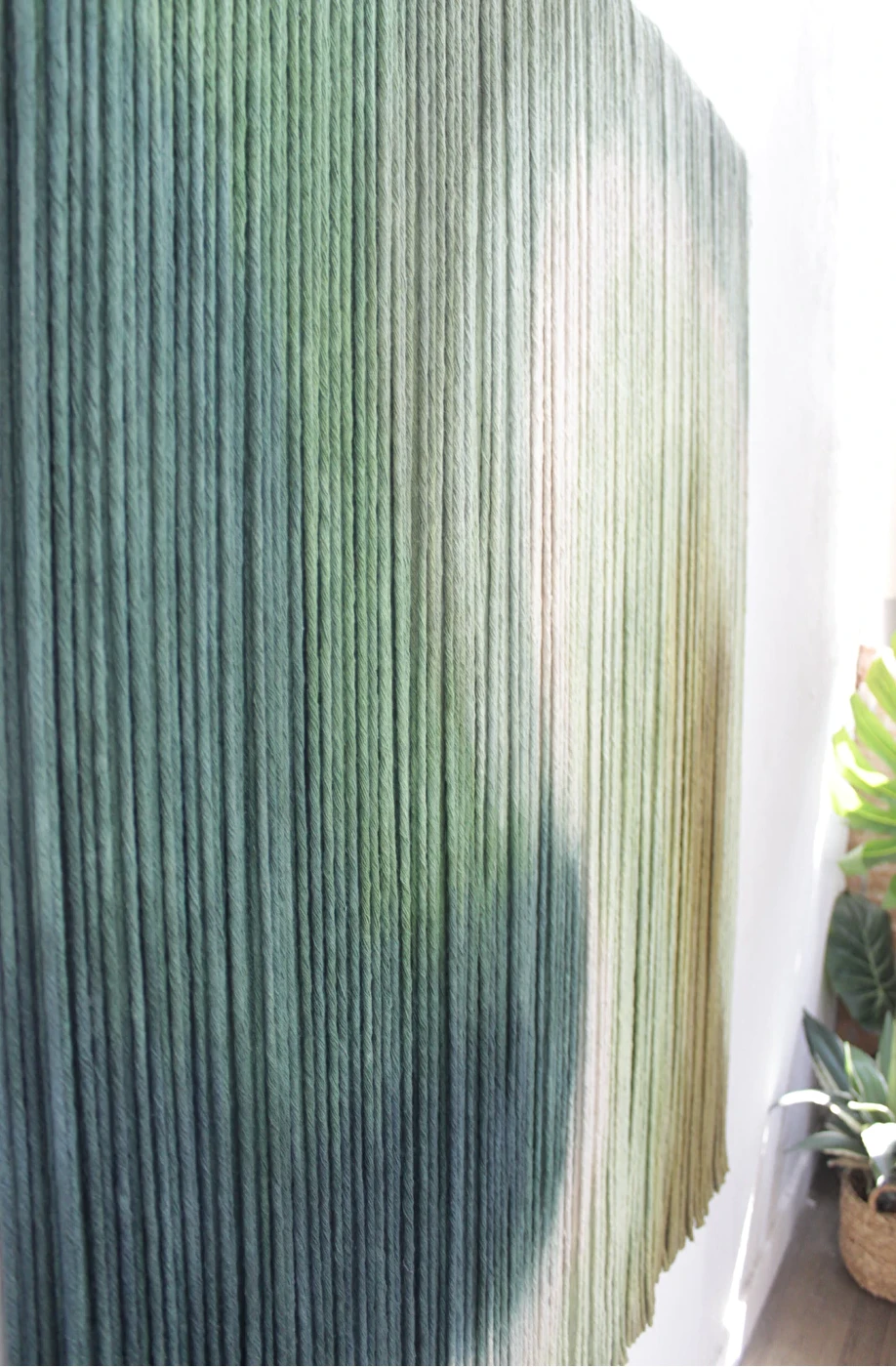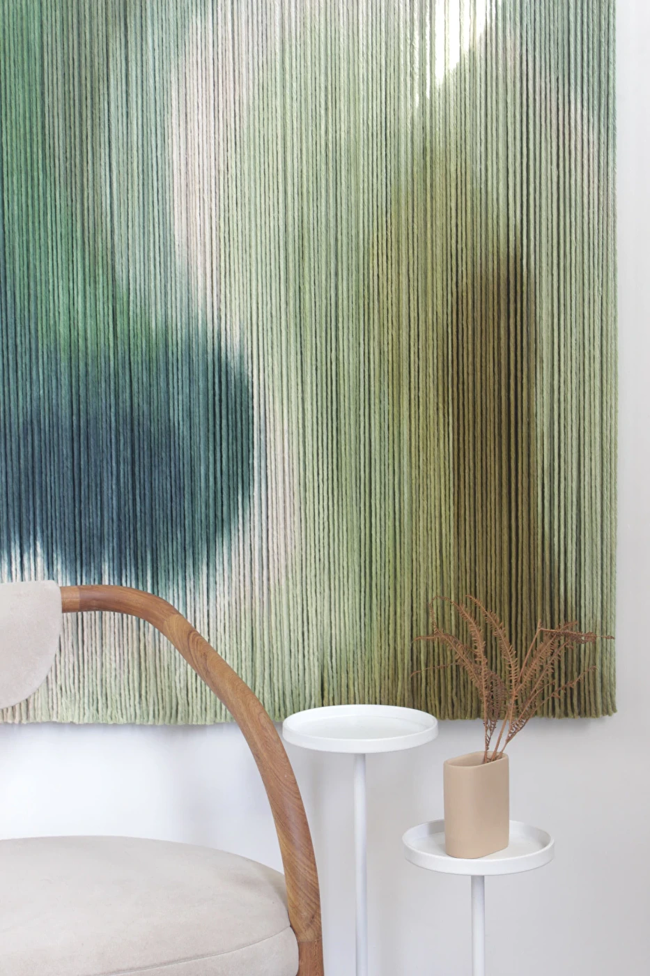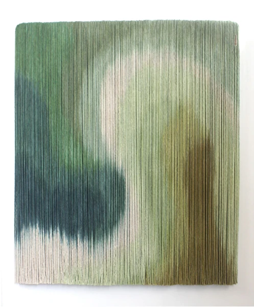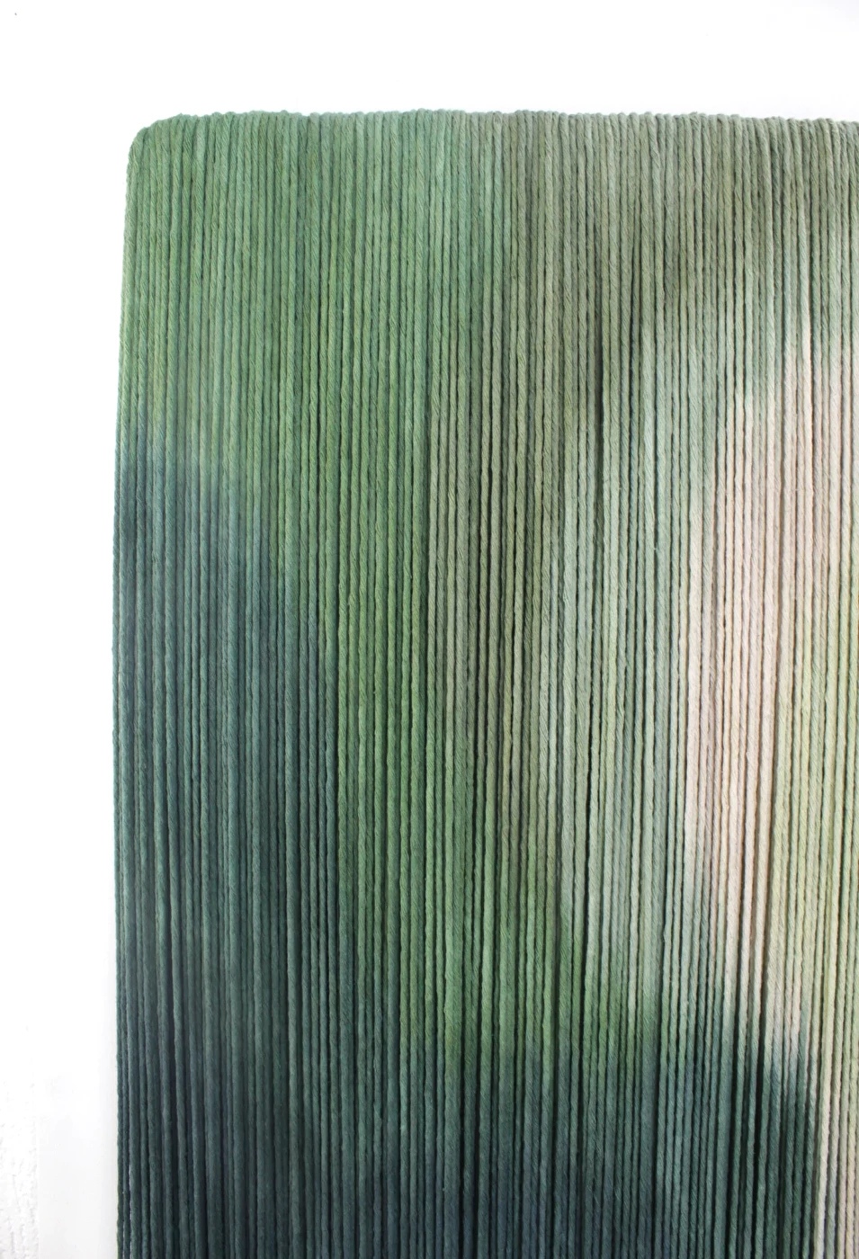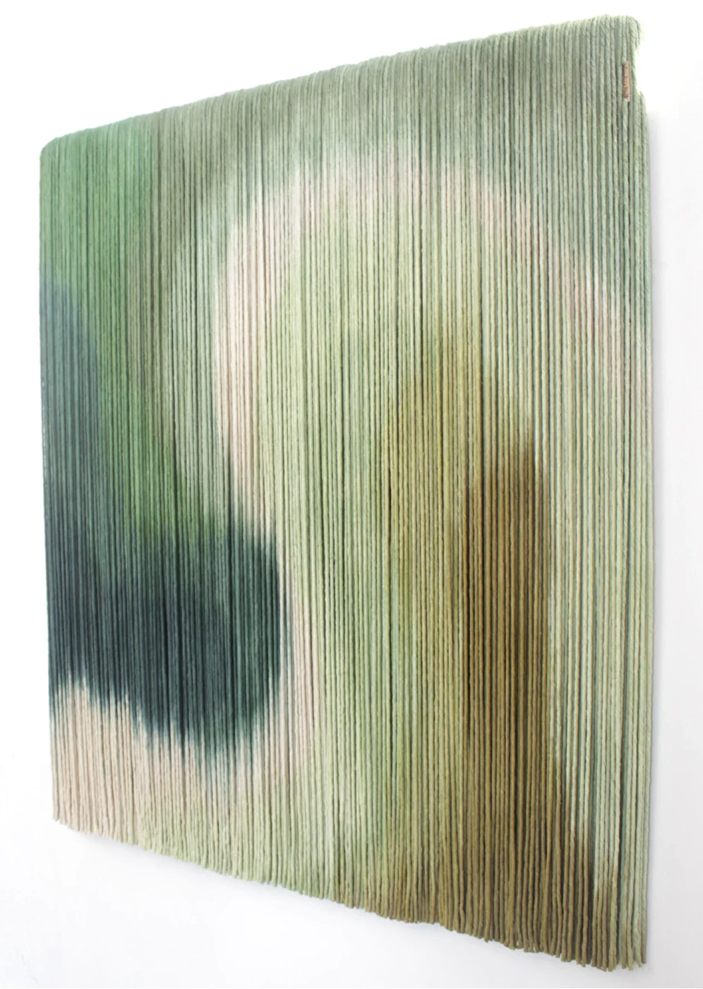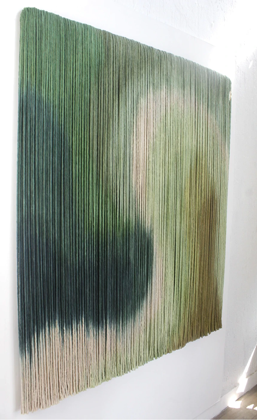 Tapeçaria de parede em fios espessos de algodão tingidos em degradê de verdes, sustentado por madeira.