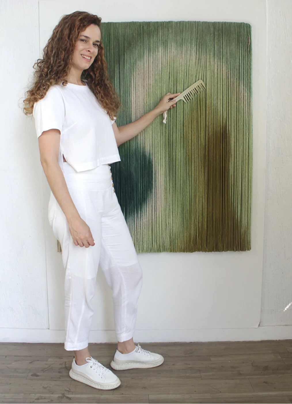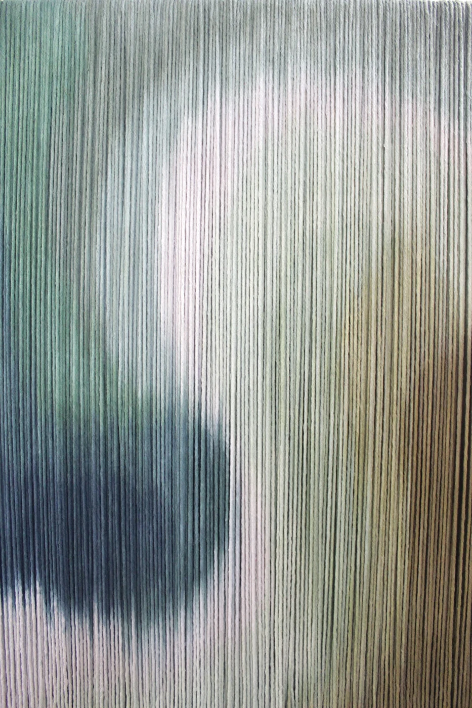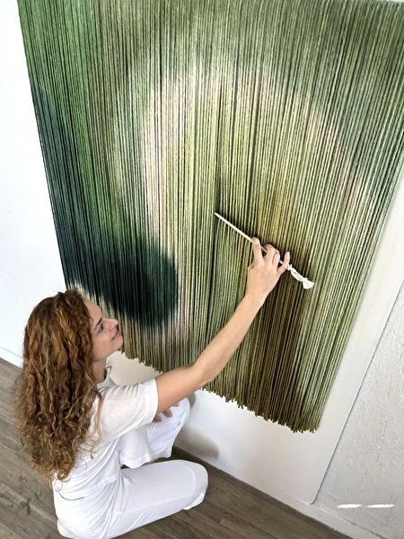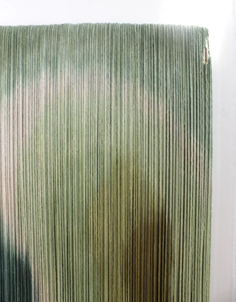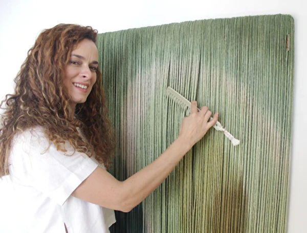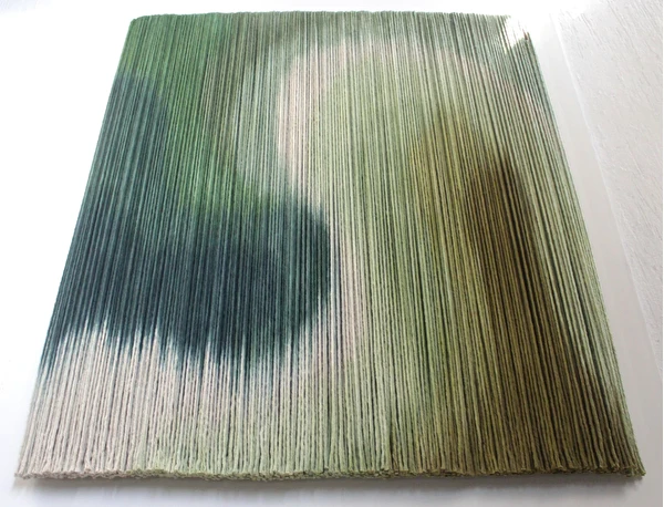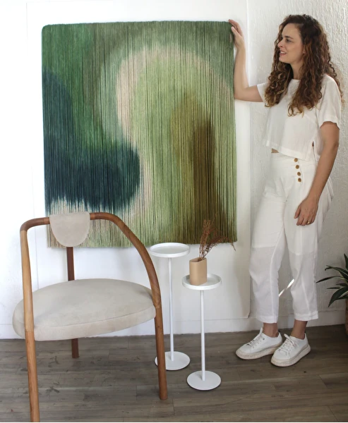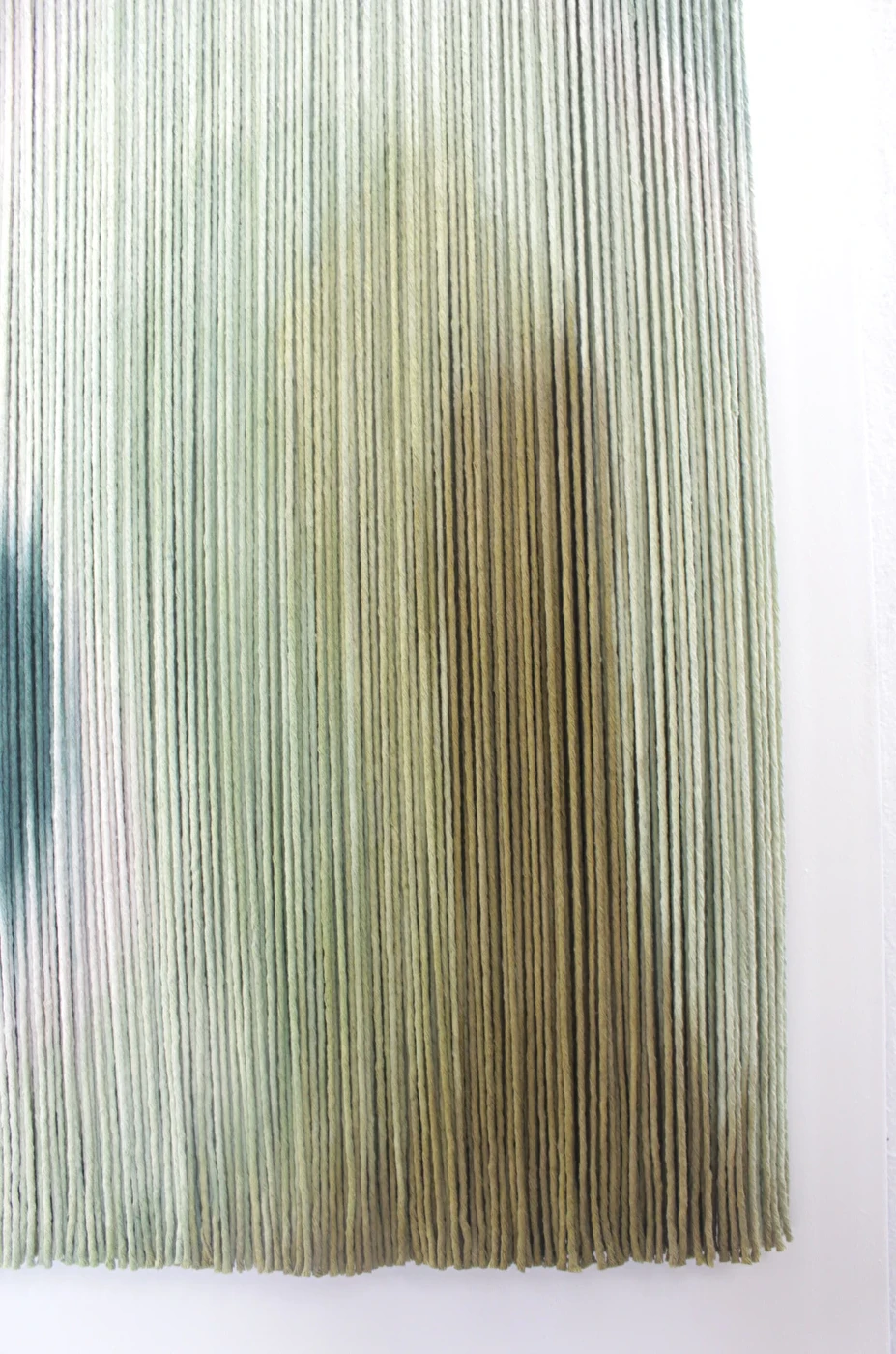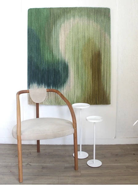 Tapeçaria de parede em fios espessos de algodão tingidos em degradê de verdes, sustentado por madeira.