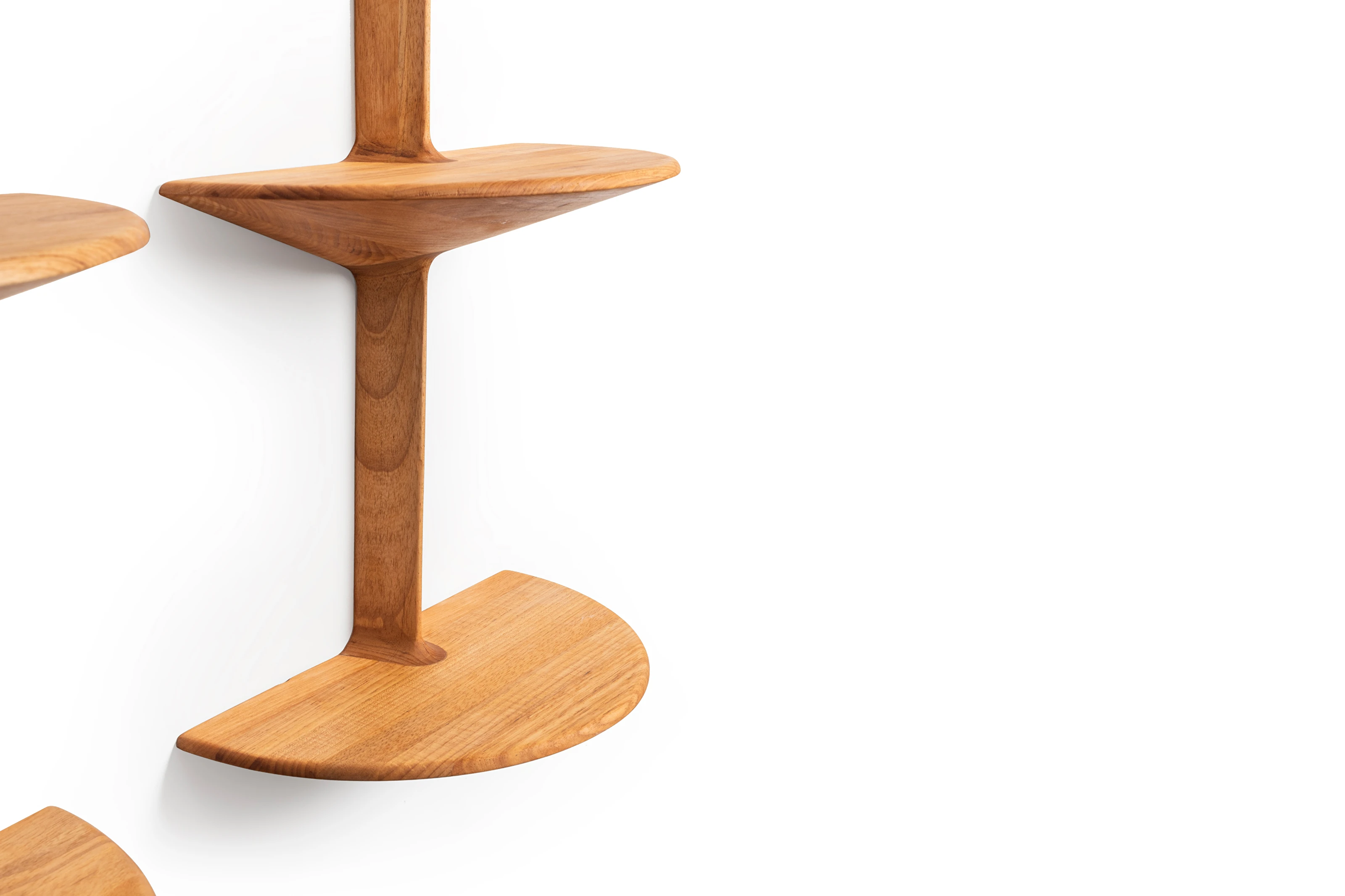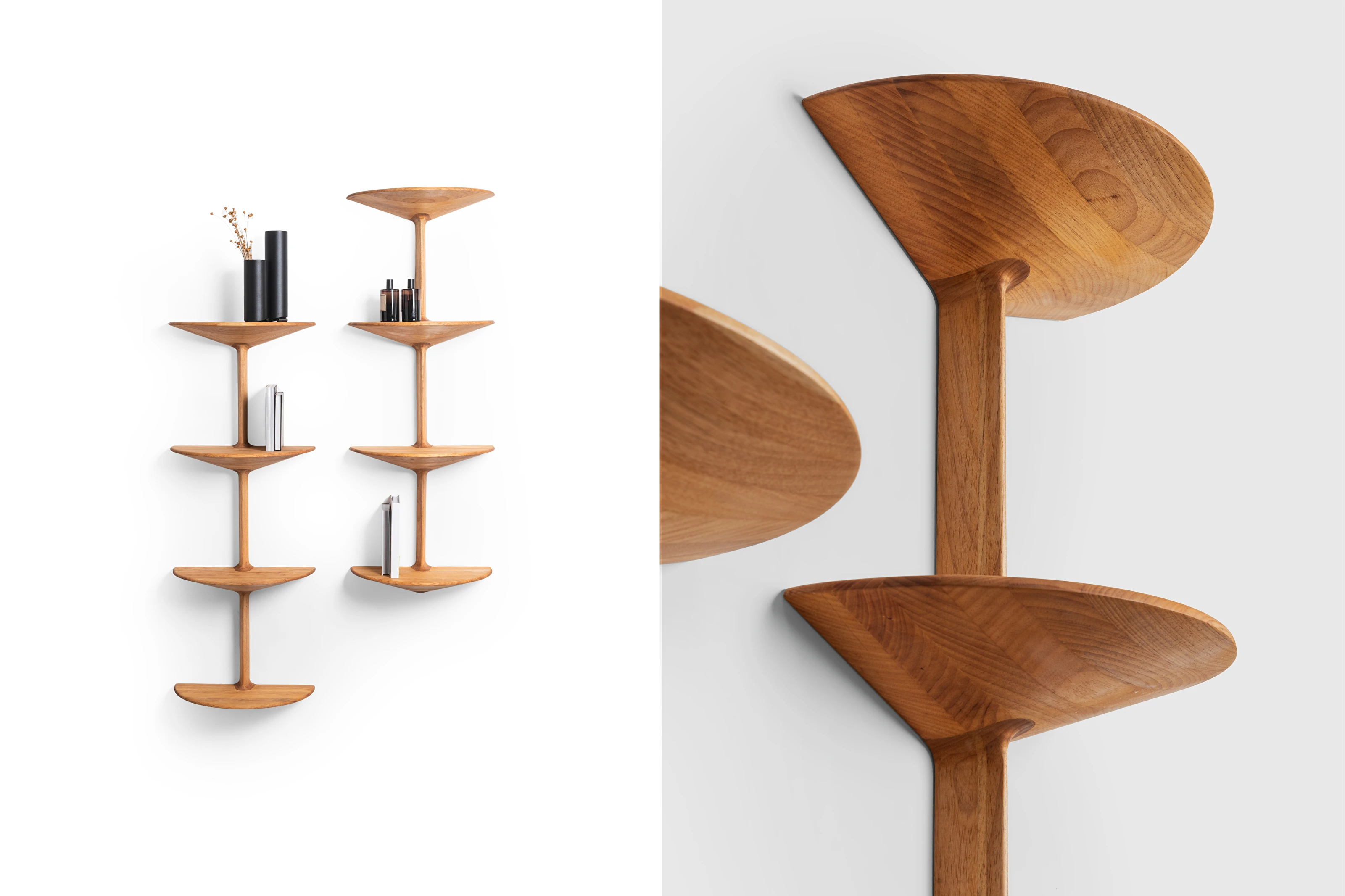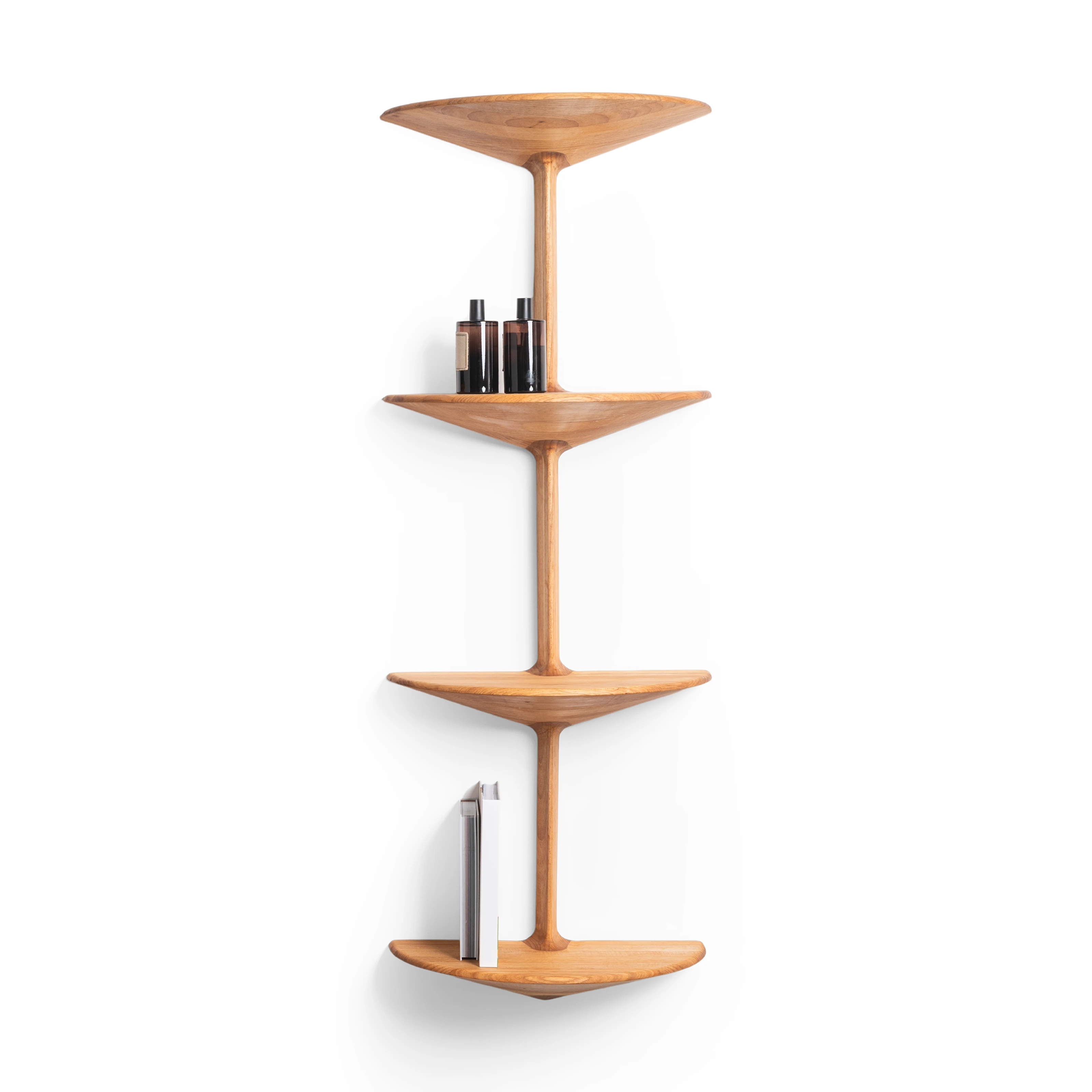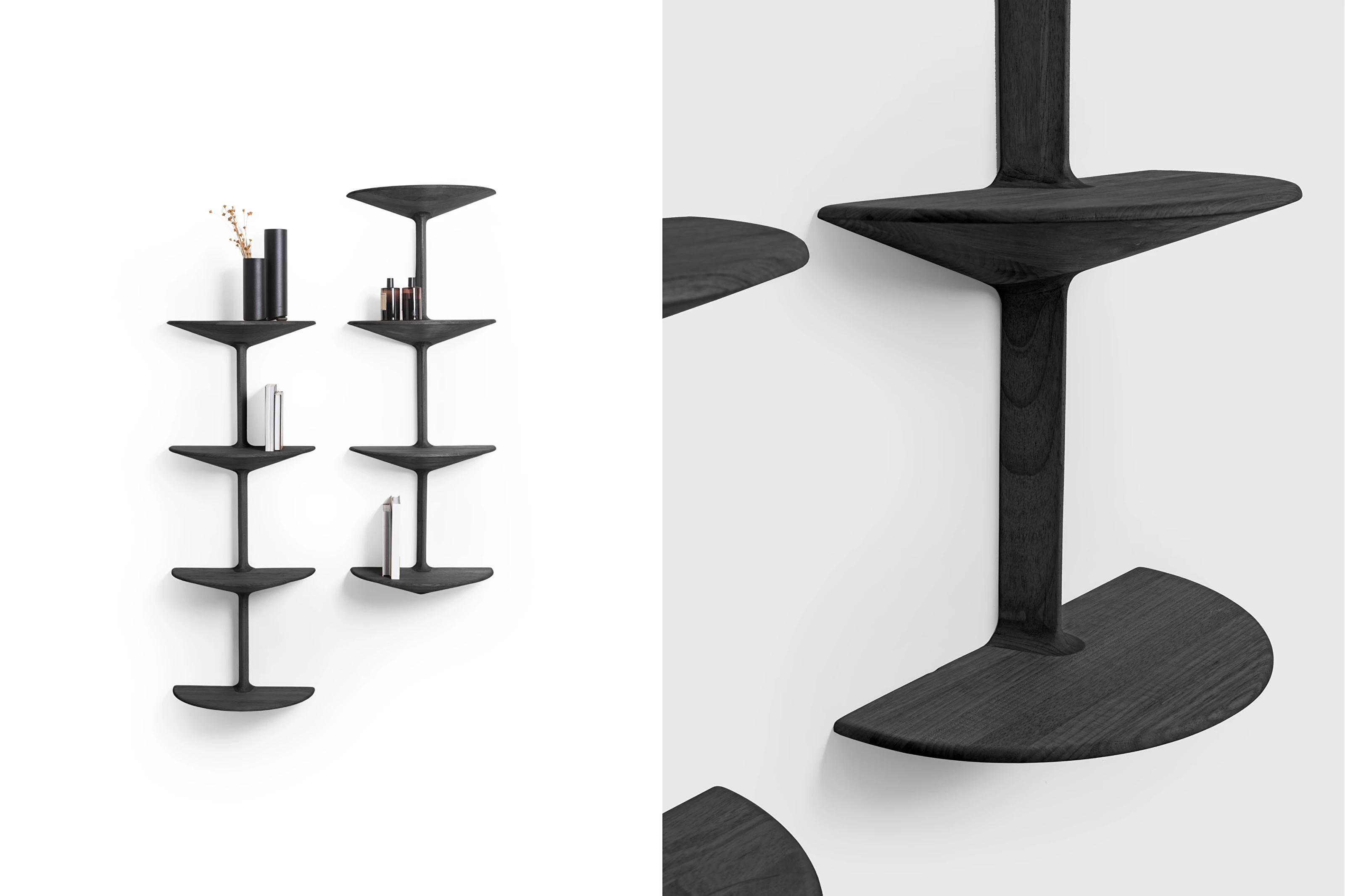 TEM é uma estante escultórica, que conecta volumes através de um traço vertical. Suas prateleiras cônicas reforçam a fluidez de um desenho que parece escorrer com as horas. Sua construção dá liberdade à decoração, podendo ser utilizada de forma múltipla ou solitária.