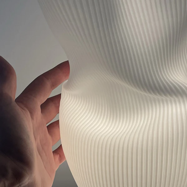 Tais curvas enigmáticas, que se assemelham a um tecido, proporcionam variação deliciosa entre luz e sombra na volumetria da peça. O resultado é uma luminária com luz difusa e confortável, que provém aconchego para salas, quartos, e ambientes em geral.