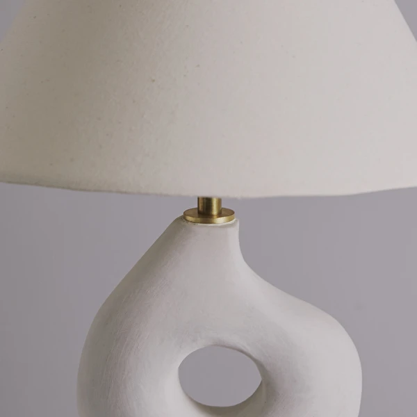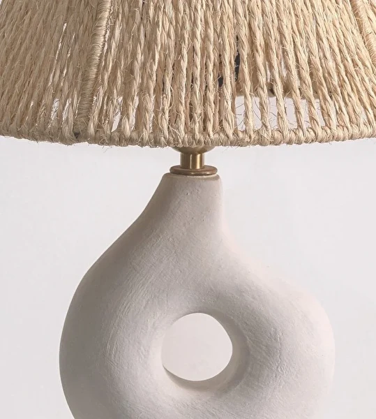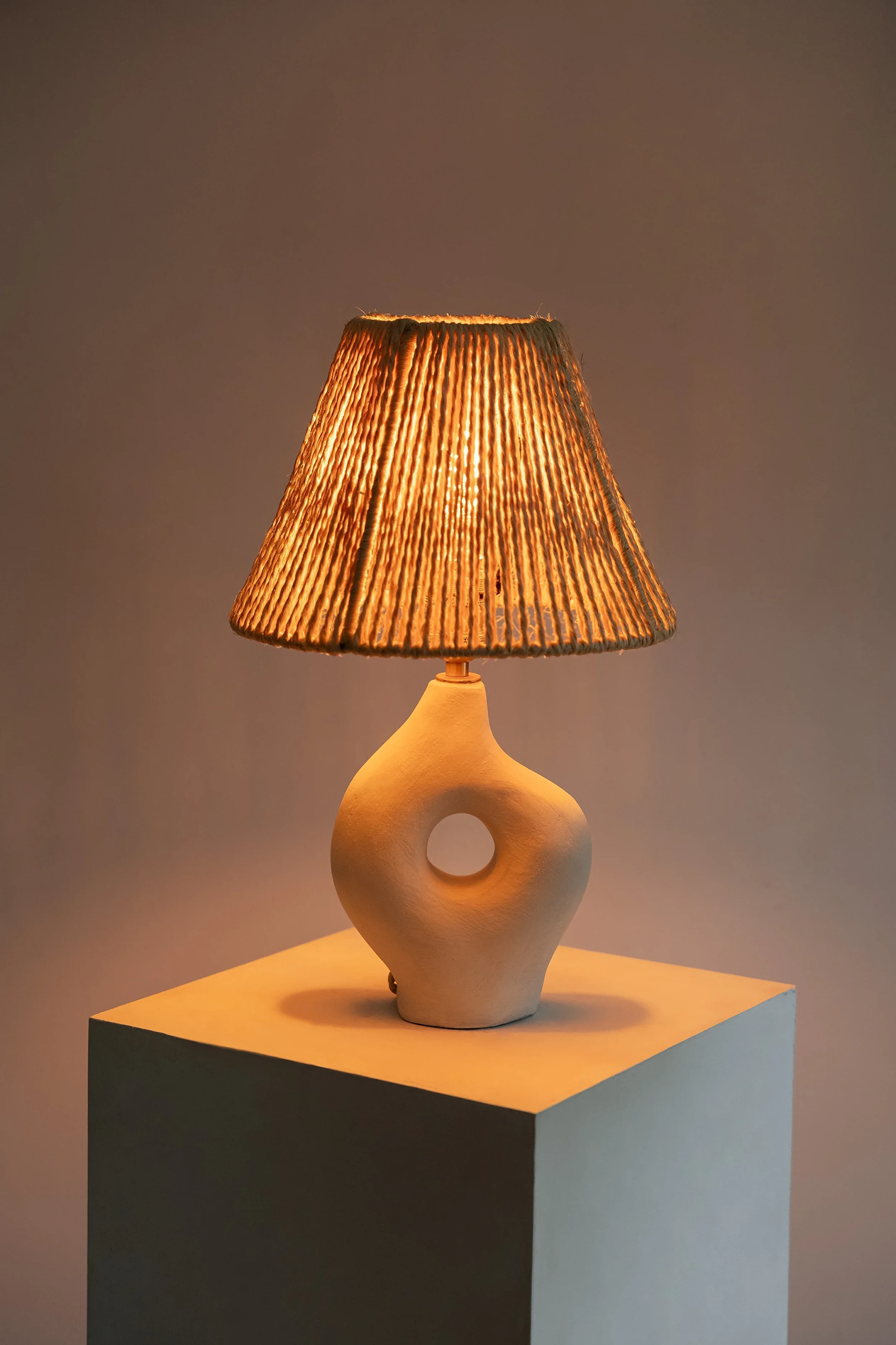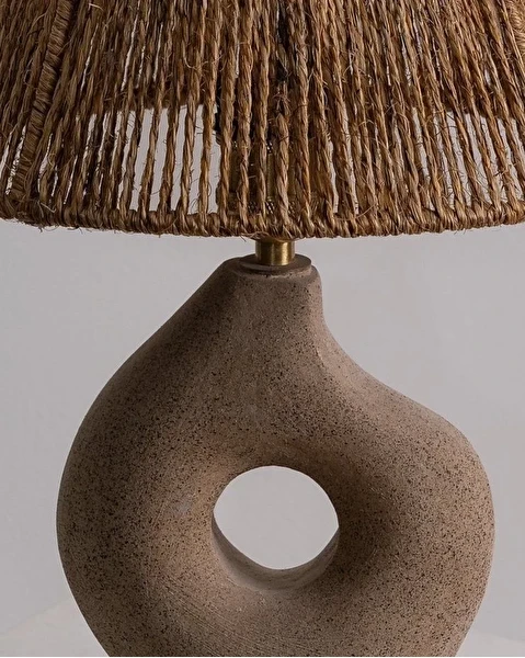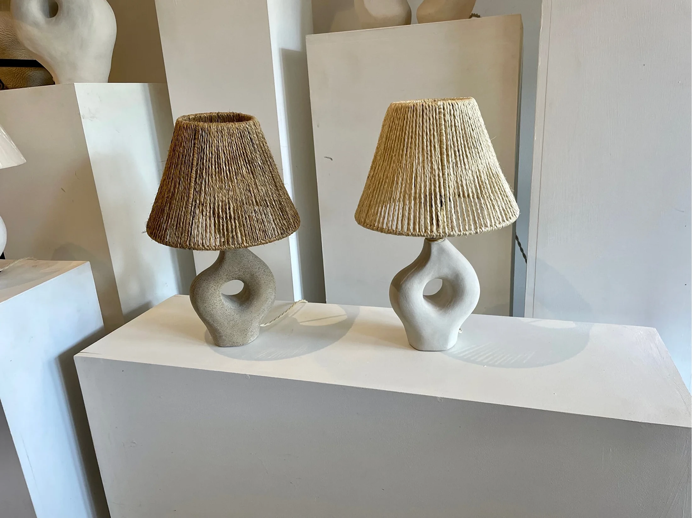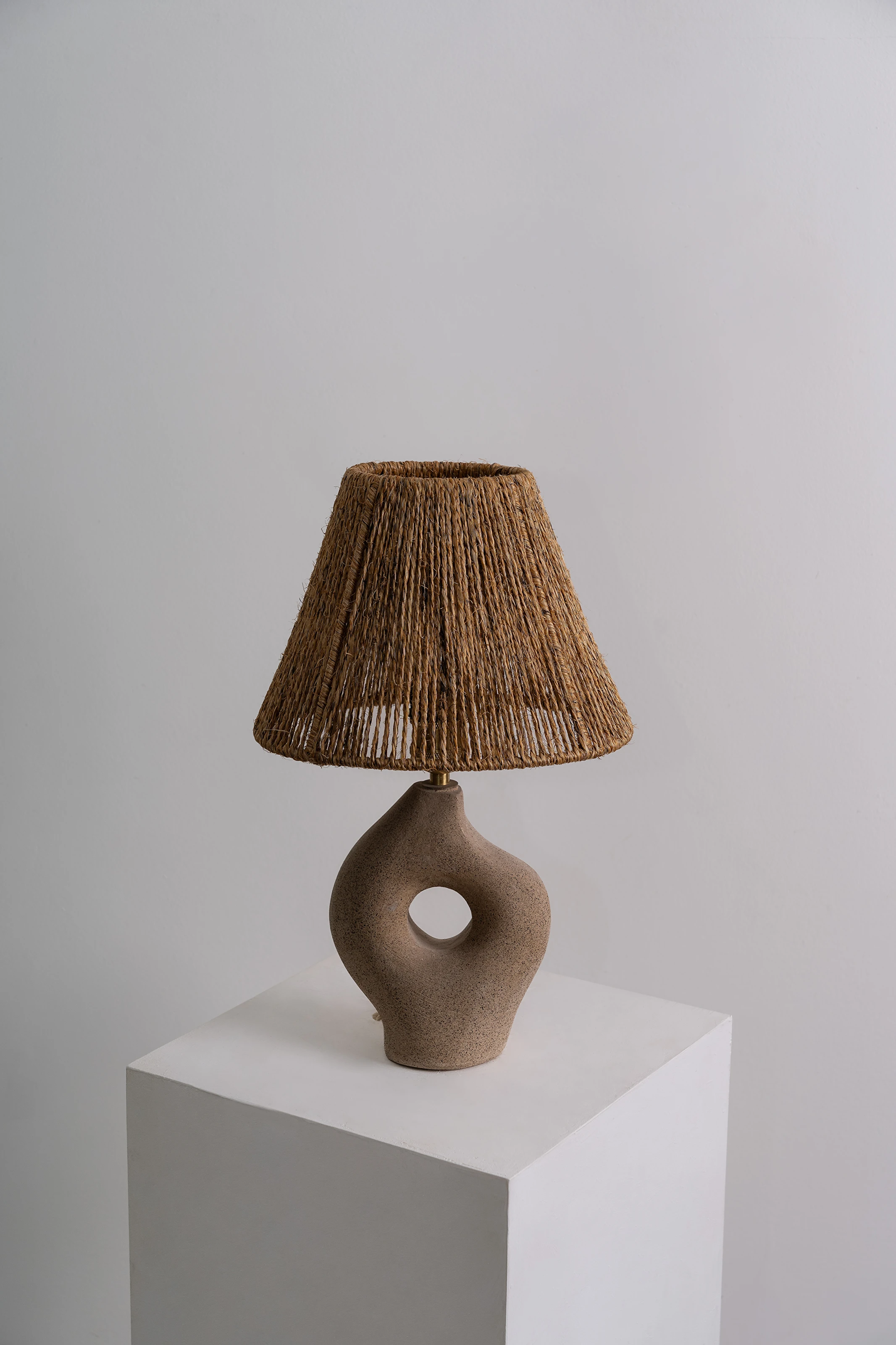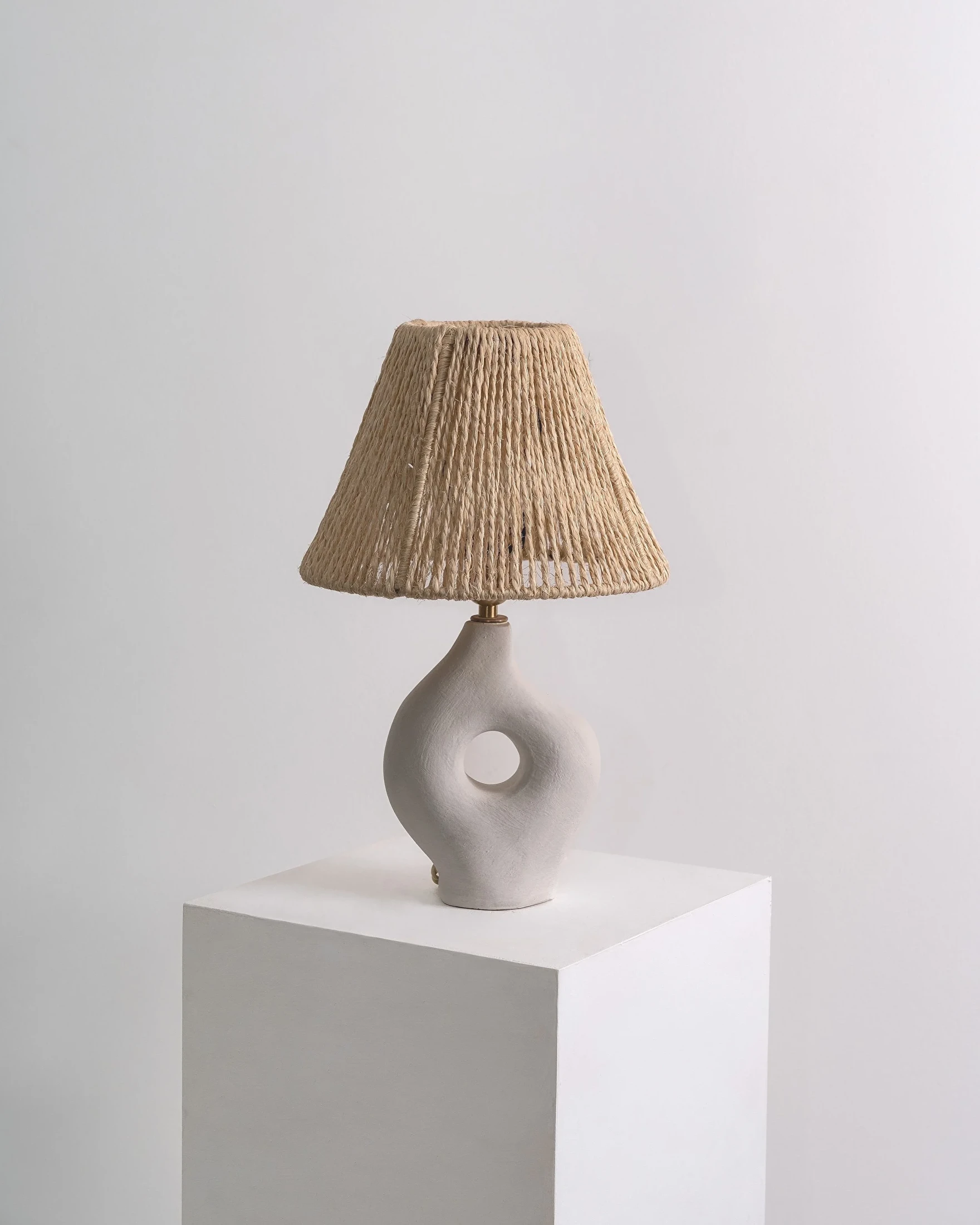 Base de luminária artesanal em cerâmica, com cúpula em palha de sisal brasileira ou tecido liso off-white. Peça de design escultural, com curvas suaves e um recorte orgânico ao centro, que confere leveza e movimento ao conjunto