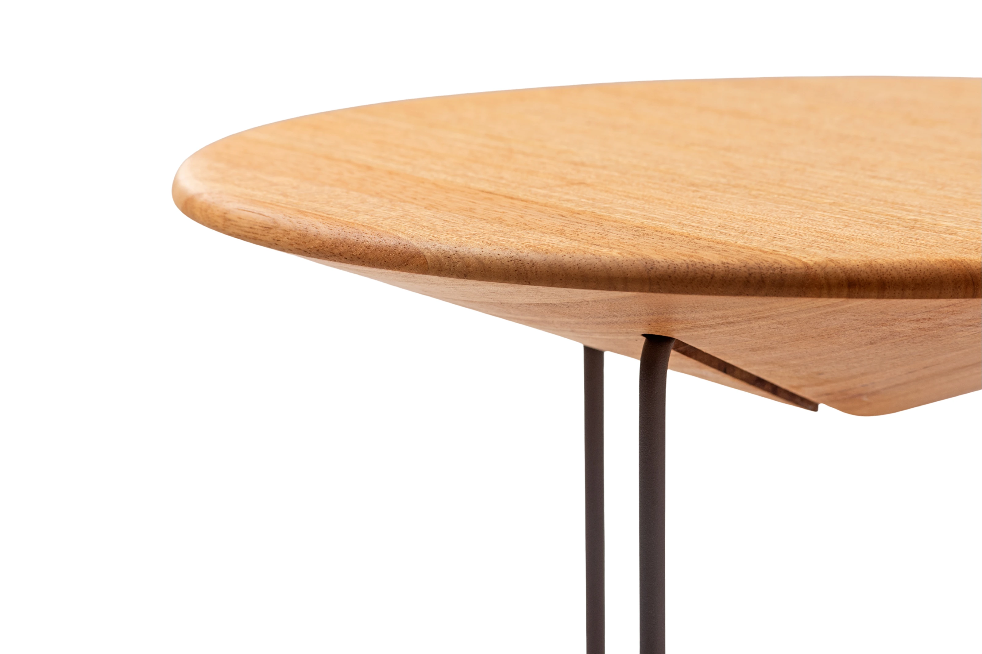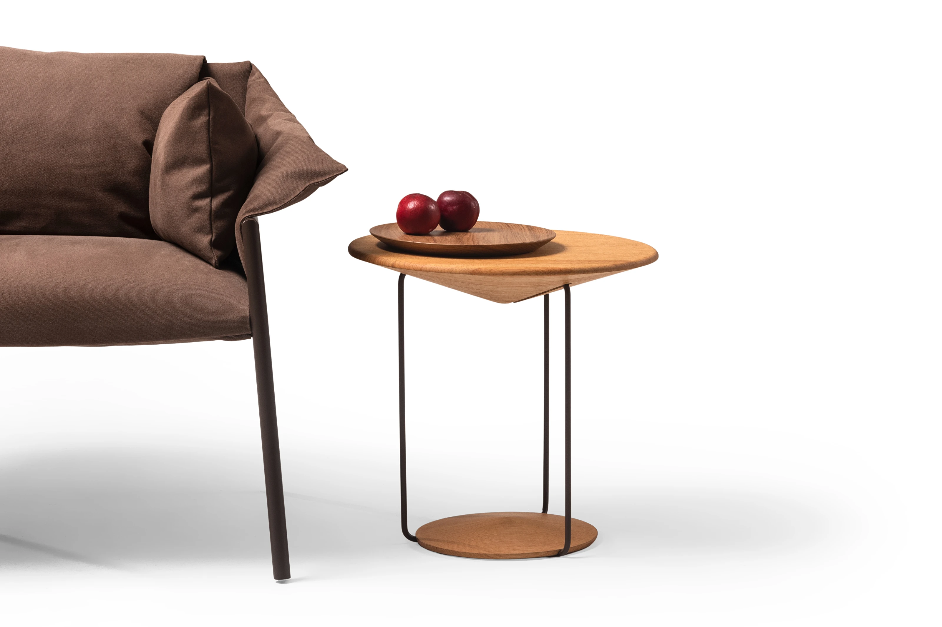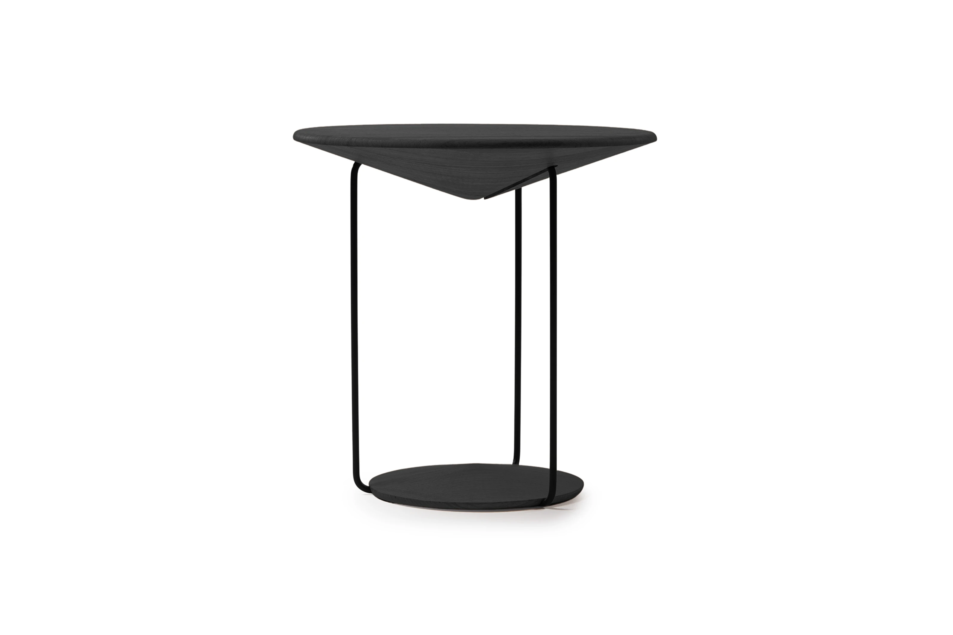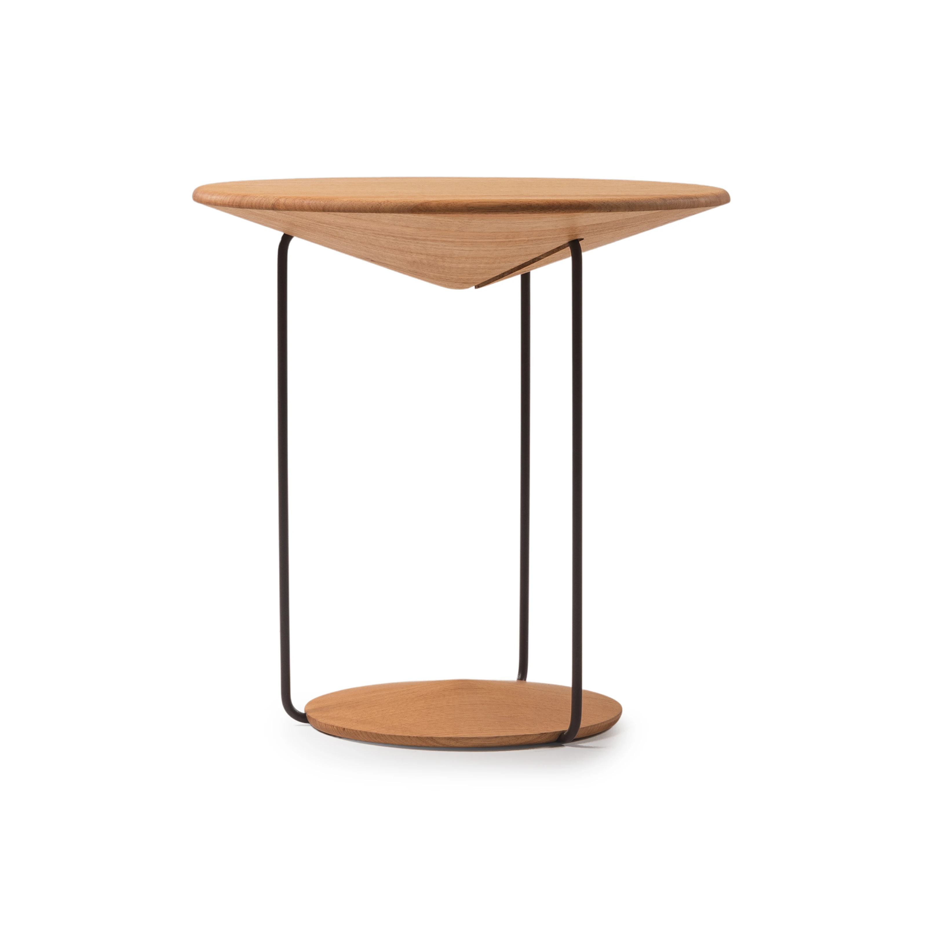 SYS é uma mesa lateral que evoca o tempo ao se modelar como uma ampulheta. Seus dois cones de madeira maciça se espelham, afastados por eixos de metal que instauram o intervalo e a pausa no desenho. Essa composição cria um respiro elegante por meio de vazios delineados.
