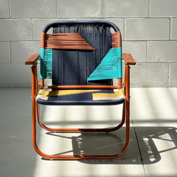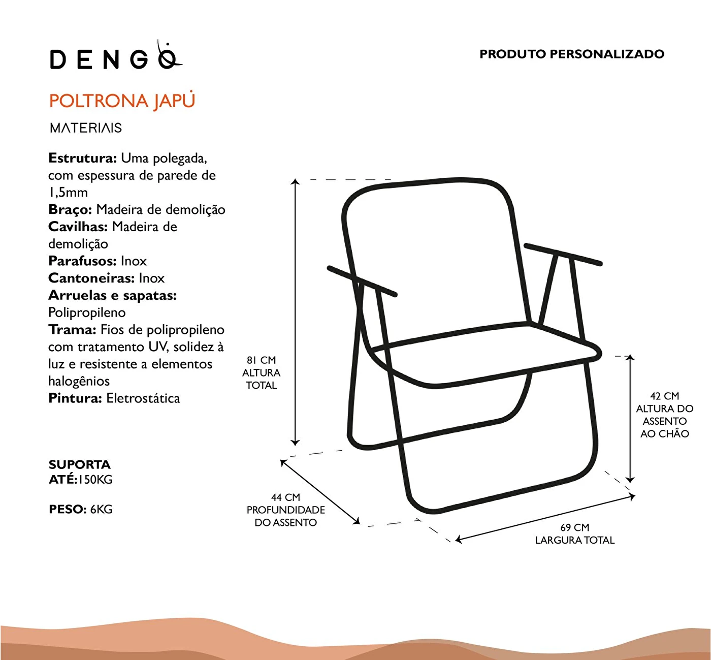 Estrutura em alumínio com tubo de 7/8 (para os modelos cadeira, espreguiçadeira e denguinho) e 1” (para os modelos poltrona e poltrona reclinável) com espessura de parede em 1,5mm, parafusos em inox, e arruelas não abrasivas de polipropileno. São dobráveis.