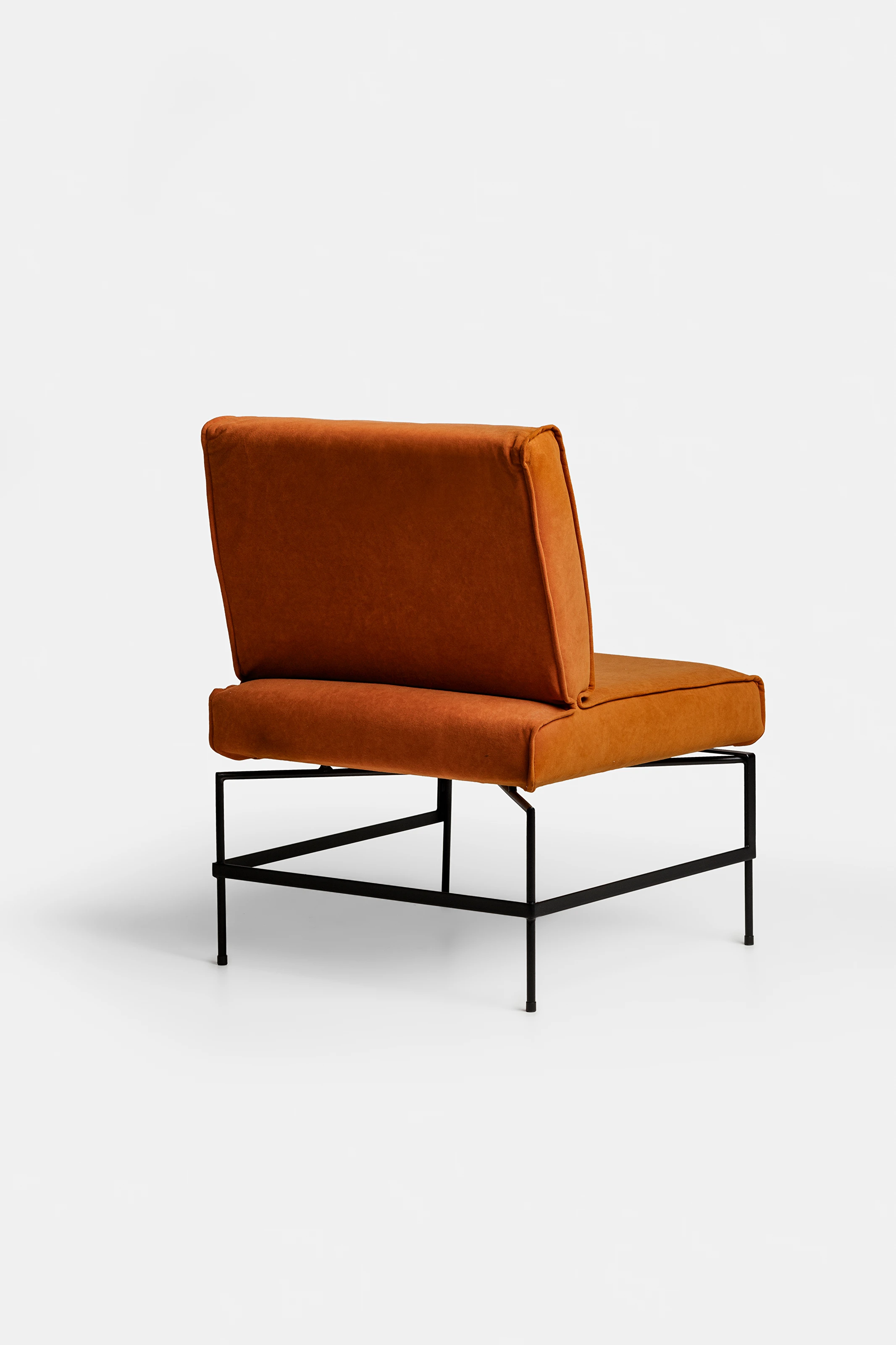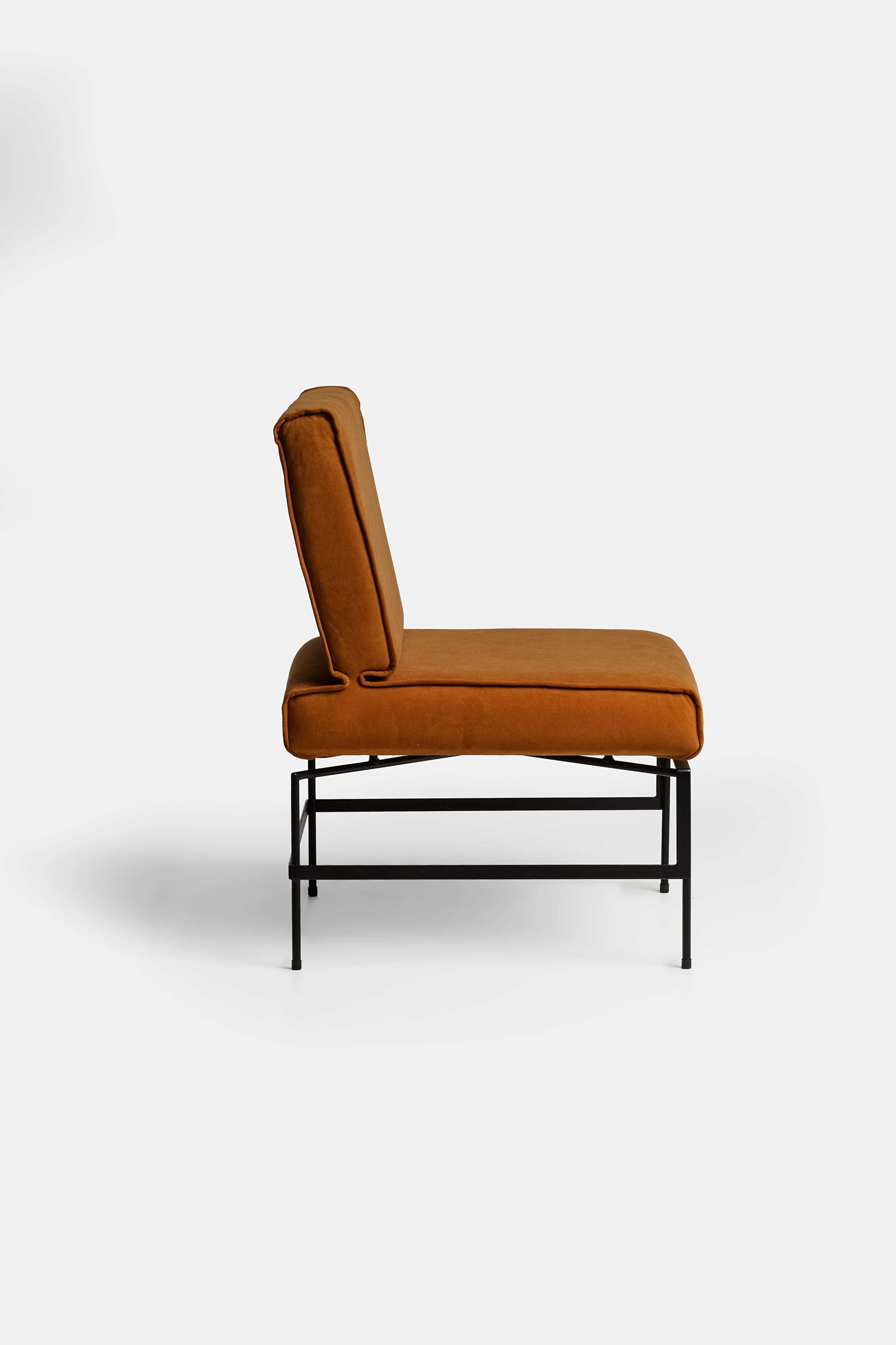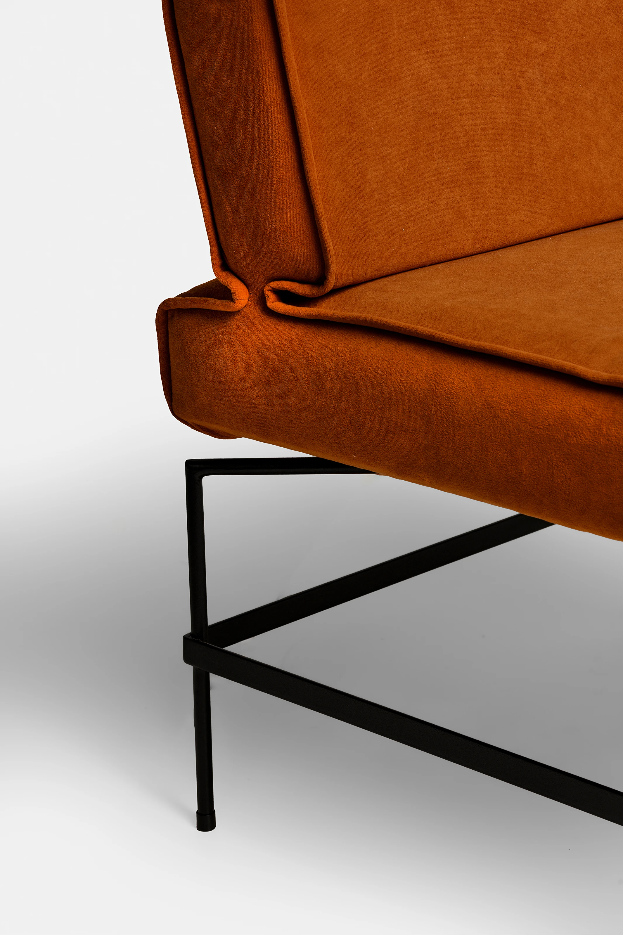 Estrutura em aço carbono com pintura epóxi, assento em madeira estofado com mix de espumas e mantas.