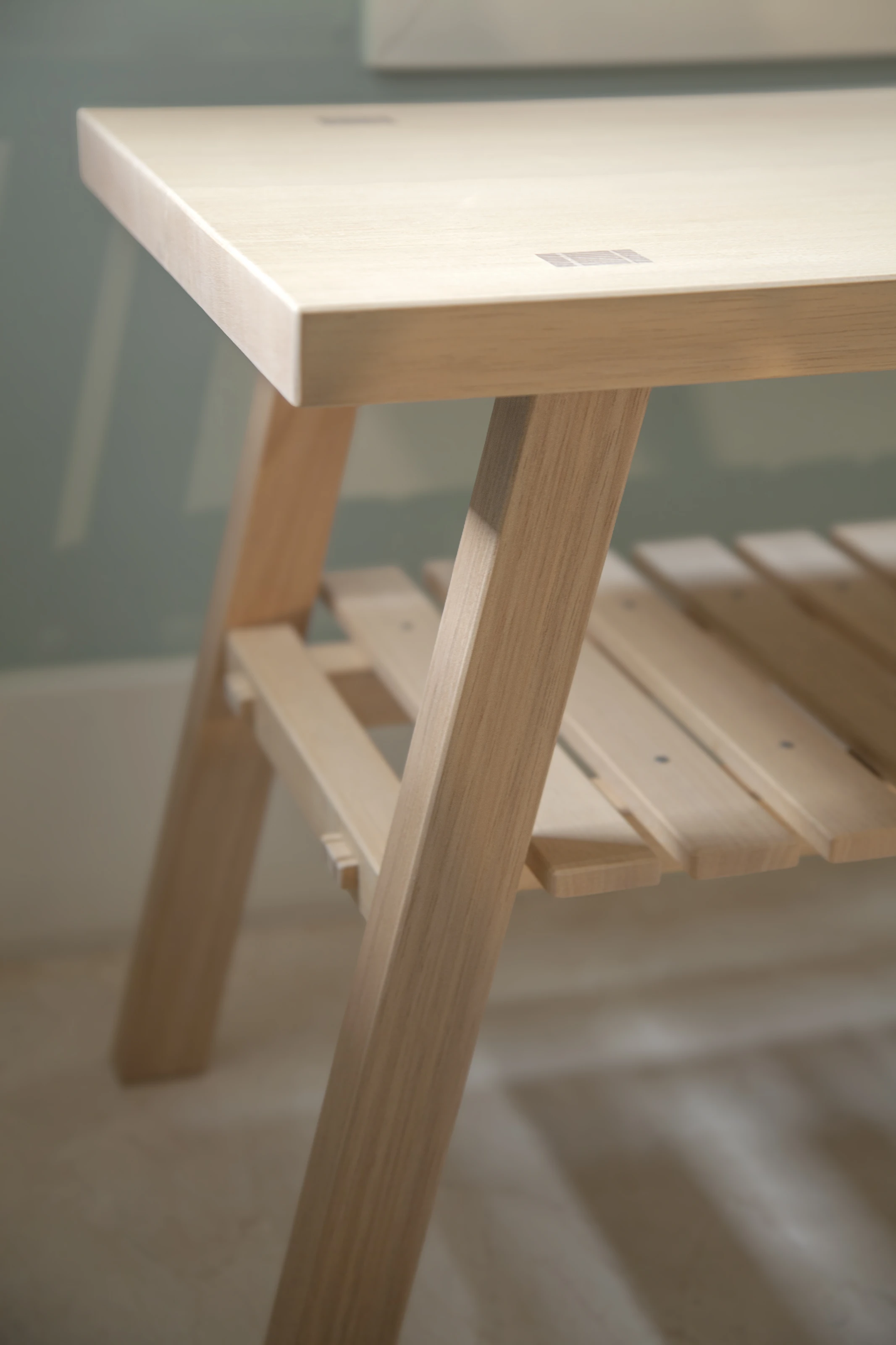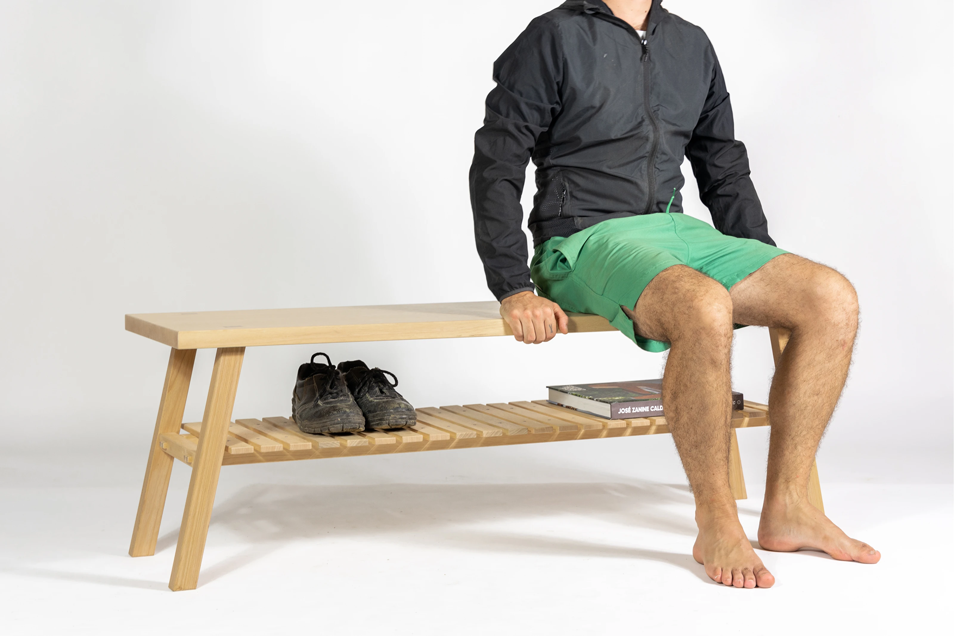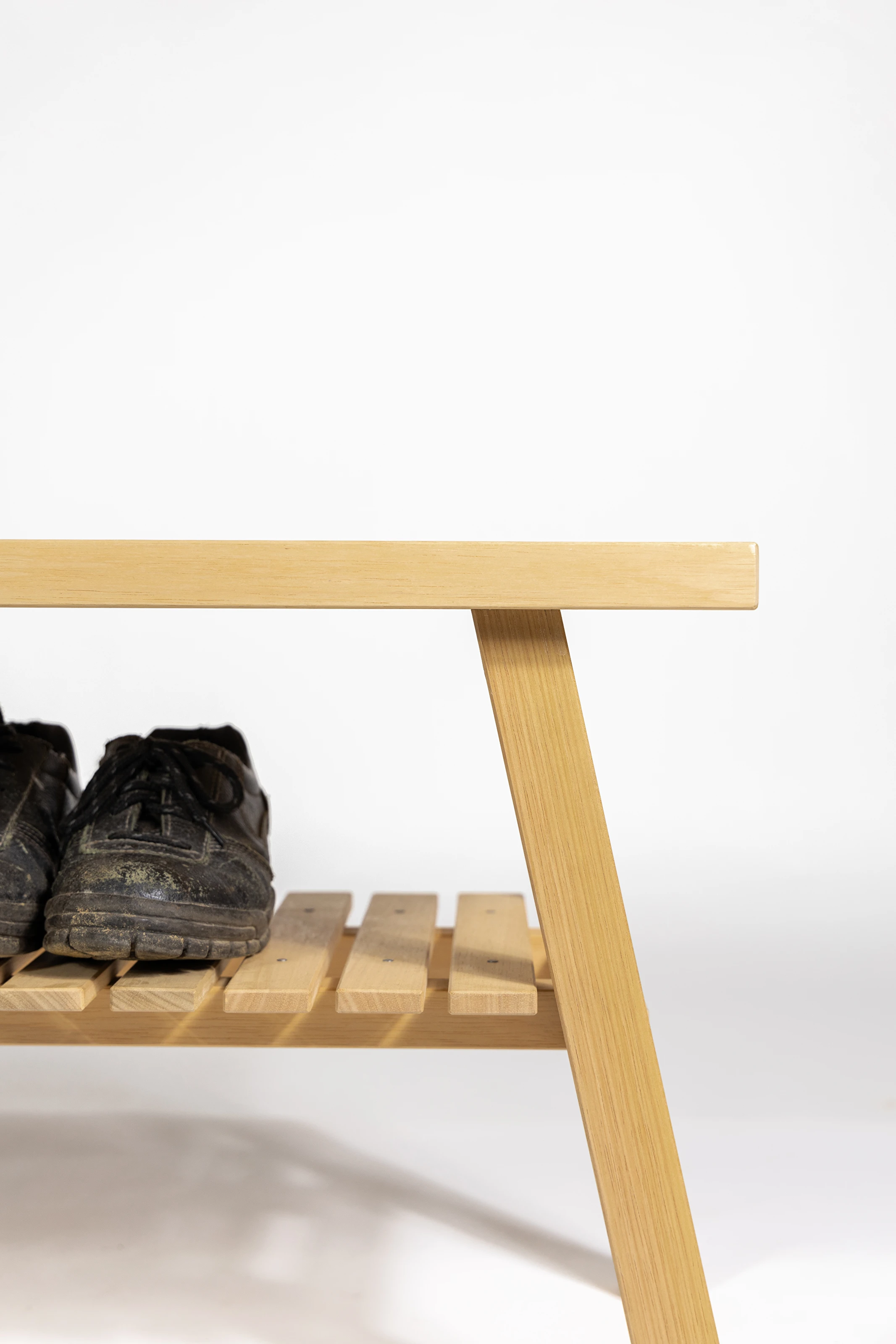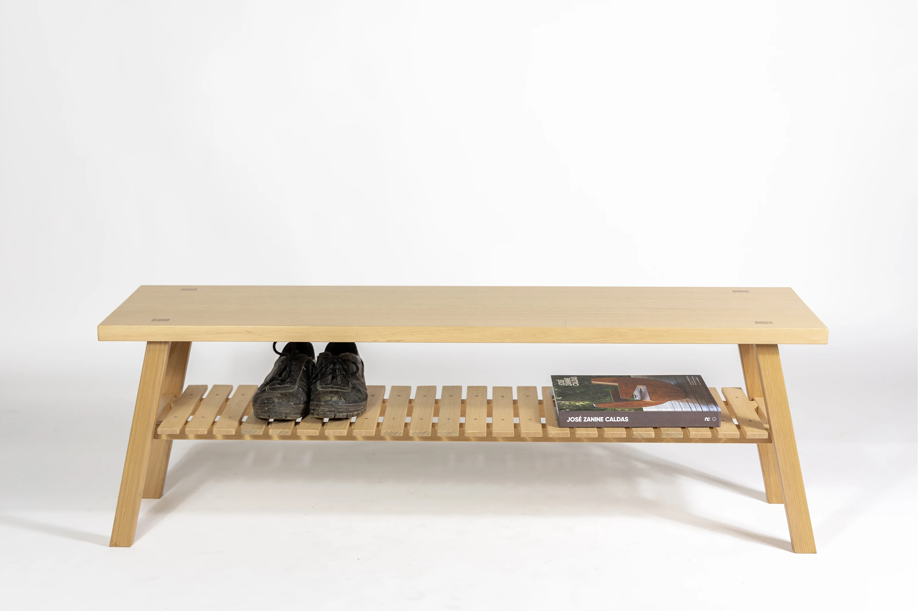 A Sapateira Kono possui um desenho leve e versátil que faz com que ela não seja apenas uma sapateira armazenadora de calçados mas também e um banco confortável para trocas de sapato e repouso no dia-a-dia. Construída em Tauari, madeira de tom muito leve que, com acabamento em verniz à base d'água, preserva sua coloração e fica bem gostoso ao toque.