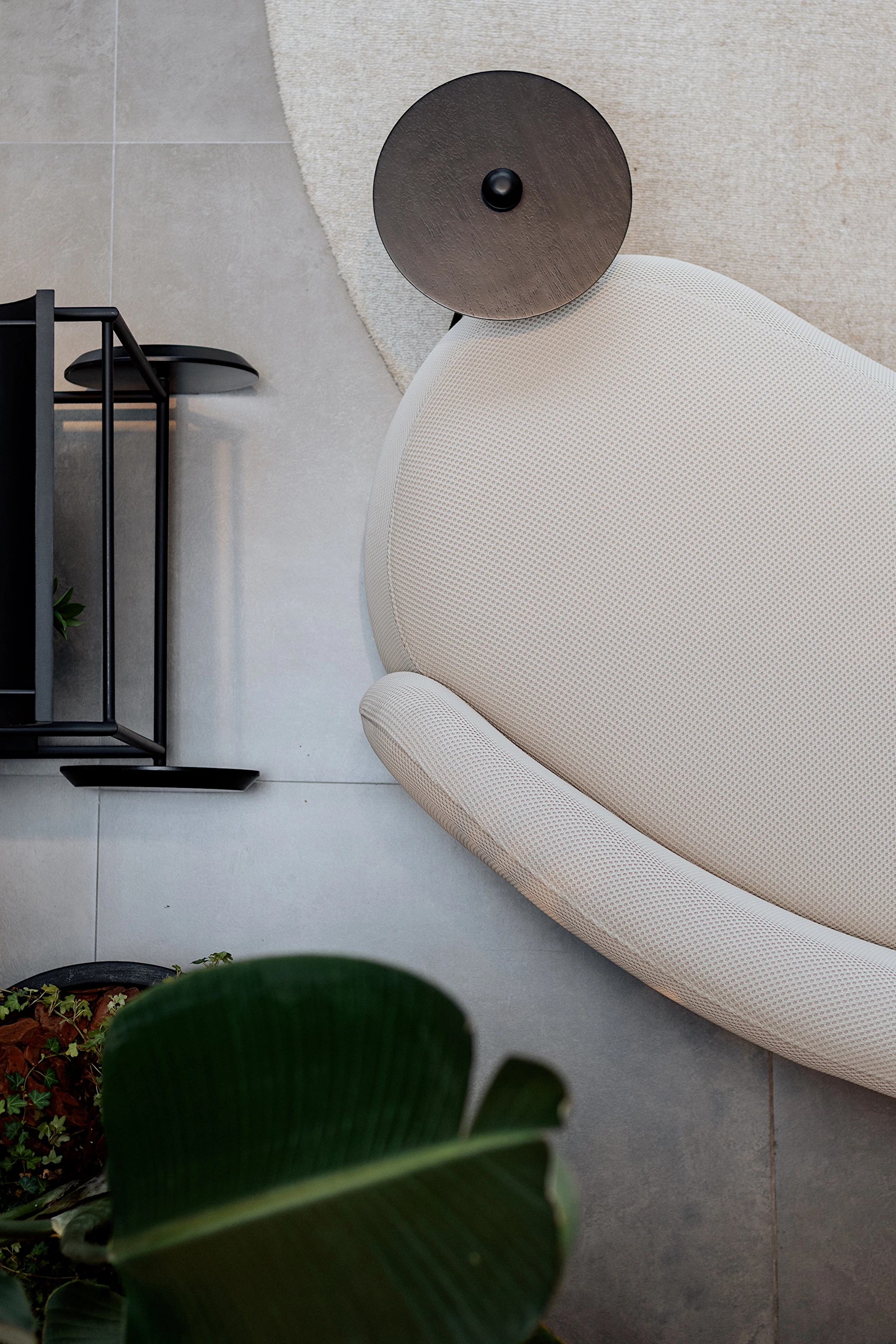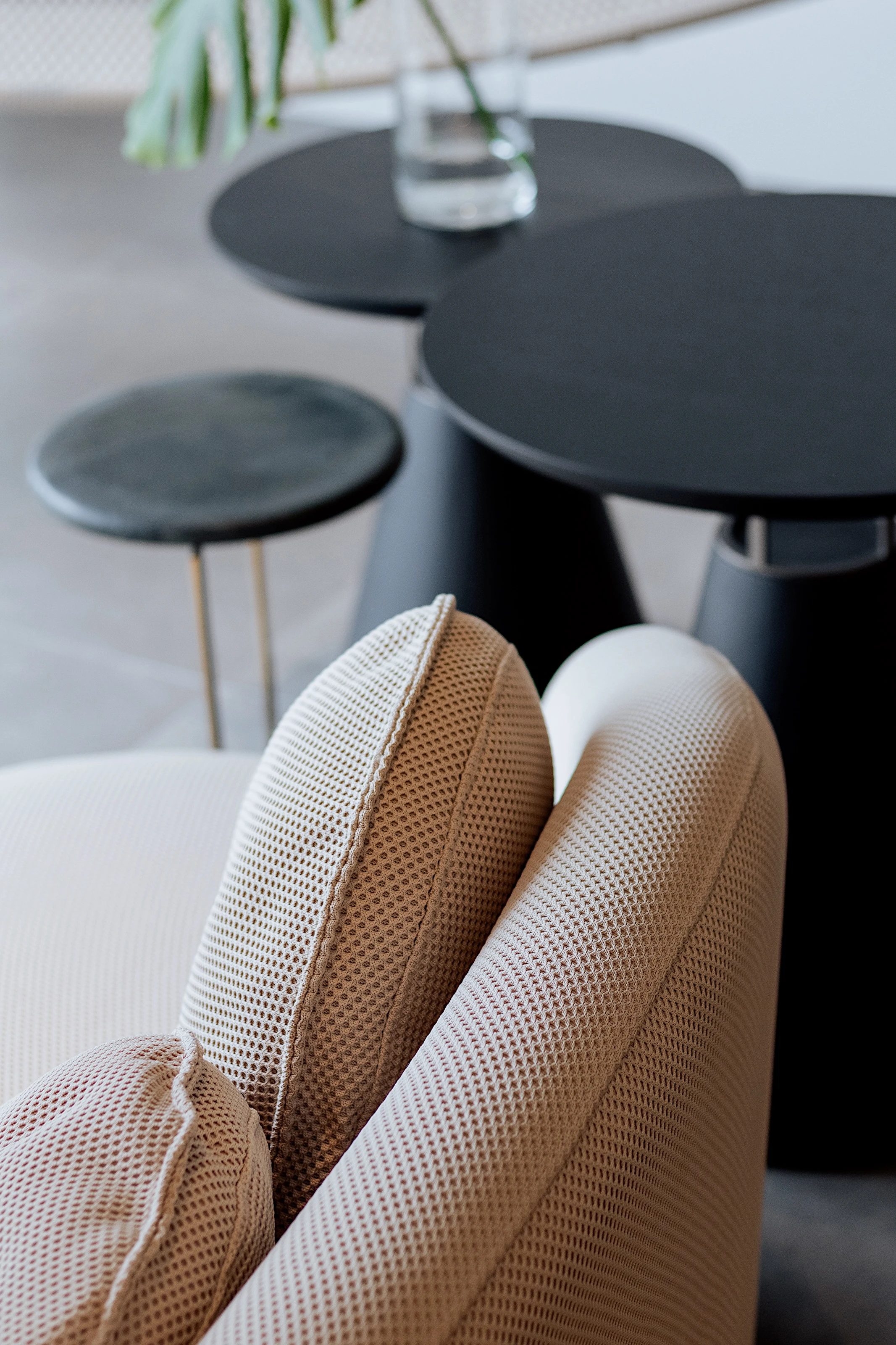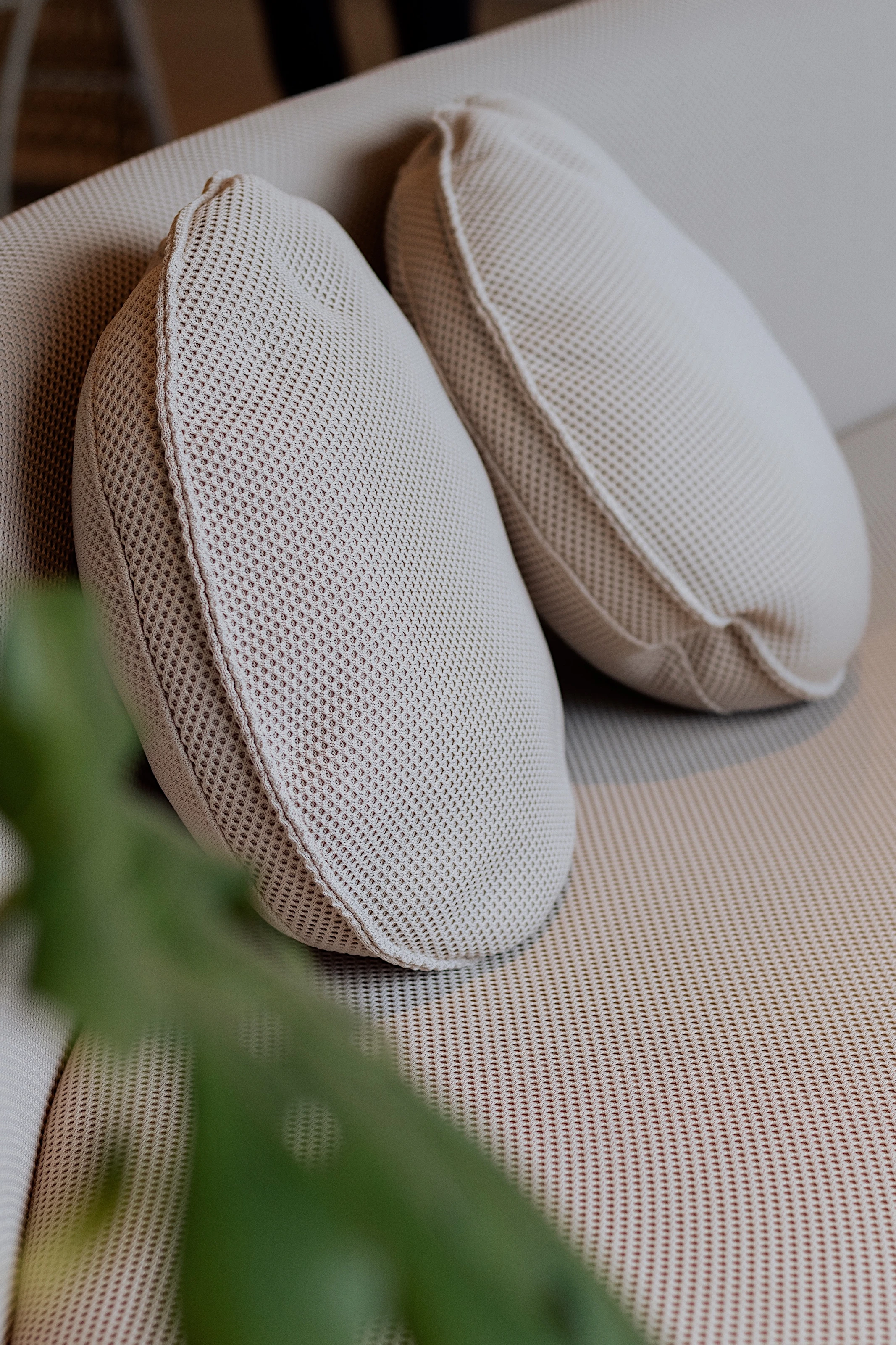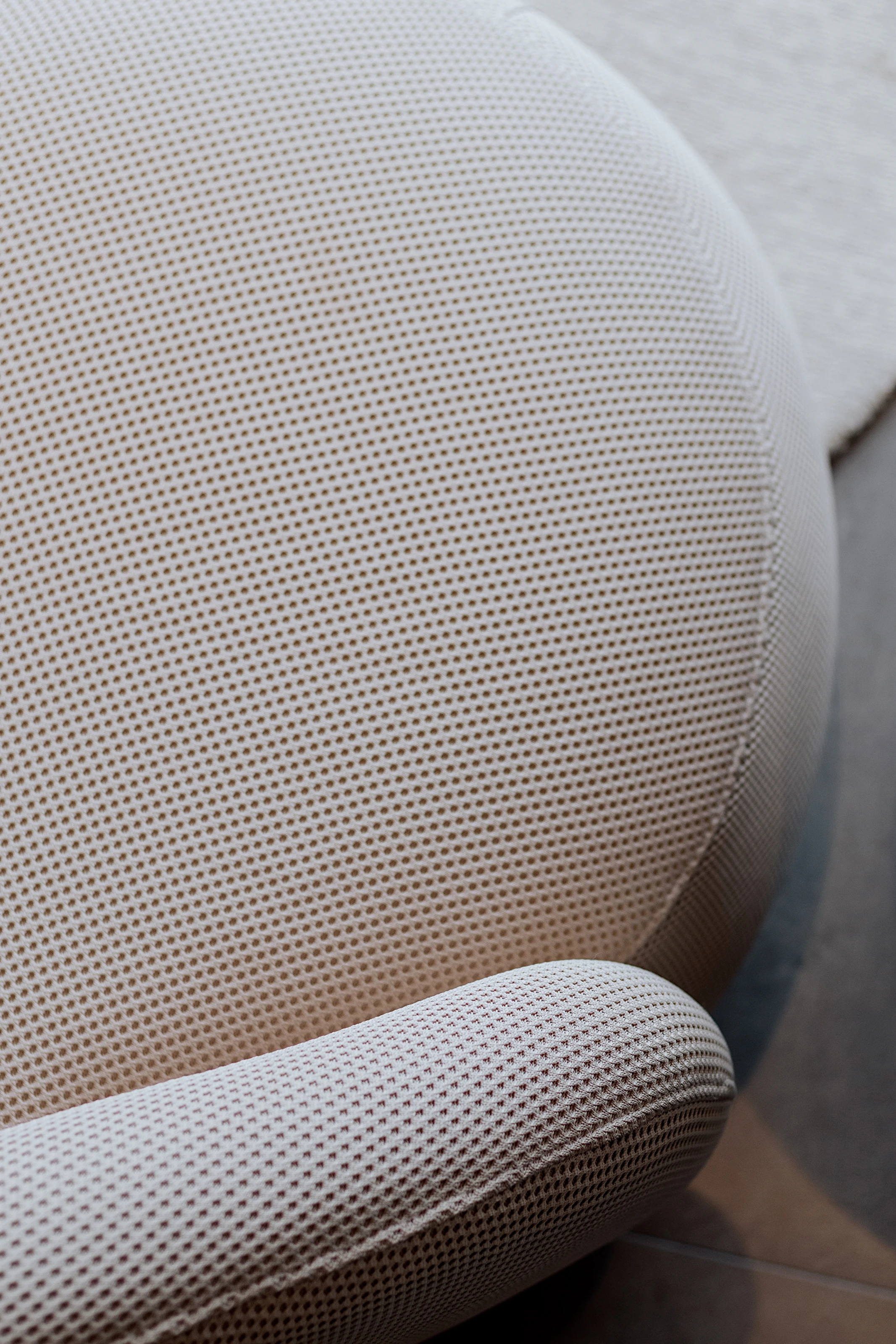 O sofá foi desenhado com formas orgânicas e puras.  Revestido com tecido ecológico, a malha KNIT PET, que possui toque aprimorado fabricado com matéria-prima composta por garrafas PET coletadas manualmente em áreas dentro de 50km da costa oceânica, onde não há sistema formal de coleta de lixo ou reciclagem. Cada metro quadrado do tecido produzido é reaproveitado e retirado na natureza aproximadamente 41 garrafas.