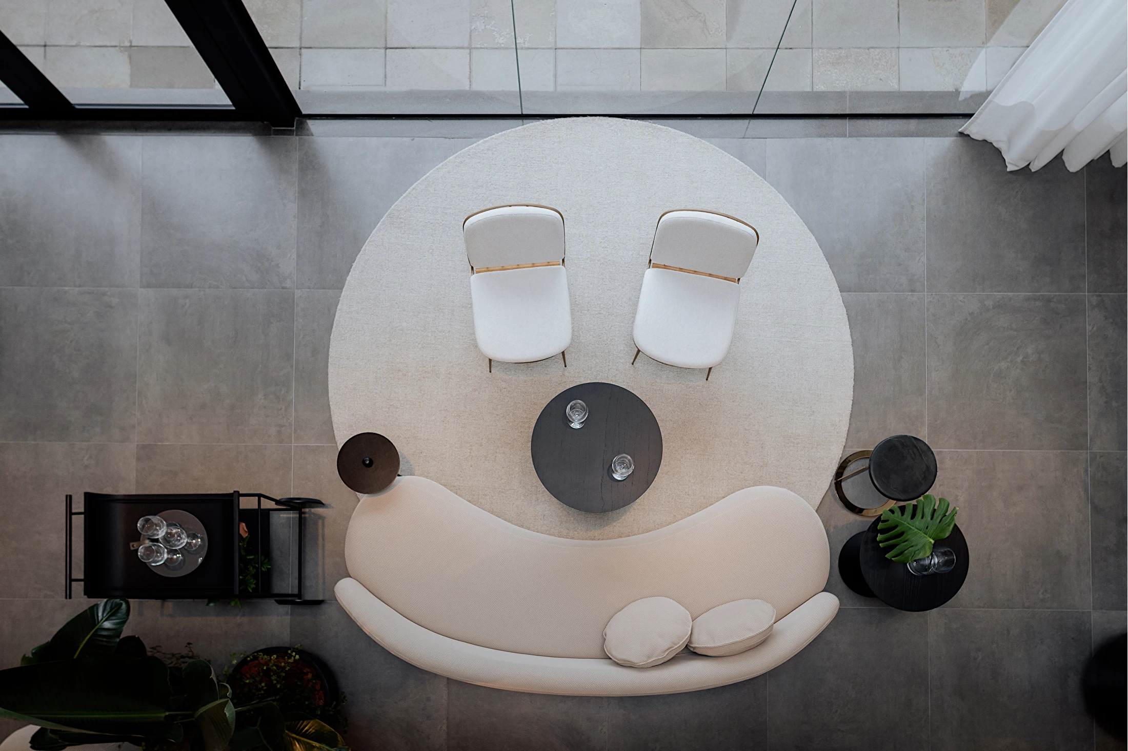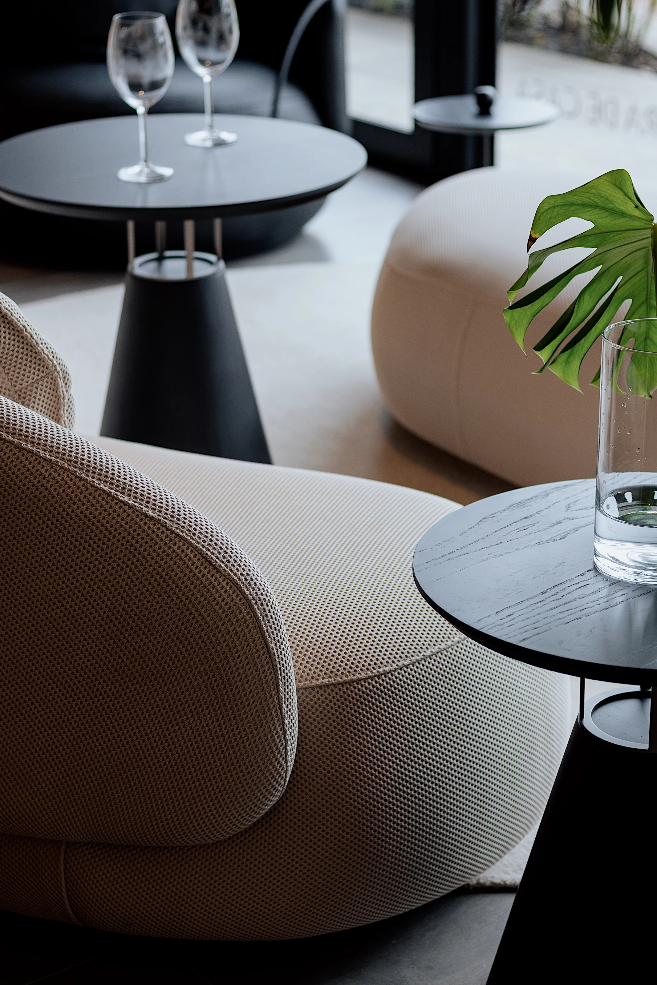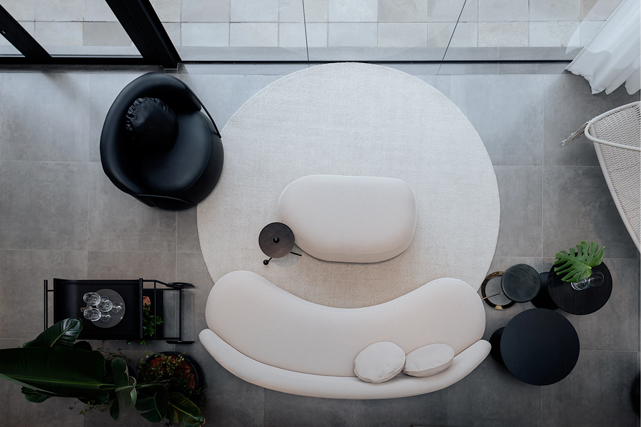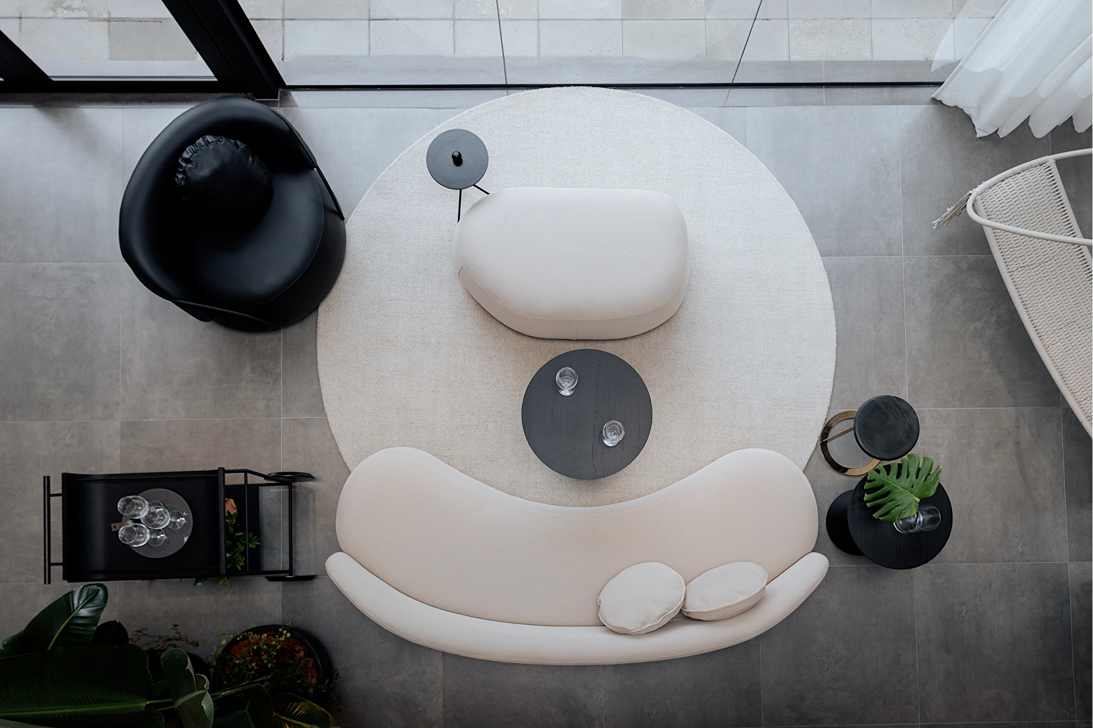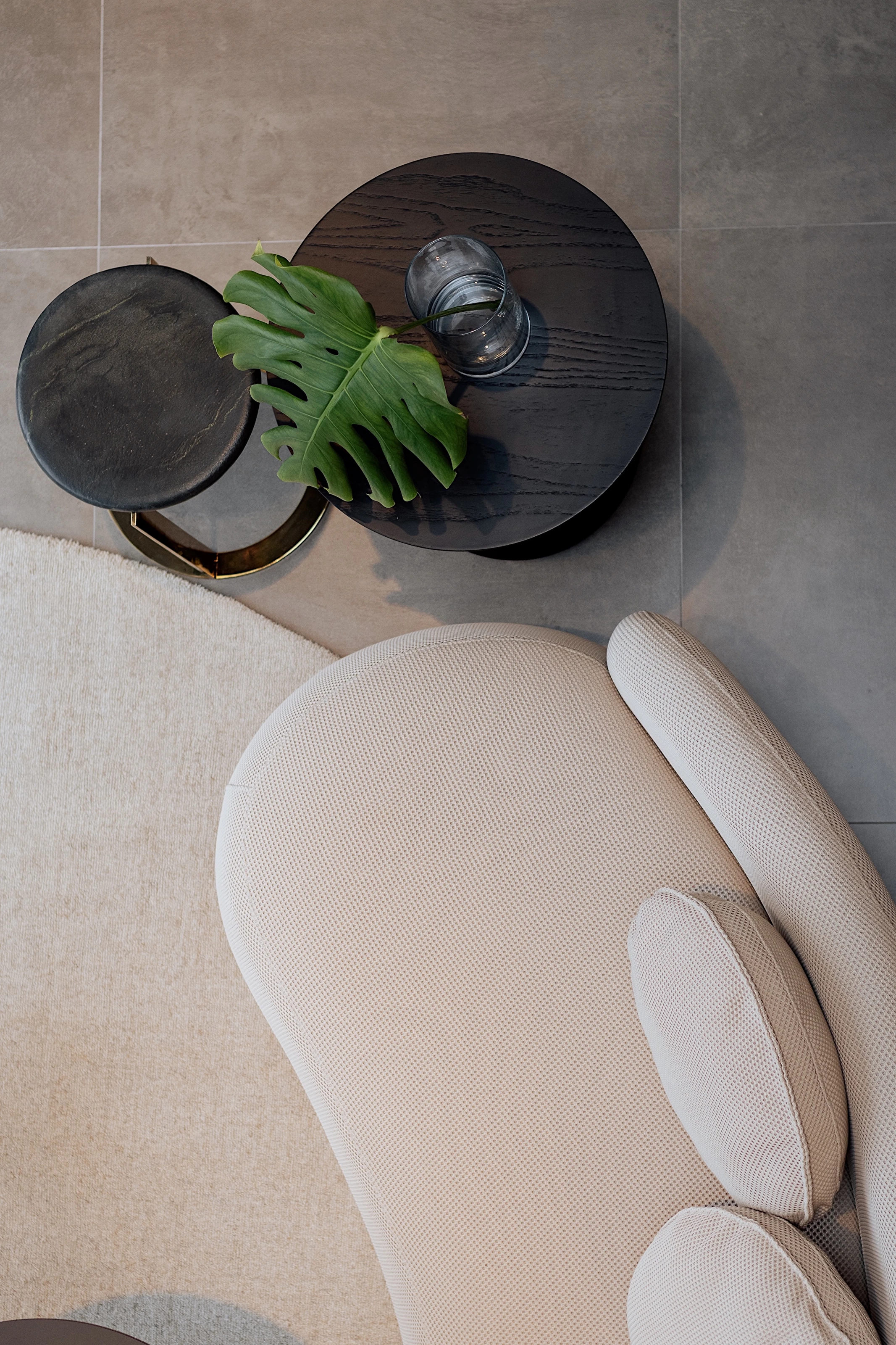 O sofá foi desenhado com formas orgânicas e puras.  Revestido com tecido ecológico, a malha KNIT PET, que possui toque aprimorado fabricado com matéria-prima composta por garrafas PET coletadas manualmente em áreas dentro de 50km da costa oceânica, onde não há sistema formal de coleta de lixo ou reciclagem. Cada metro quadrado do tecido produzido é reaproveitado e retirado na natureza aproximadamente 41 garrafas.