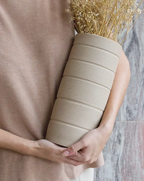 Vaso produzido no torno com forma cilíndrica e linhas horizontais ritmadas, com acabamento natural, que compõem um visual minimalista nada óbvio. Aquele básico que nunca erra, sua forma elegante e atemporal é perfeita para complementar a decoração de sua casa.
