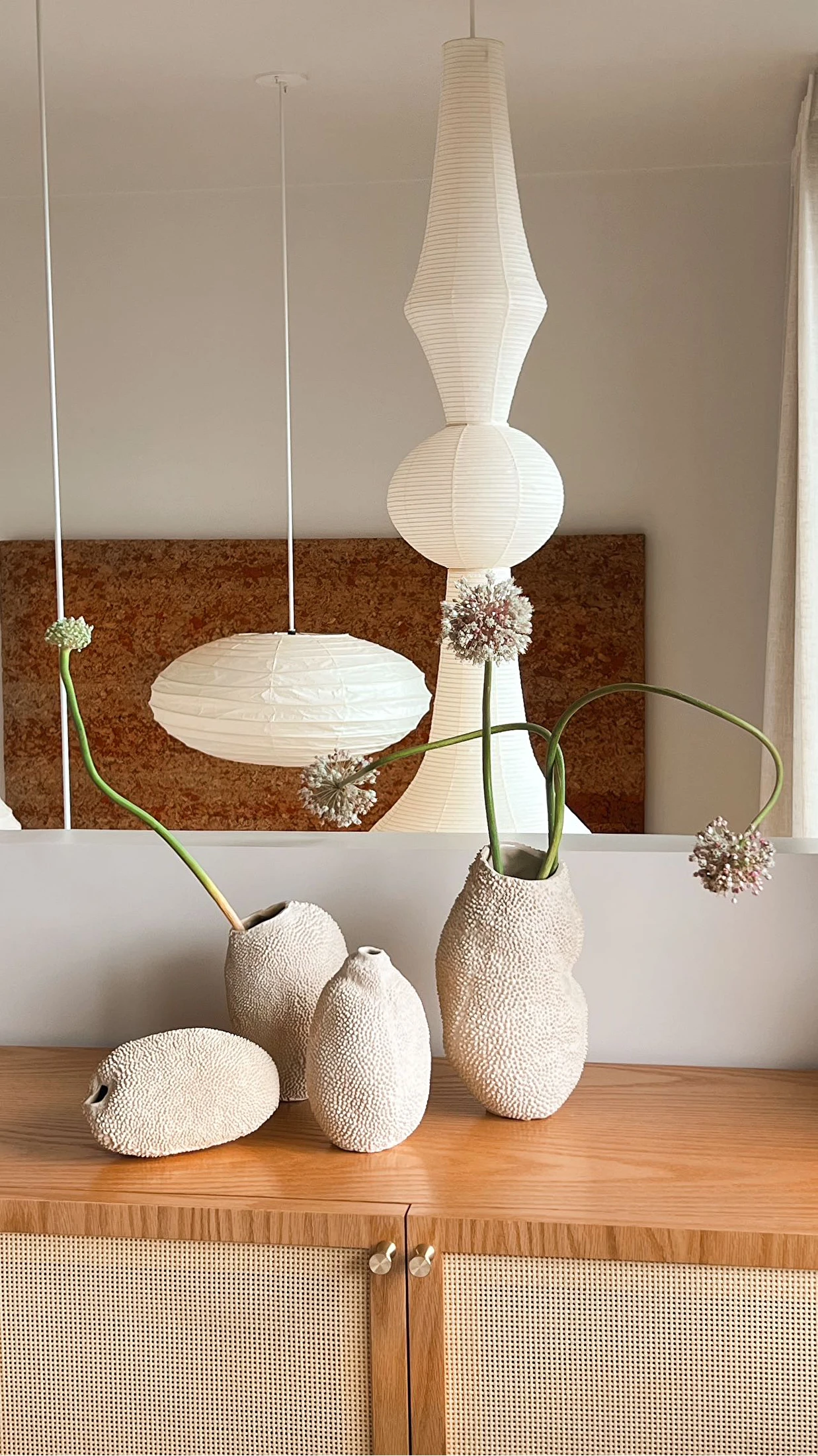 Vaso grande com exterior estruturado em jaca assimétrica orgânica. Esta peça pode ser usada como um complemento escultural para qualquer espaço, ou o recipiente perfeito para flores secas ou frescas. O trabalho de Hanna imortaliza as formas orgânicas da natureza e destaca a beleza de sua imperfeição; cada peça tem uma forma e um tamanho, pois os moldes são feitos a partir de frutas reais. Hanna é natural de Estocolmo, Suécia e vive no Rio de Janeiro. sua inspiração é a mistura destes dois universos, refletidos em um trabalho com cores suaves e texturas diversas e simples.