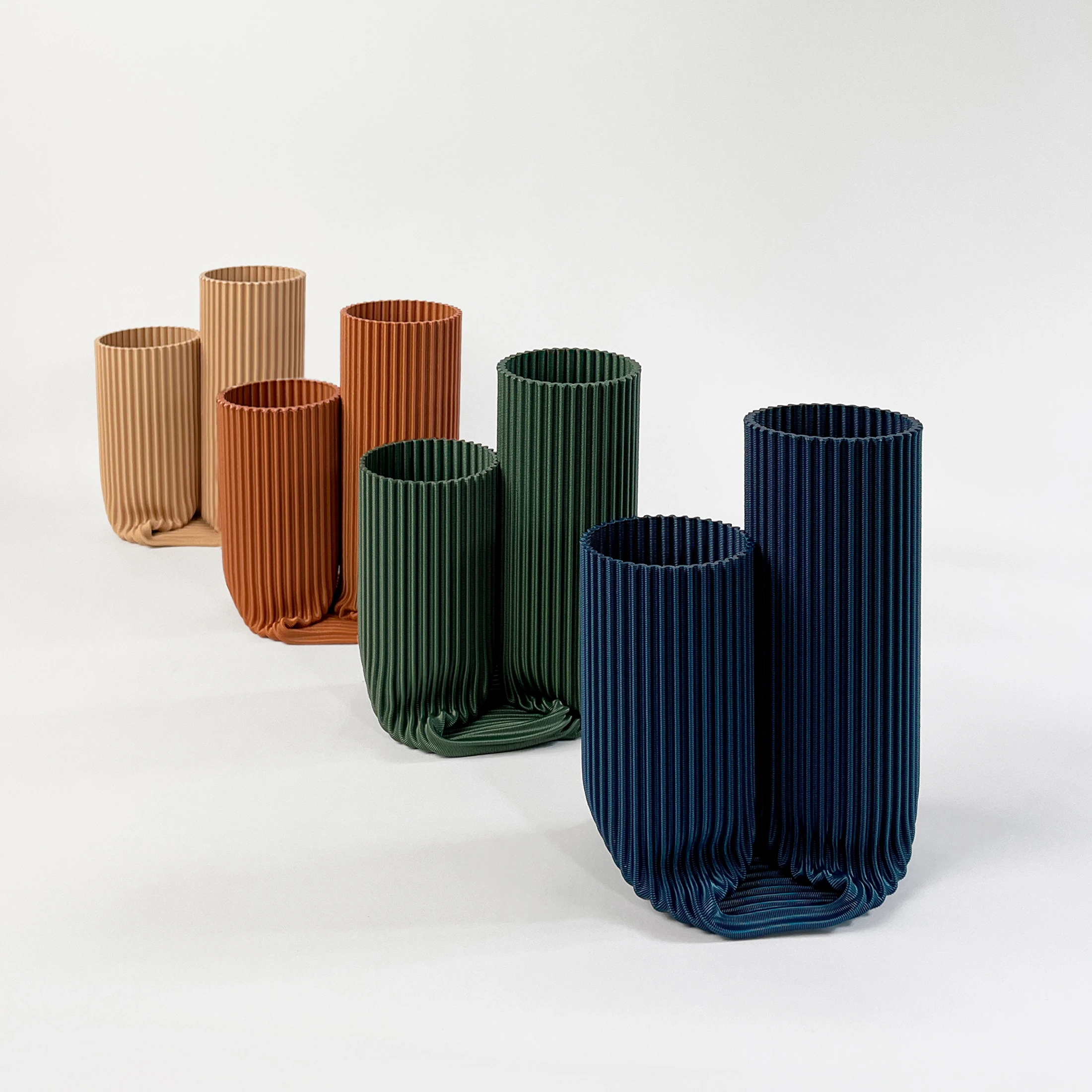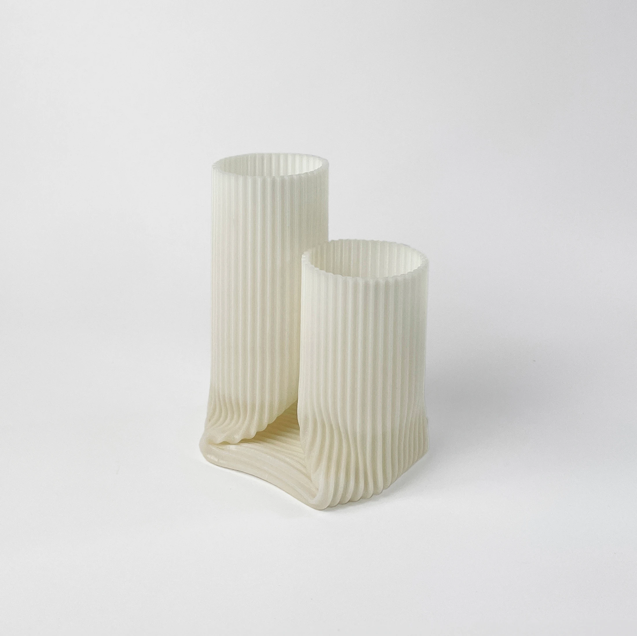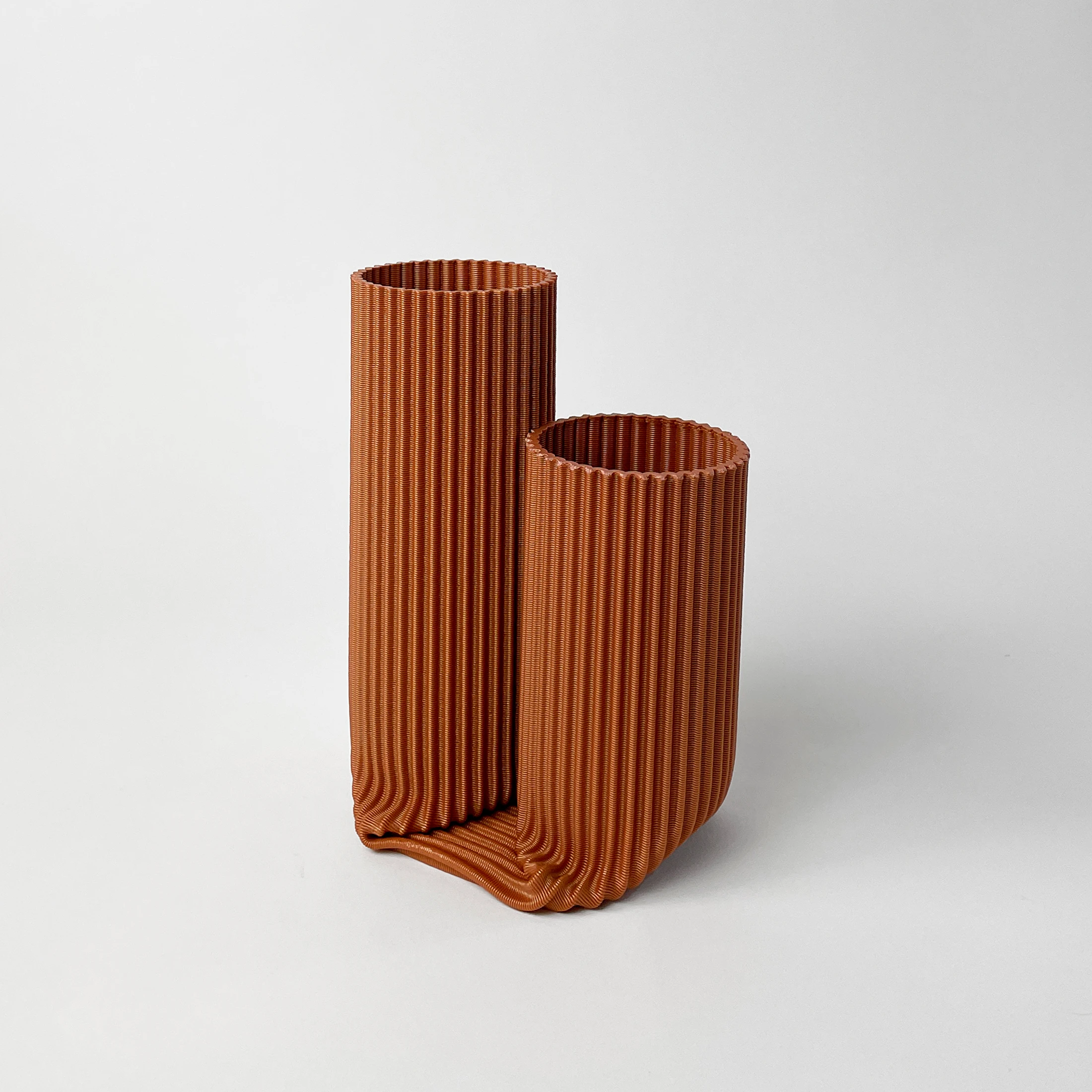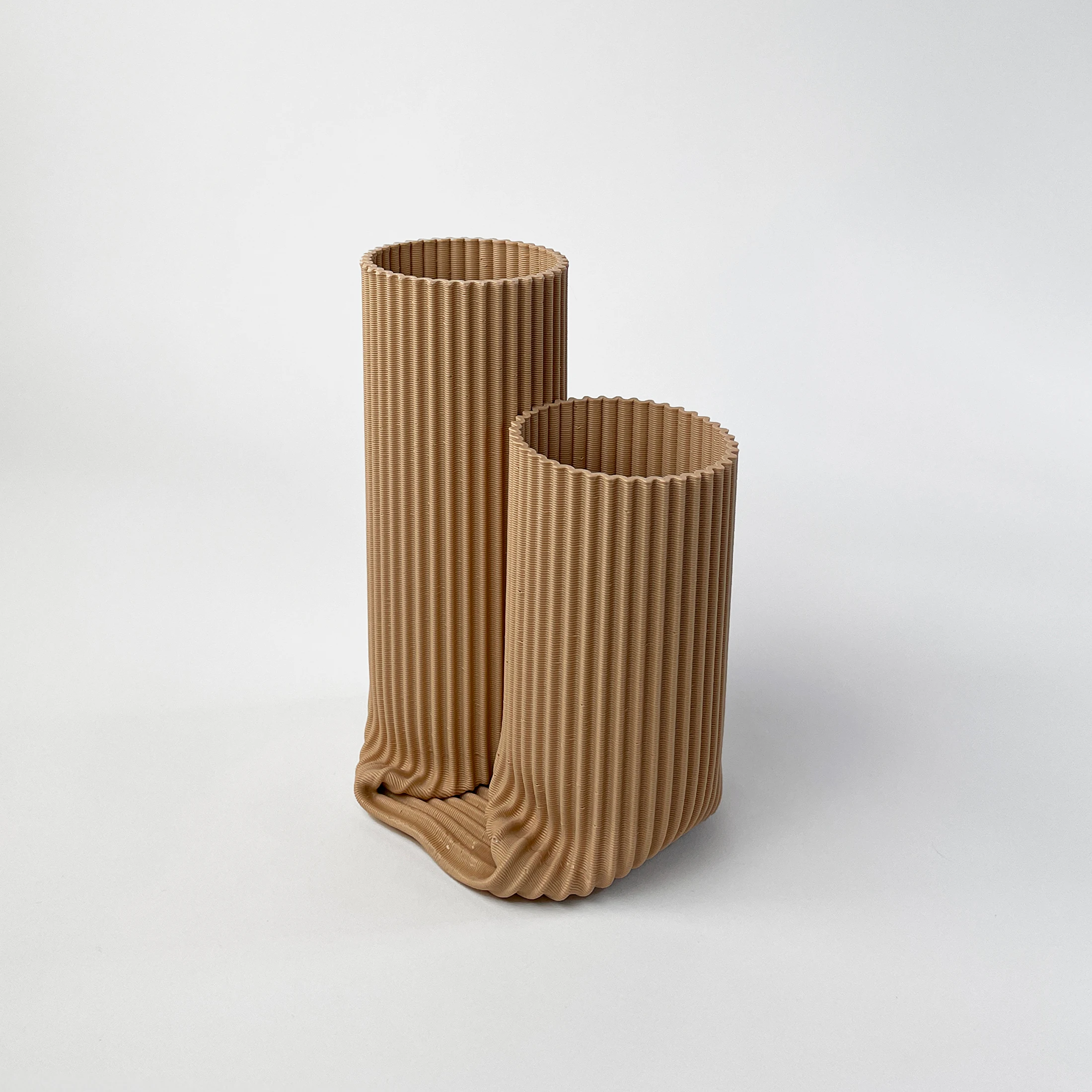 Vaso com duas bocas e textura canelada, criação exclusiva É Pedra Ateliê. Produto feito com impressão 3D em bioplástico e dobrado manualmente. Cada peça é única, modelada pelas mãos de artistas.