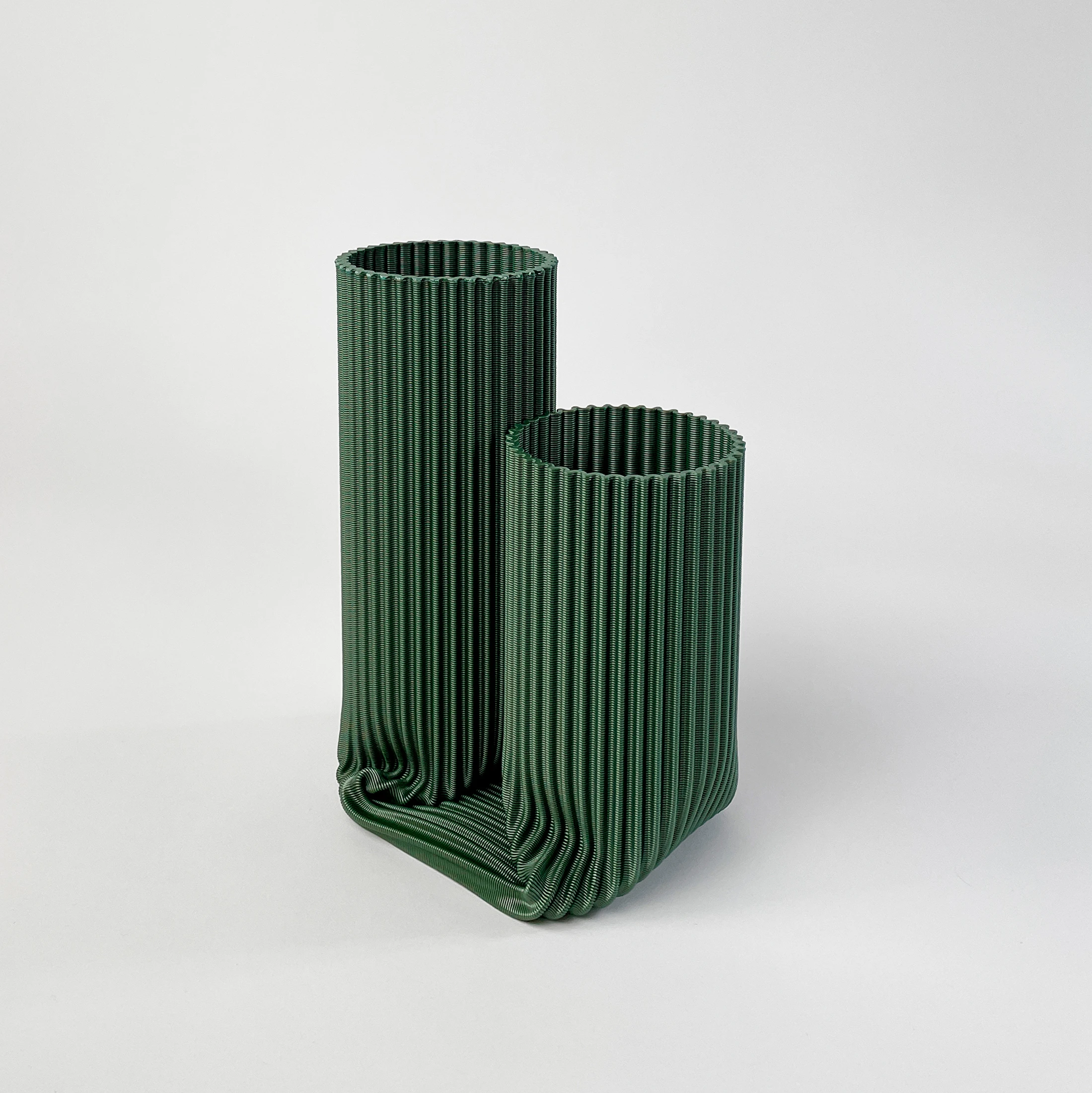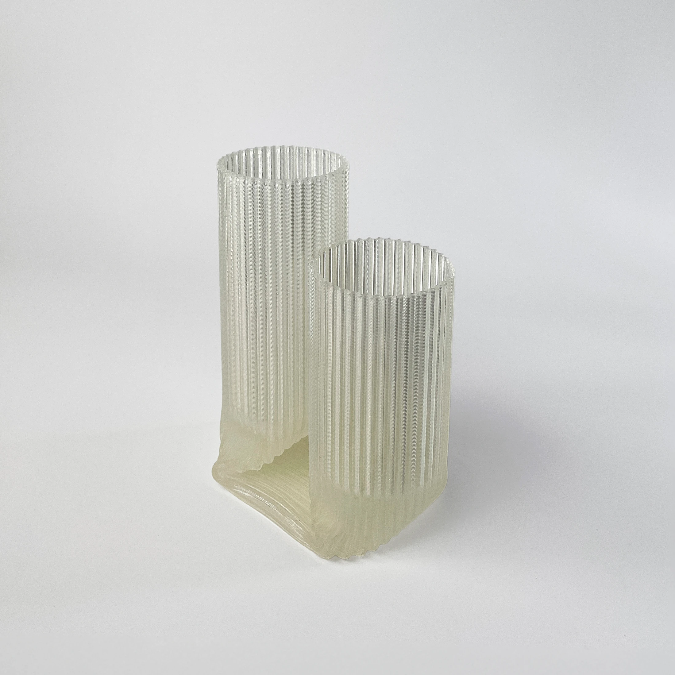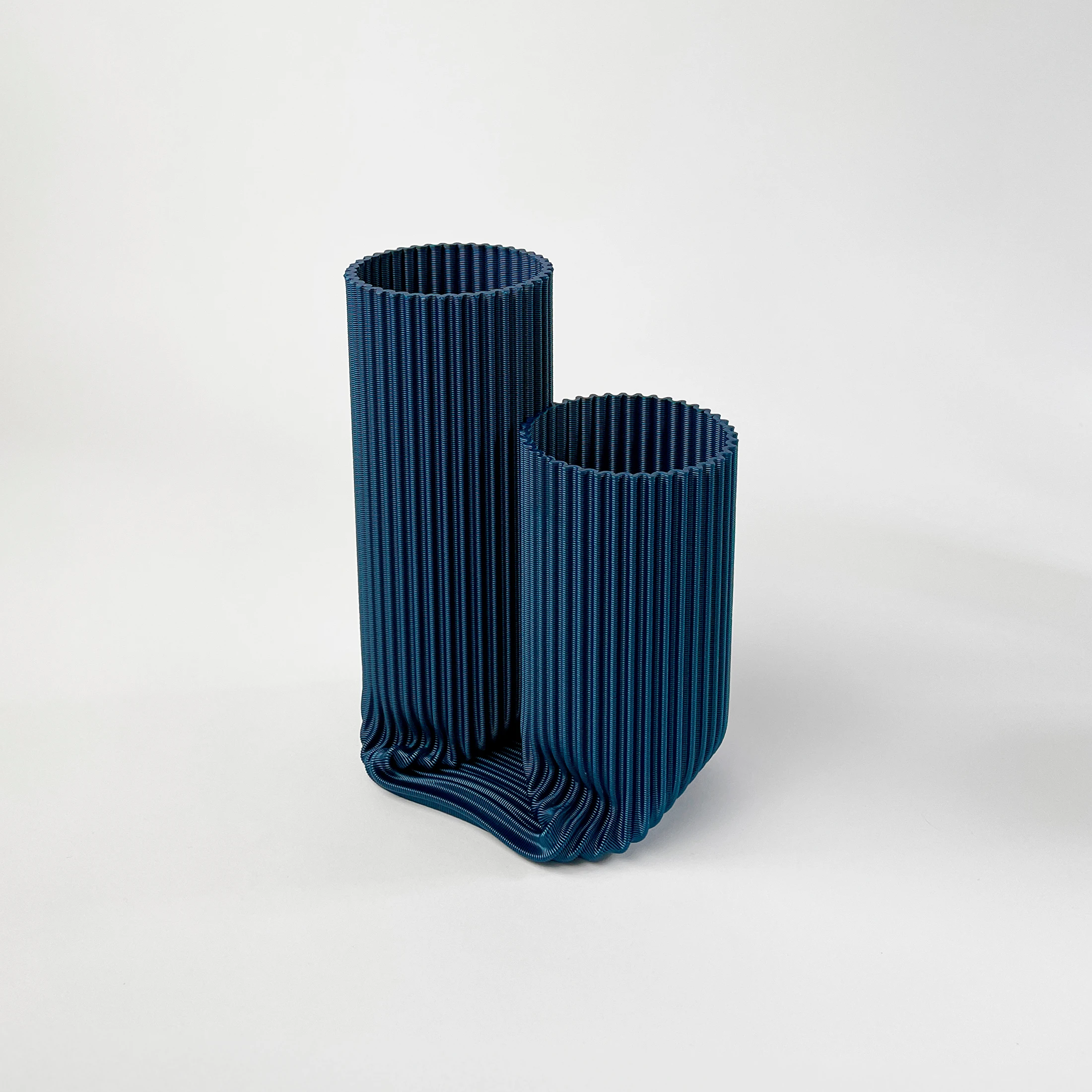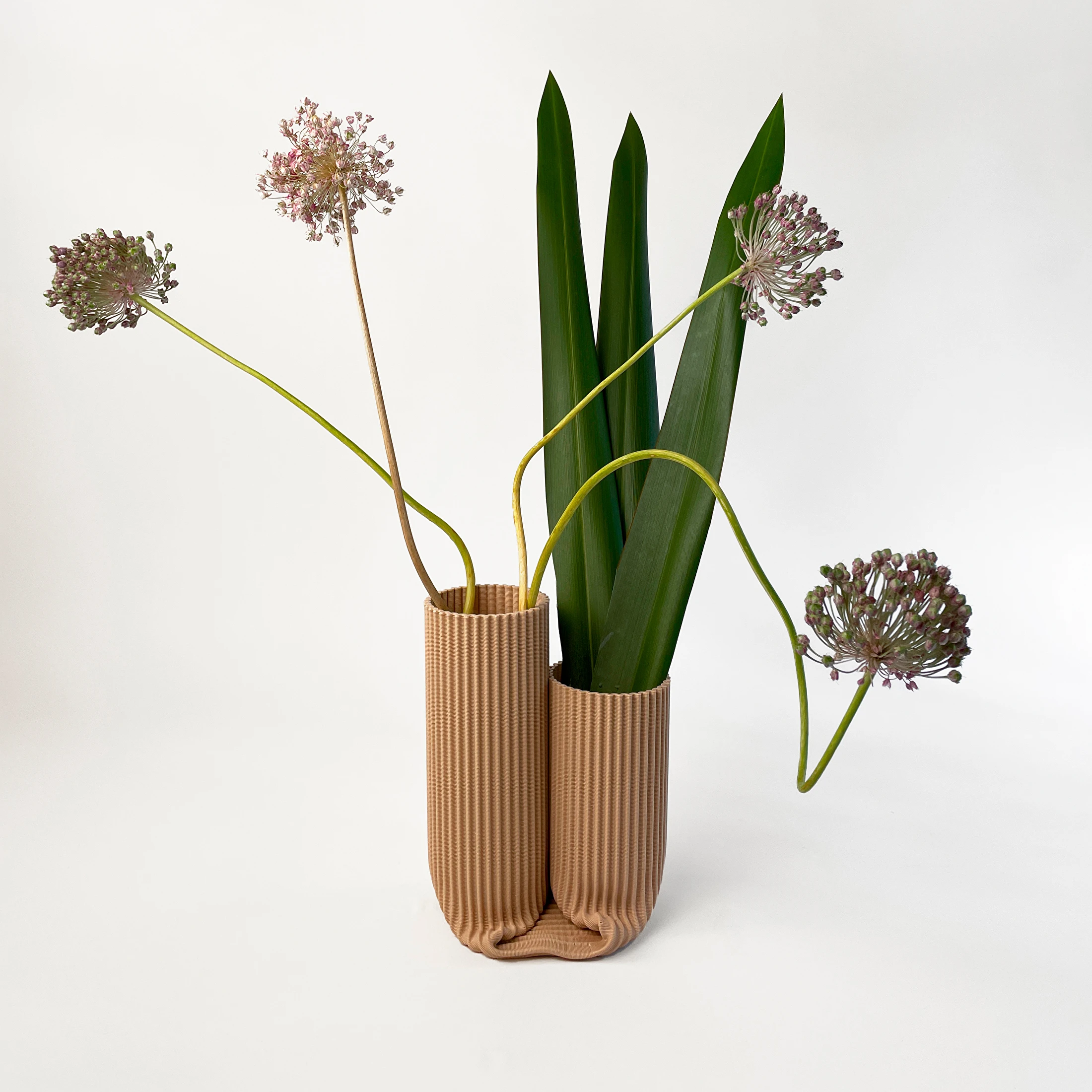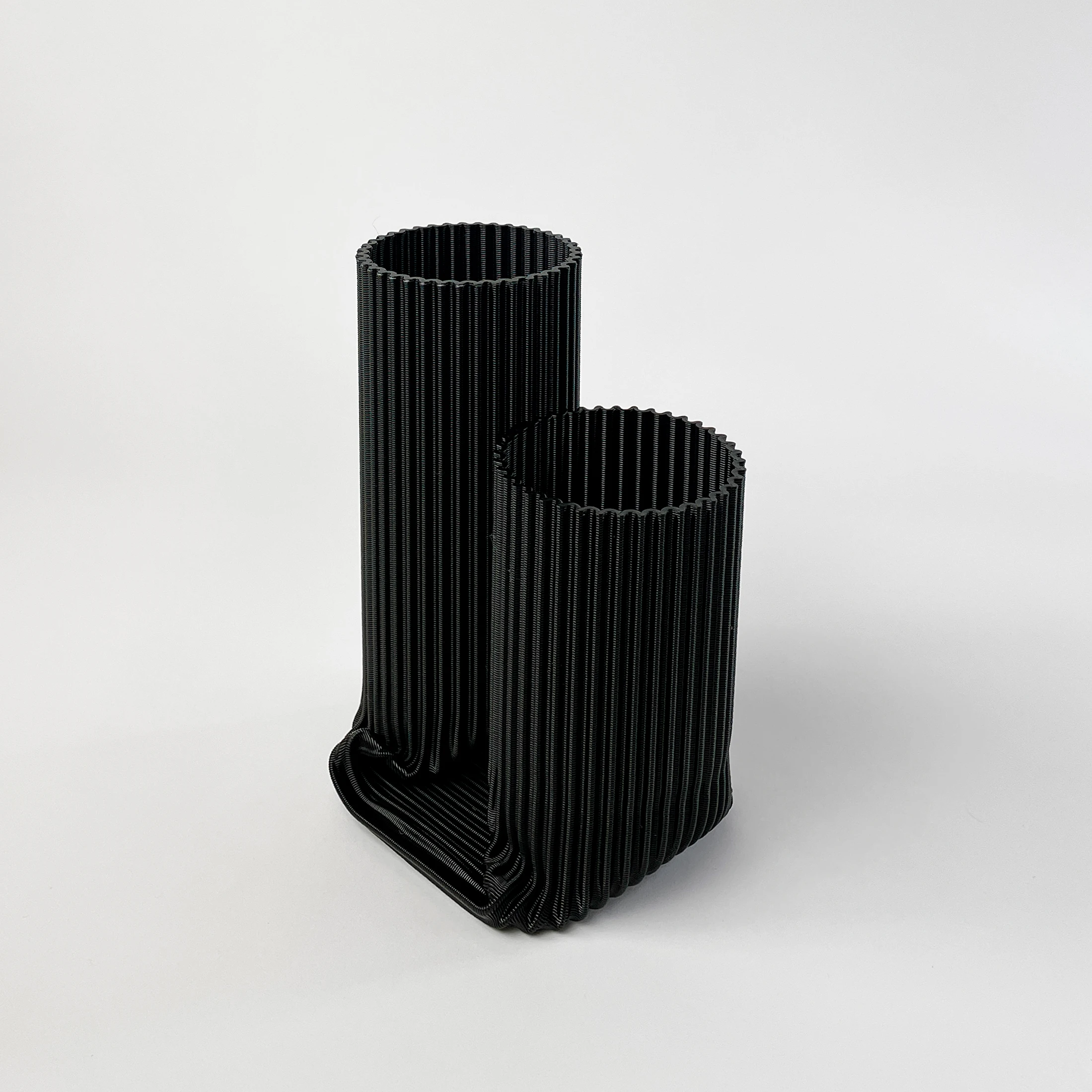 Vaso com duas bocas e textura canelada, criação exclusiva É Pedra Ateliê. Produto feito com impressão 3D em bioplástico e dobrado manualmente. Cada peça é única, modelada pelas mãos de artistas.
