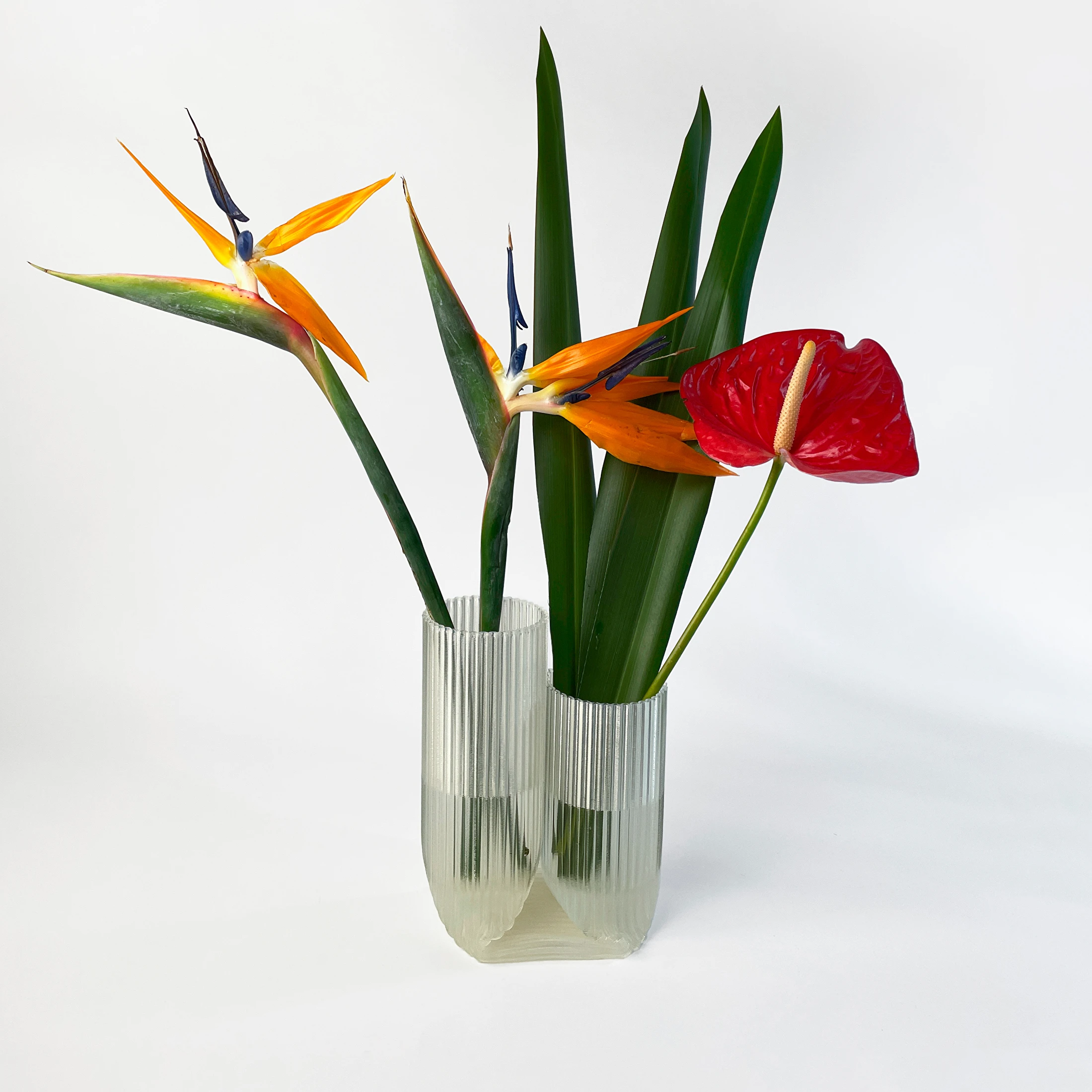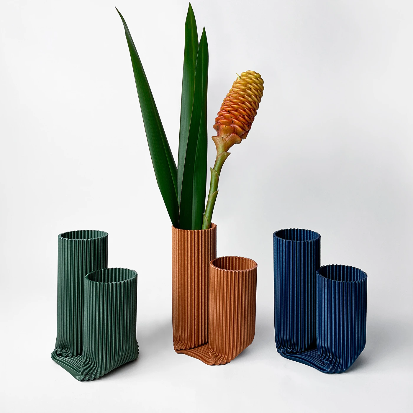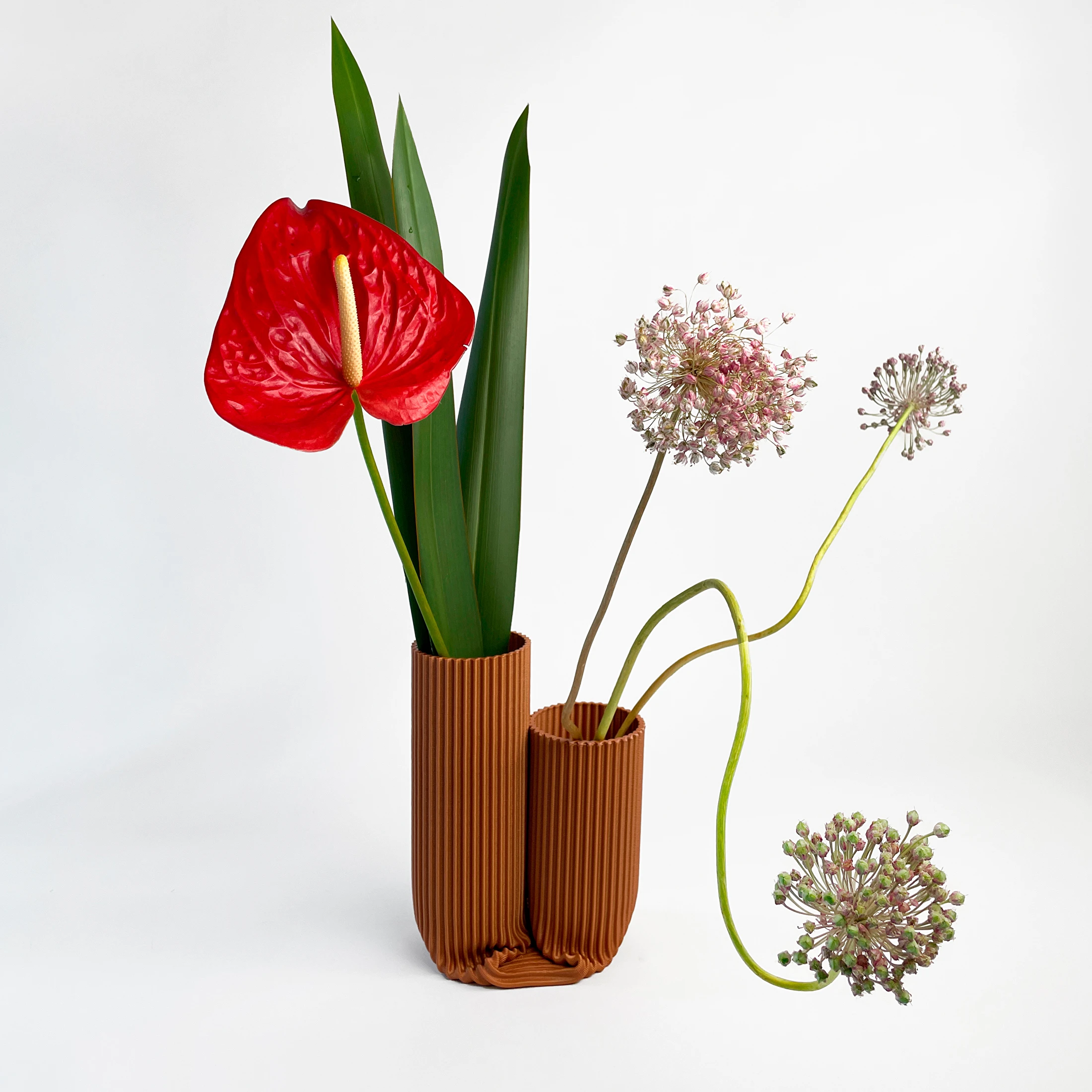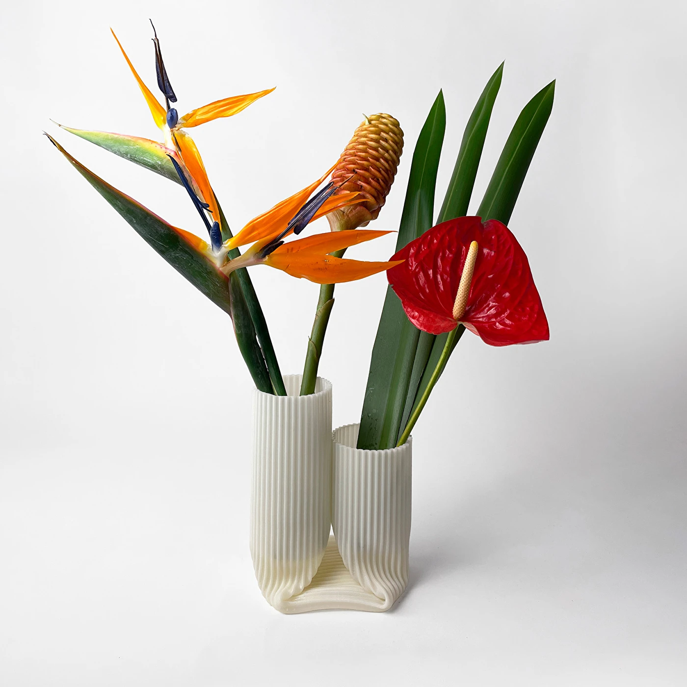 Vaso com duas bocas e textura canelada, criação exclusiva É Pedra Ateliê. Produto feito com impressão 3D em bioplástico e dobrado manualmente. Cada peça é única, modelada pelas mãos de artistas.