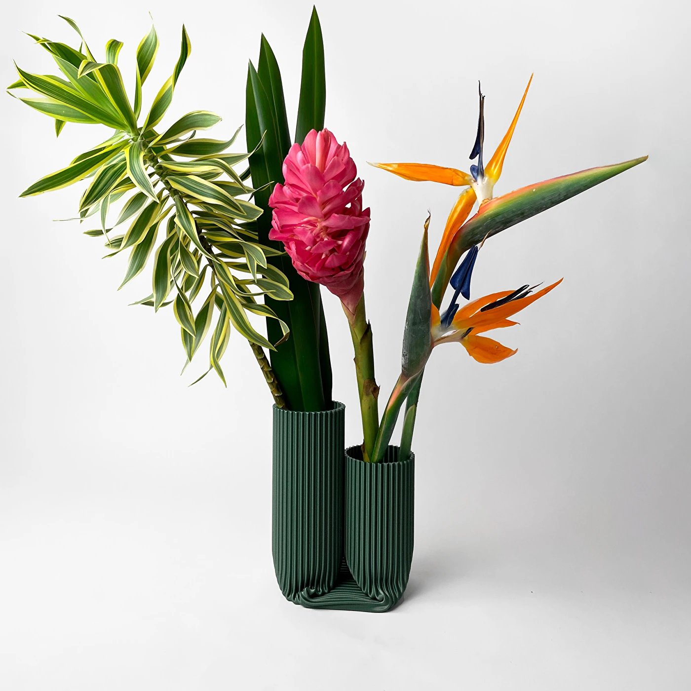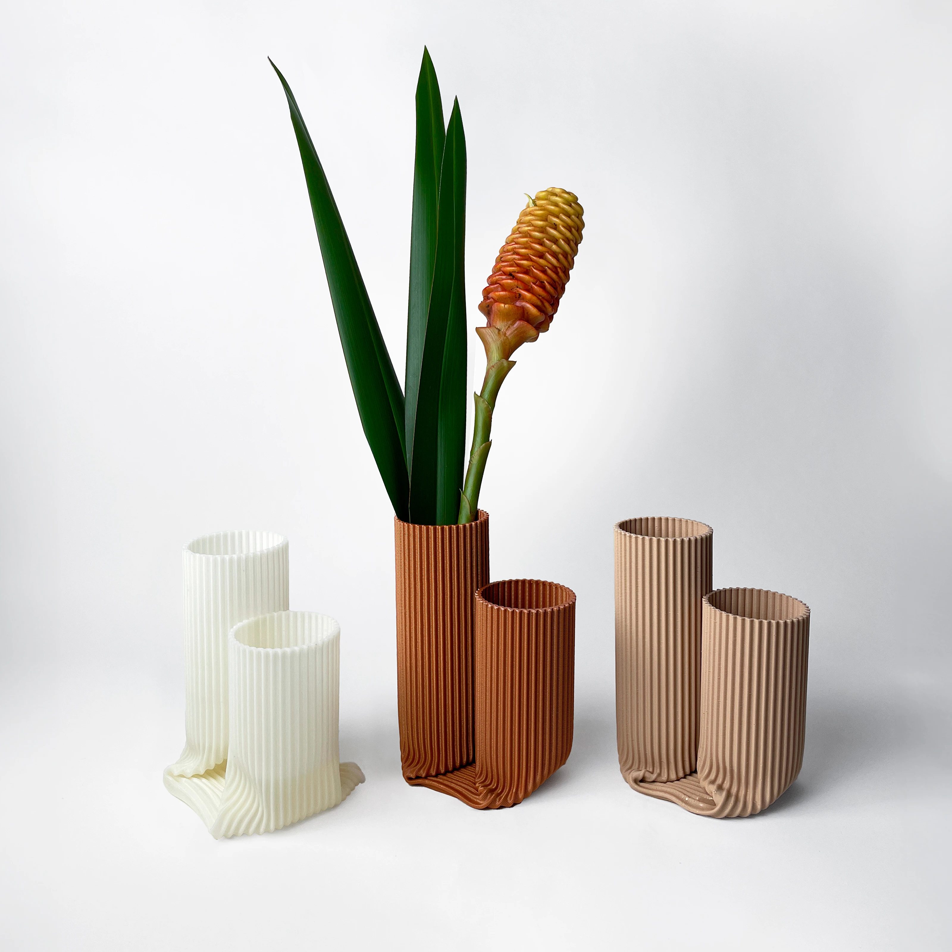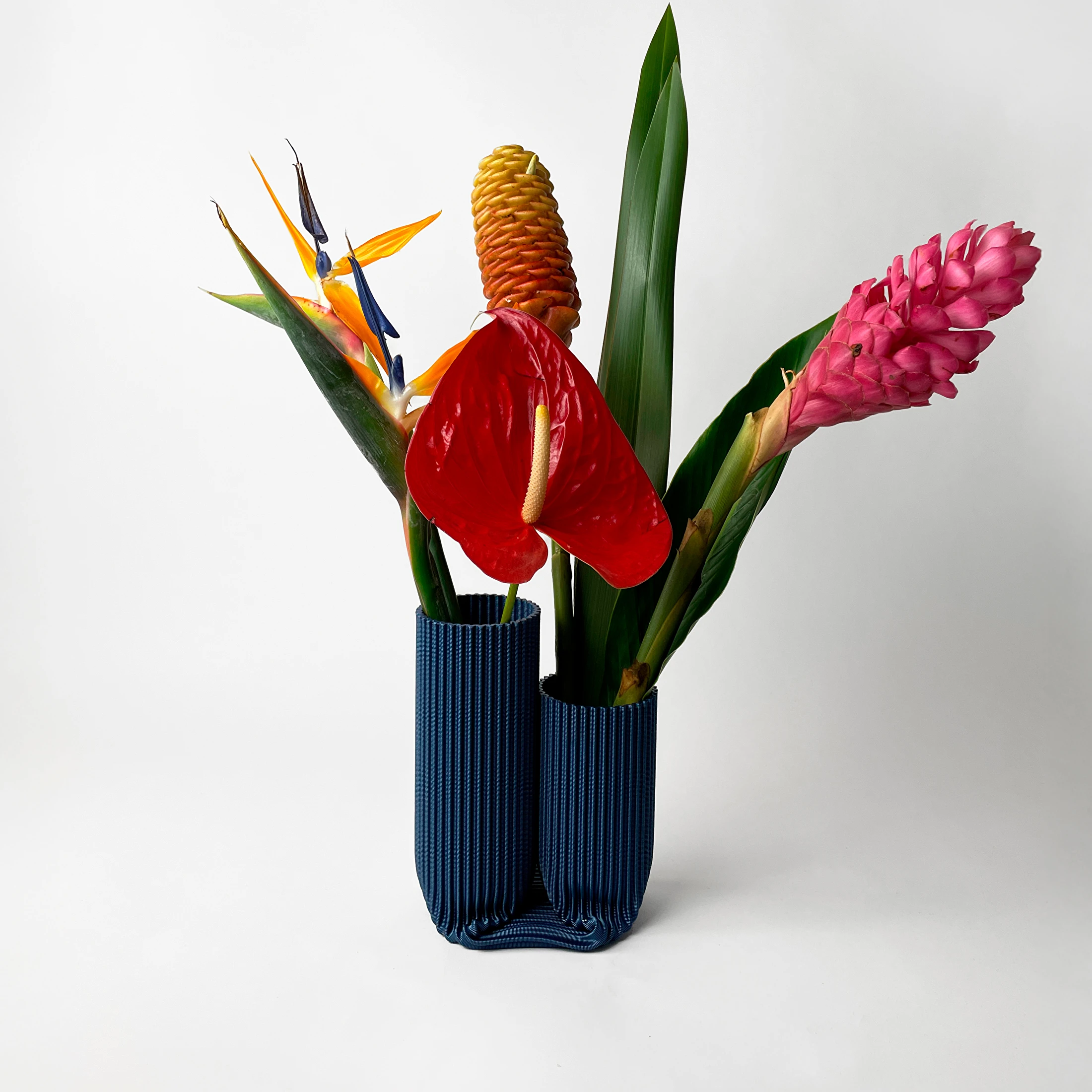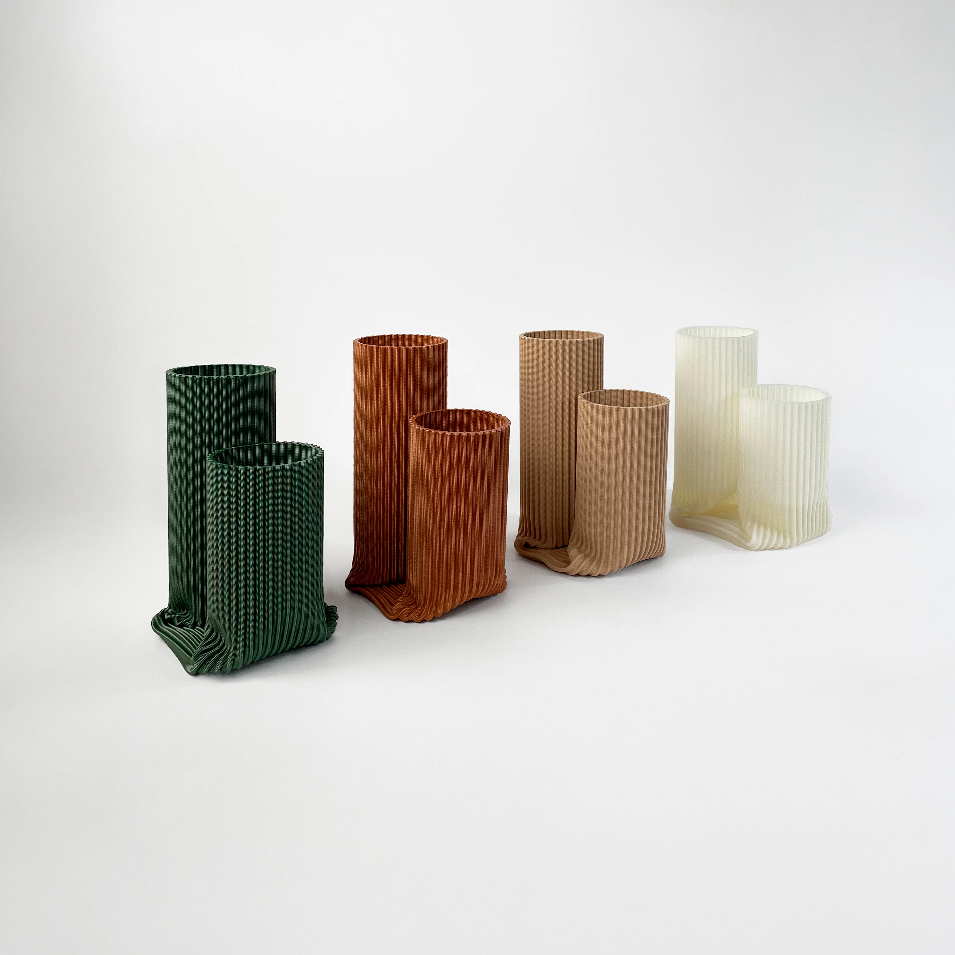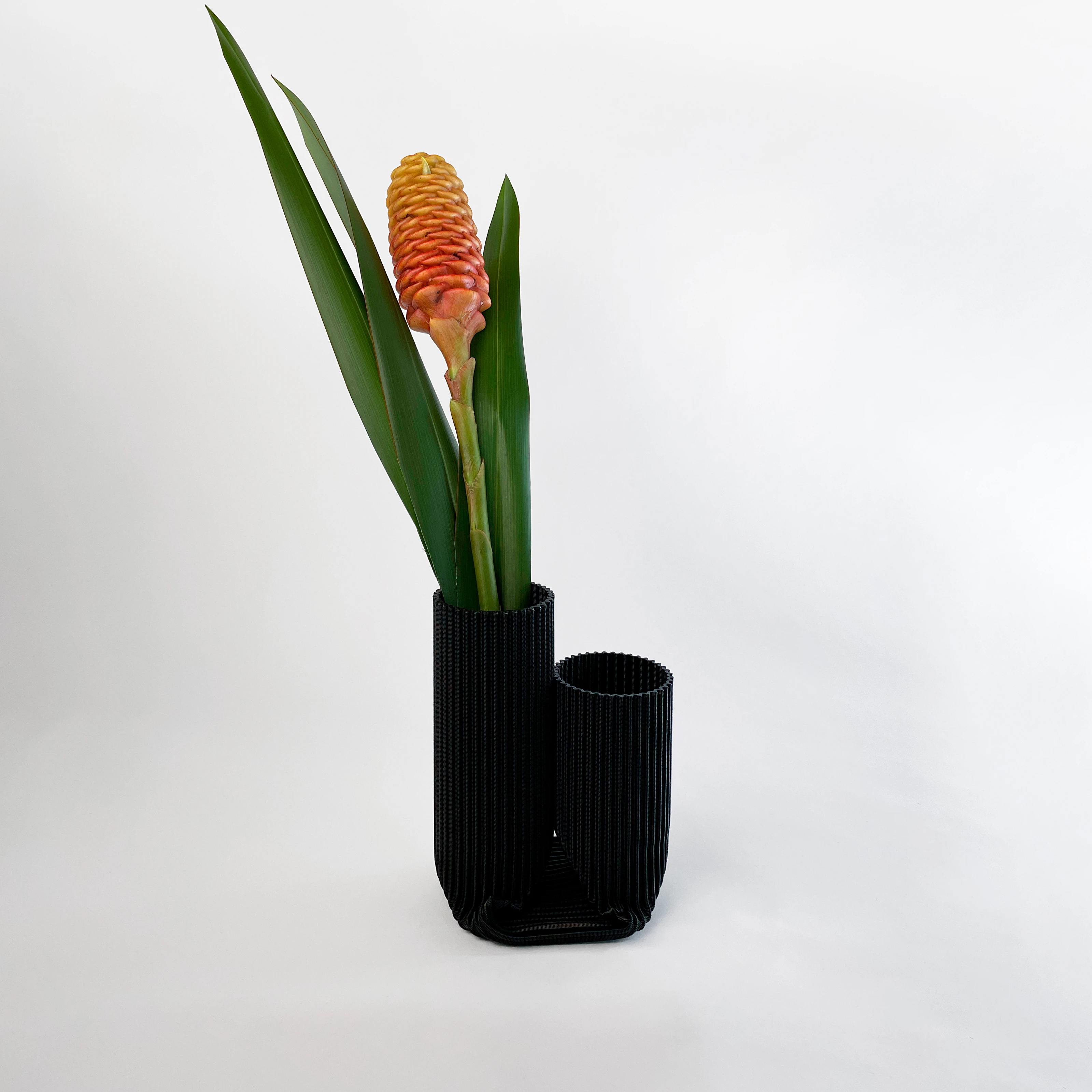 Vaso com duas bocas e textura canelada, criação exclusiva É Pedra Ateliê. Produto feito com impressão 3D em bioplástico e dobrado manualmente. Cada peça é única, modelada pelas mãos de artistas.